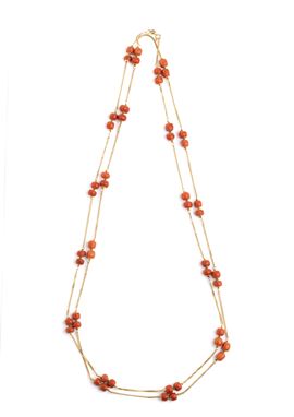 con catena in oro giallo 18k interrotta da barilotti di corallo rosso del Mediterraneo (Corallium Rubrum).