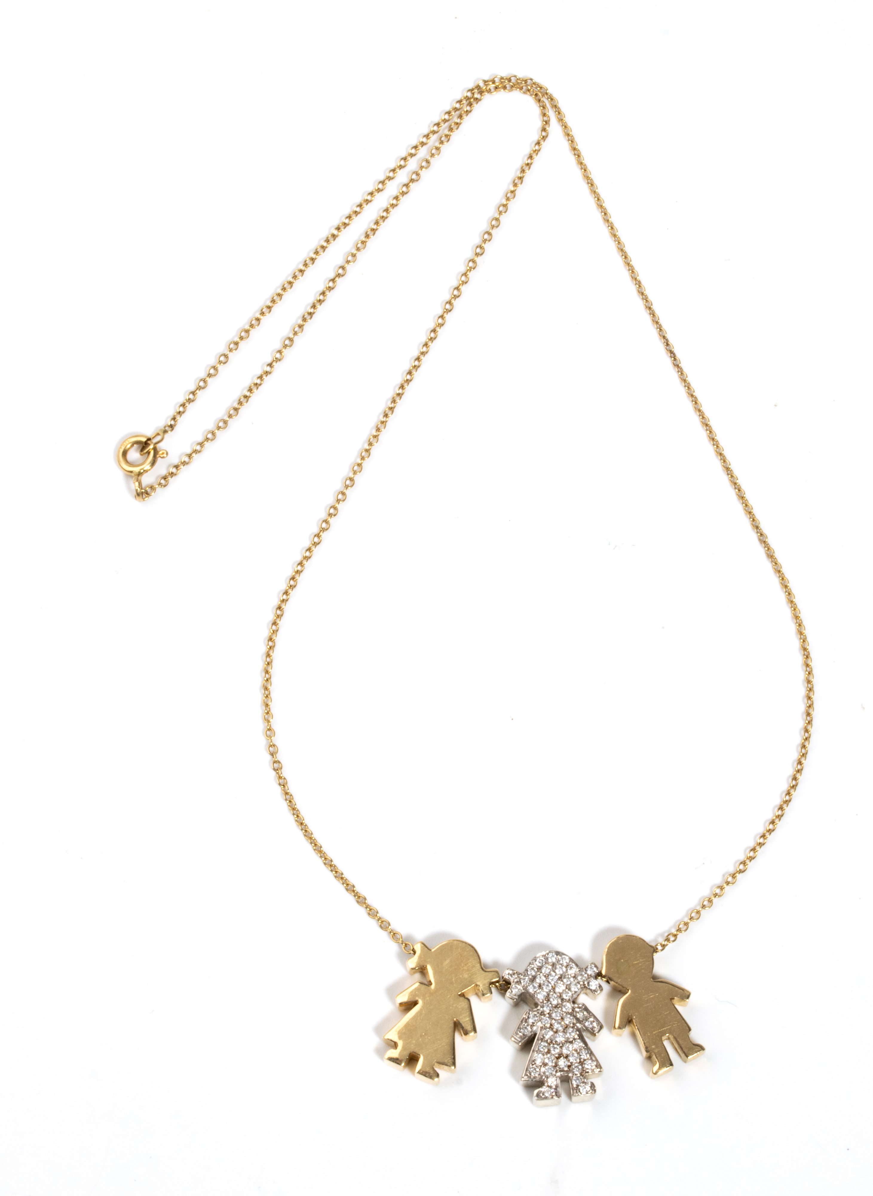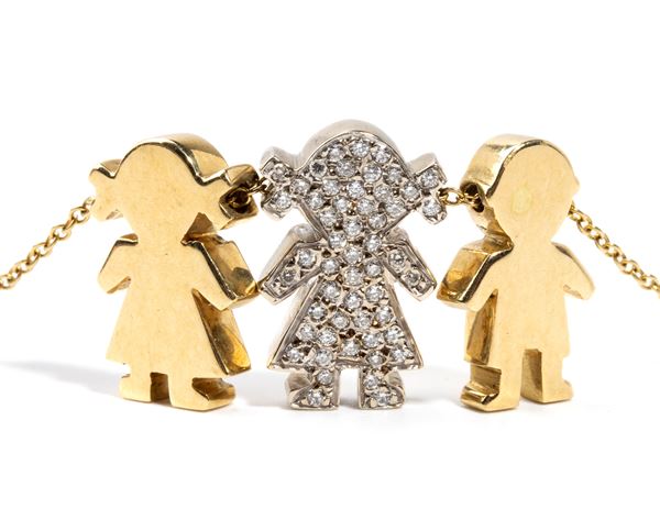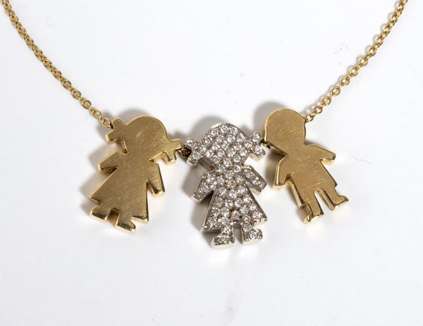 in oro giallo 18k, con sottile catena a cui sono sospesi una coppia di pendenti raffiguranti le sagome stilizzate di bambine di cui una incastonata con pavé di diamanti di forma rotonda, taglio brillante, stimati per un peso totale di circa 0.50 ct, colore G-H, purezza VS.