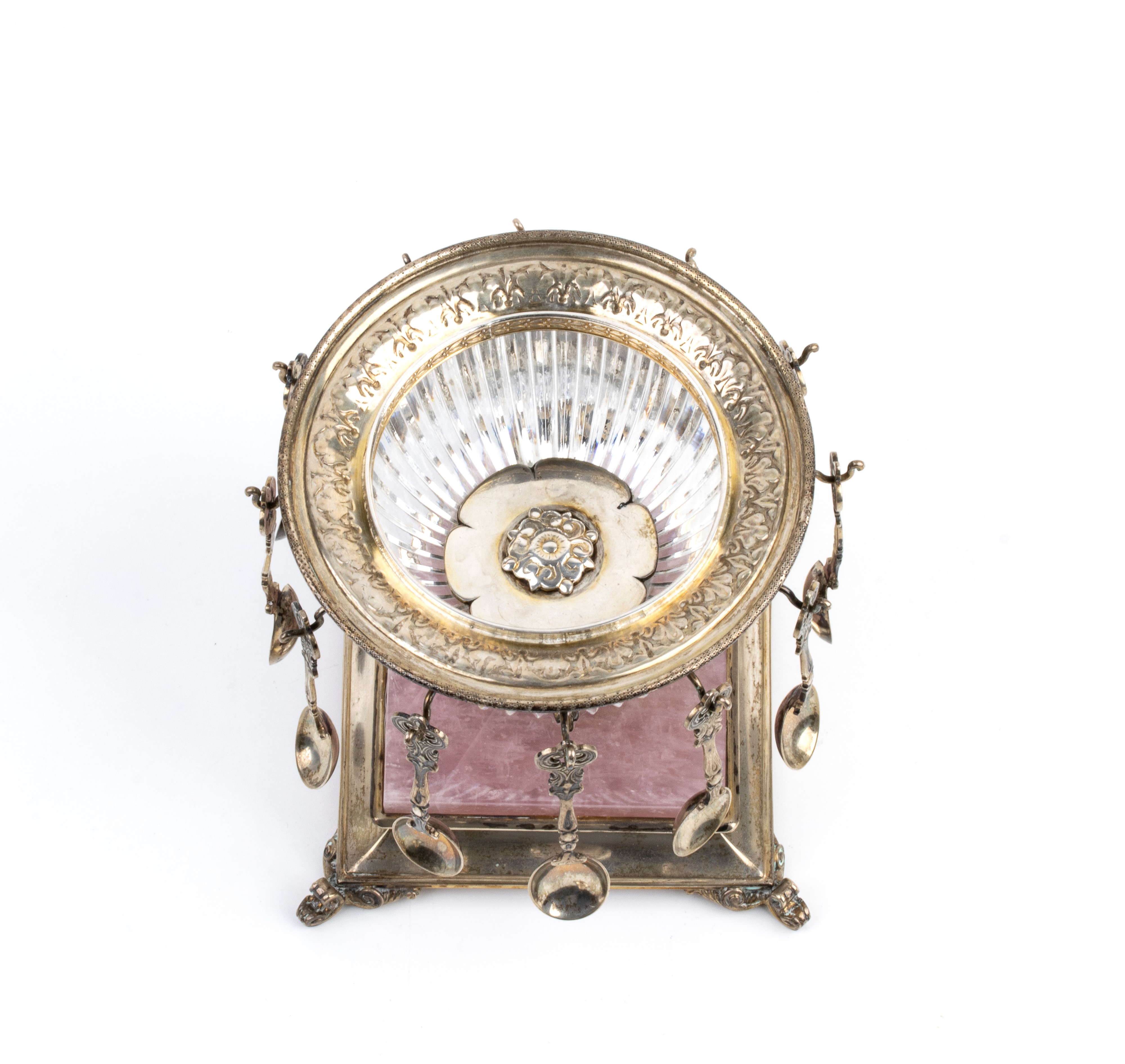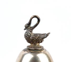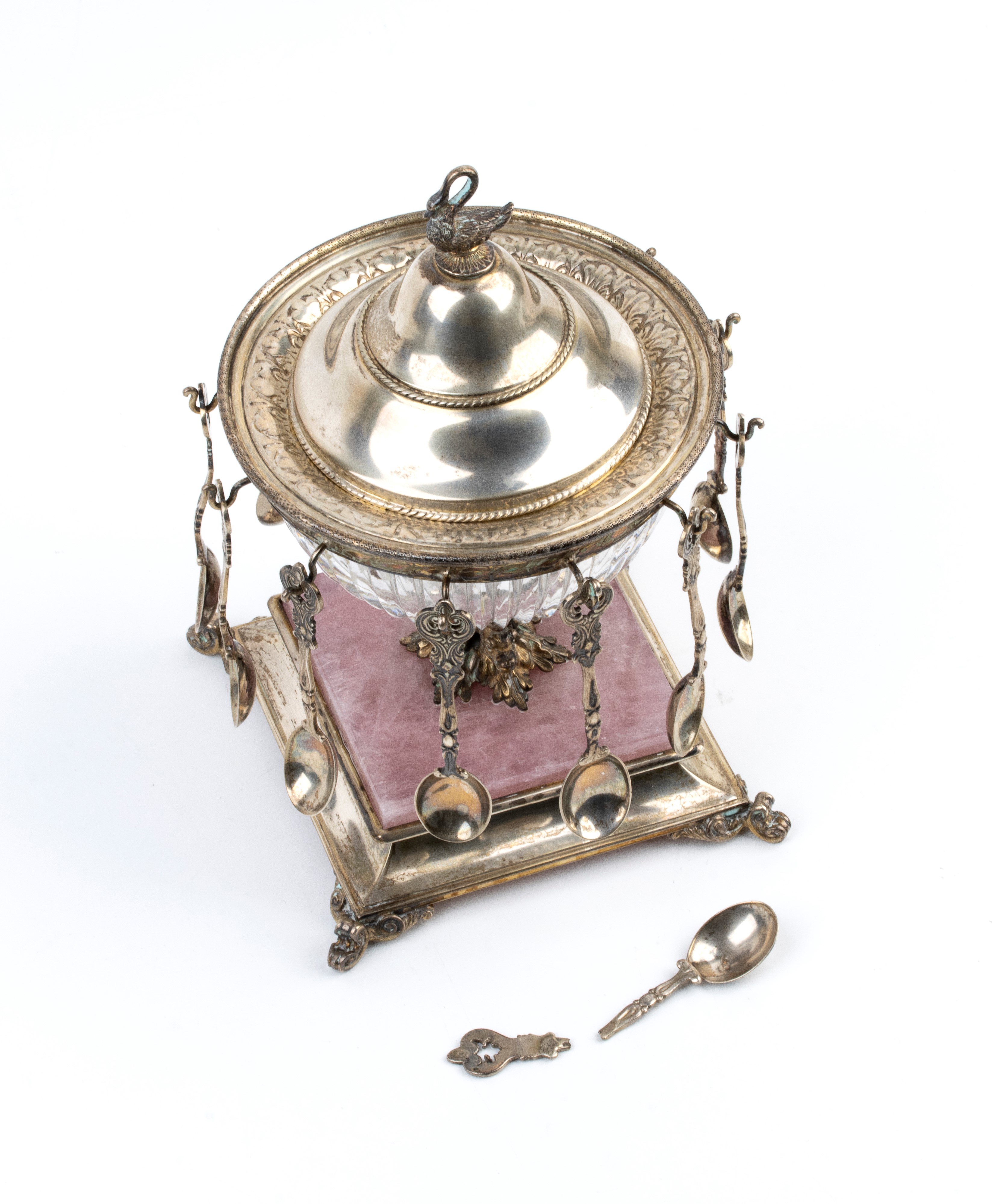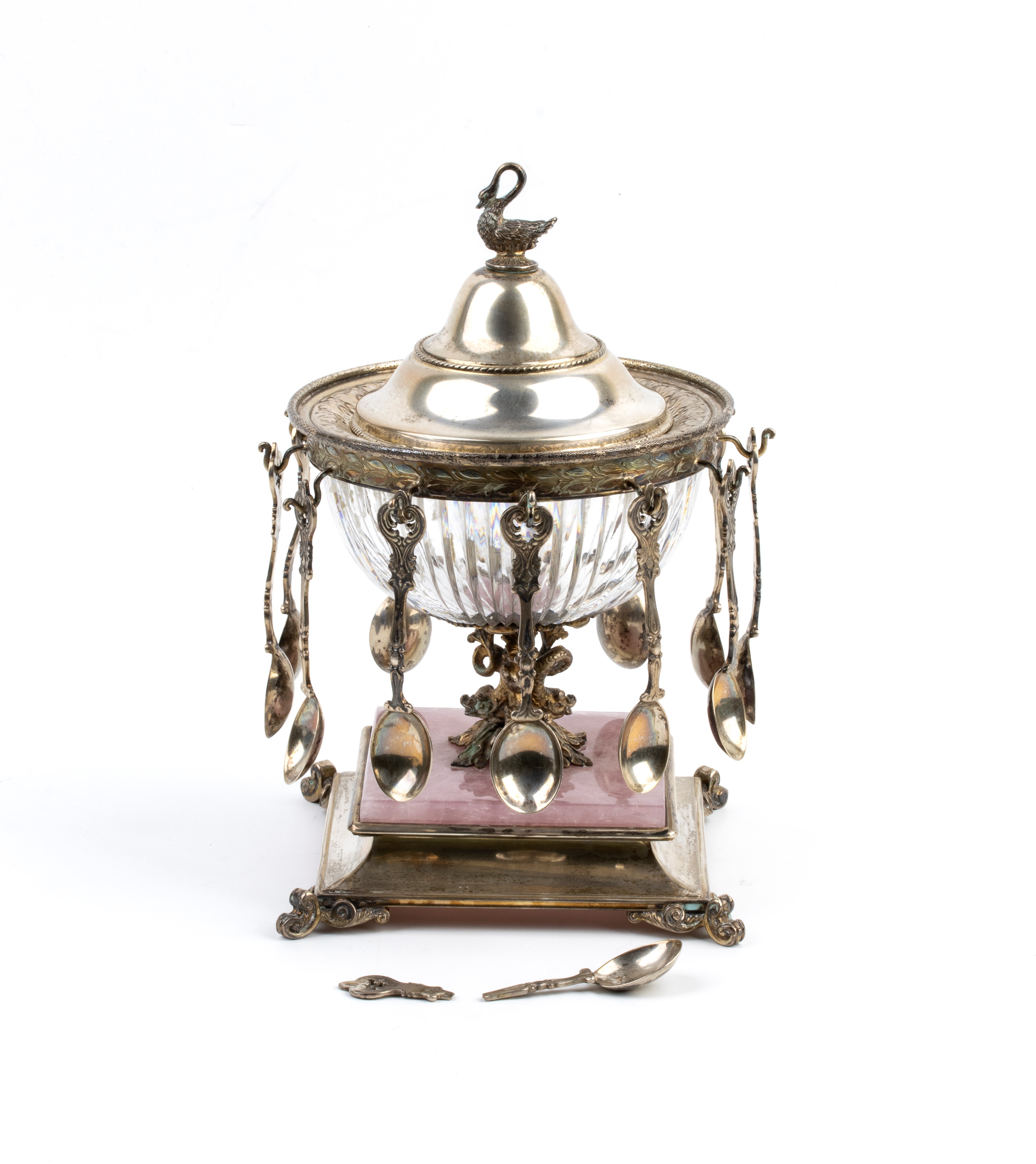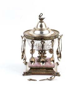 Coperchio in argento, fortemente duomato con una linea sobria ma elegante, impreziosito da una presa figurata a forma di cigno, elemento molto ricorrente nel gusto Liberty o tardo eclettico. Fusto centrale fuso con motivi vegetali e volute, che collega la coppa alla base in marmo rosa e argento con piedini mossi e sagomati. Completano il lotto 12 cucchiaini.