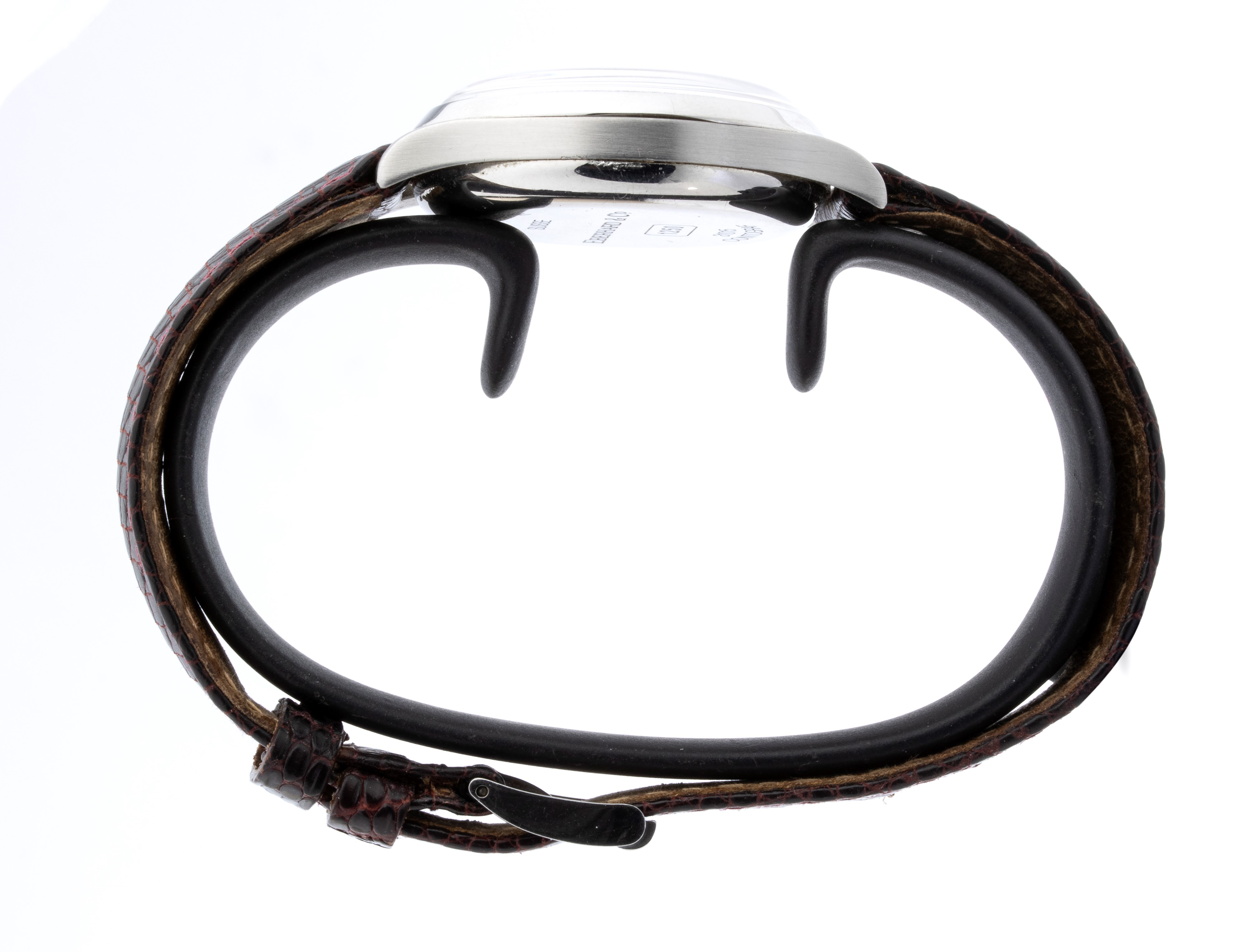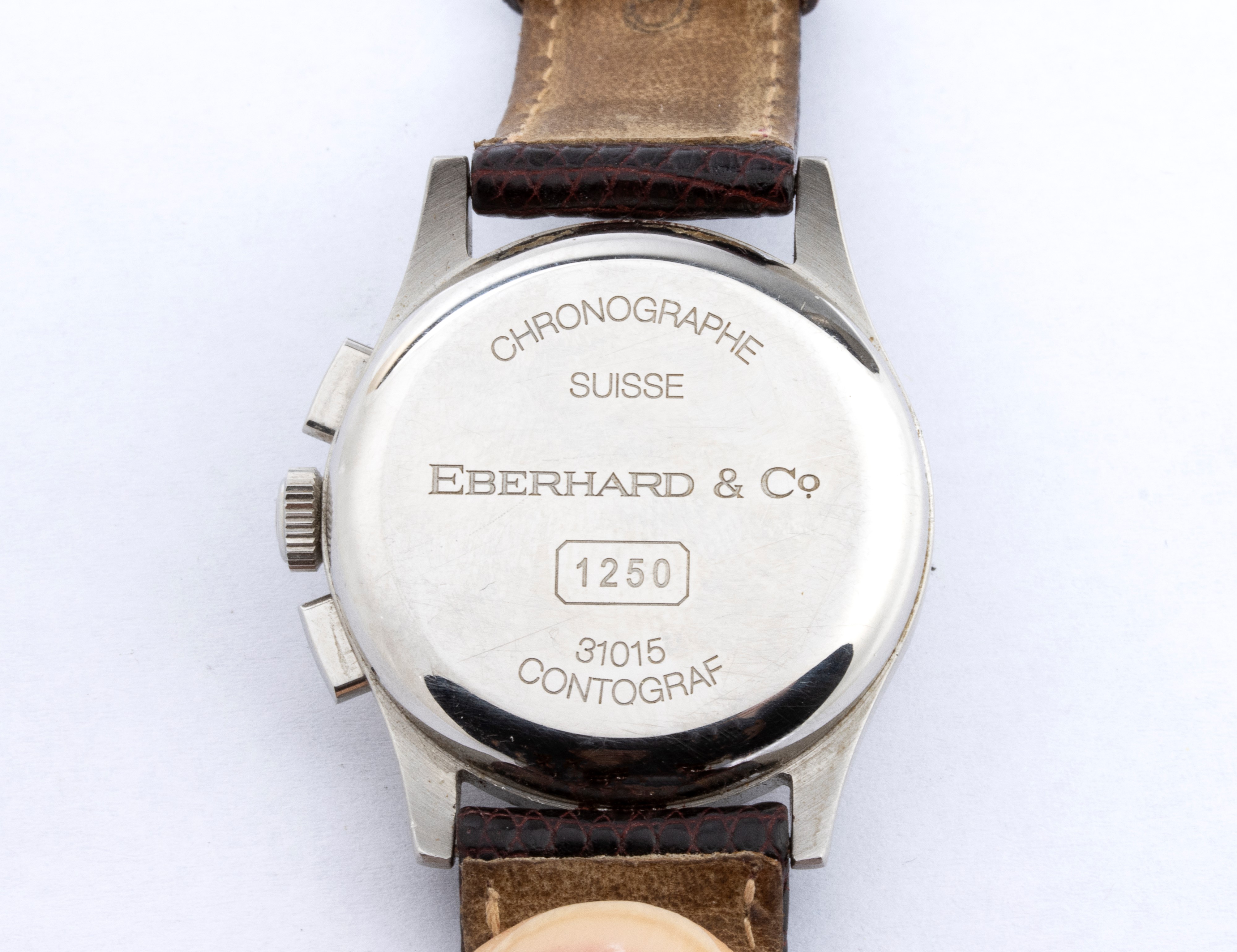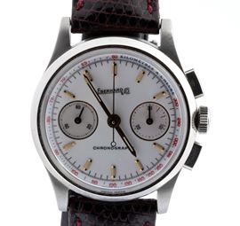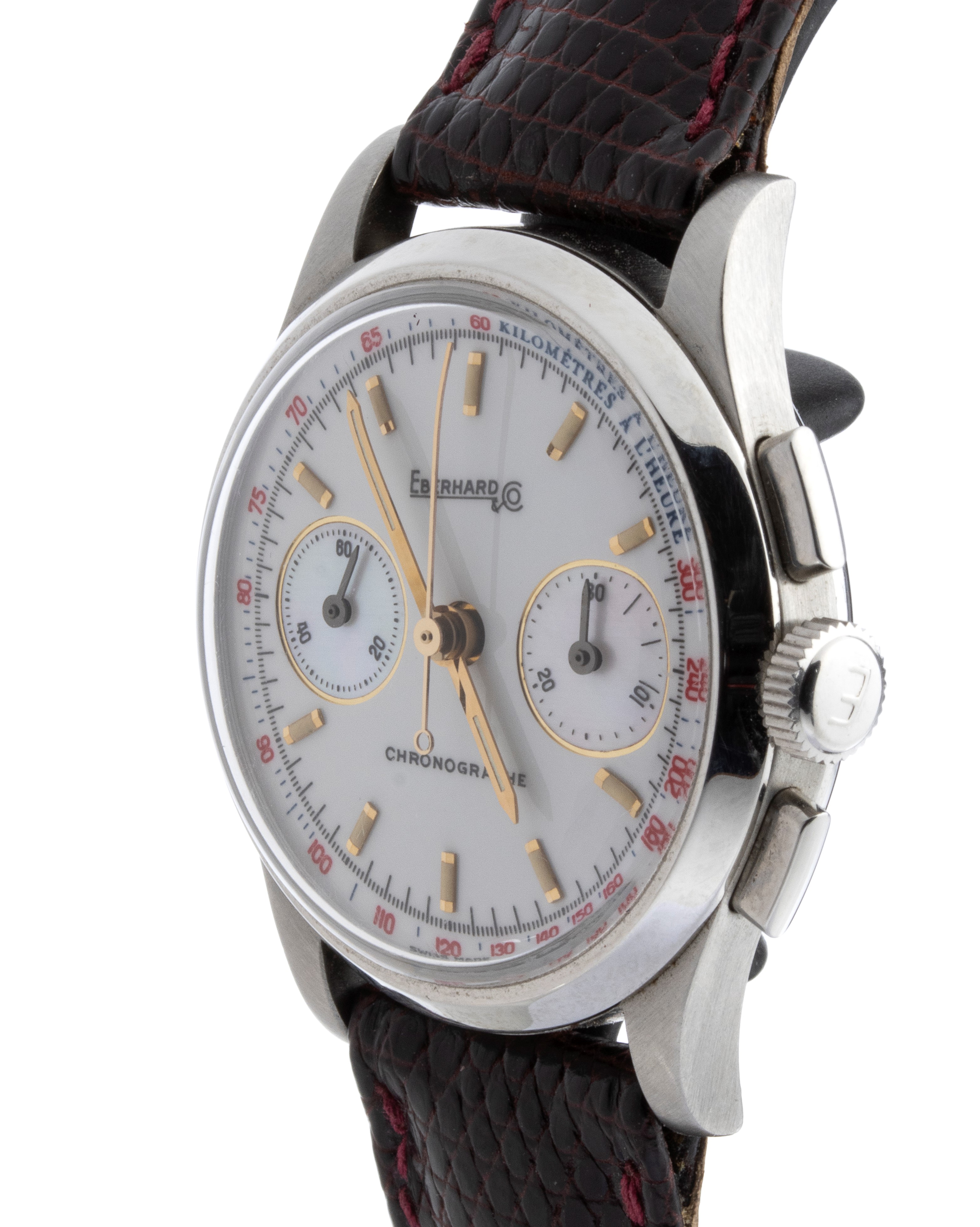 con cassa in acciaio, quadrante a 3 contatori bianco e scala tachimetrica rossa e blu. Movimento meccanico manuale.