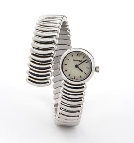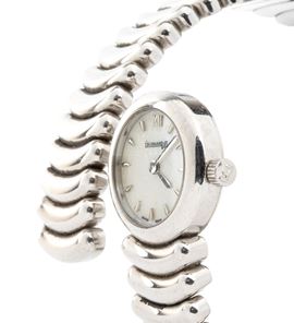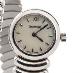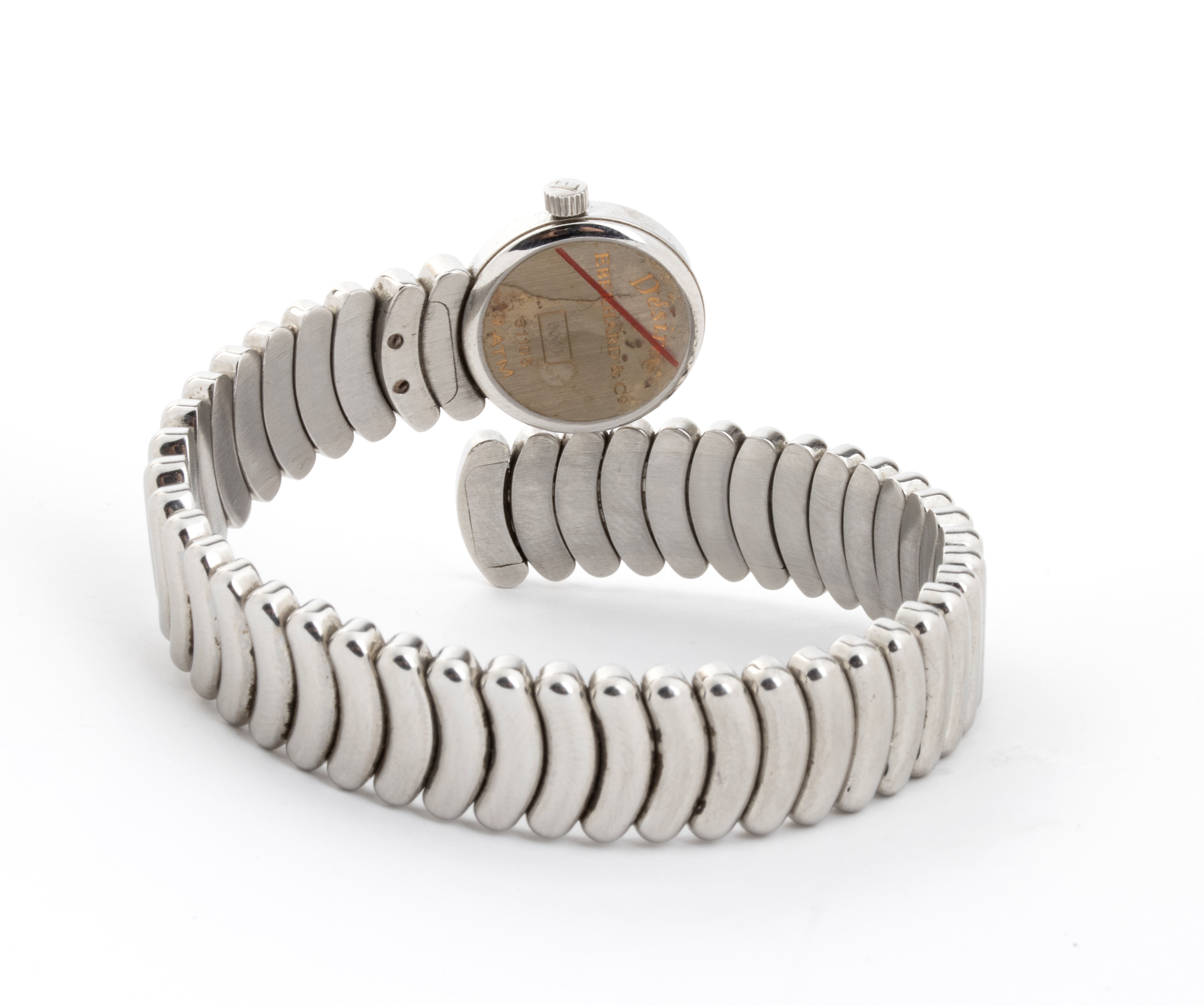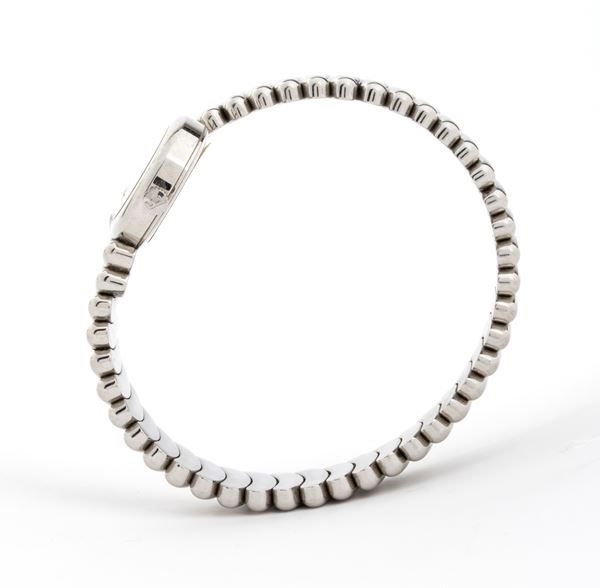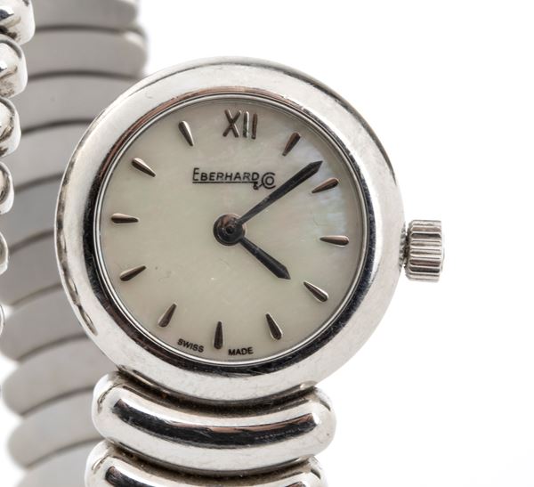 con cassa e bracciale elastico integrato in acciaio, quadrante madreperla. Movimento al quarzo. Corredato di scatola.