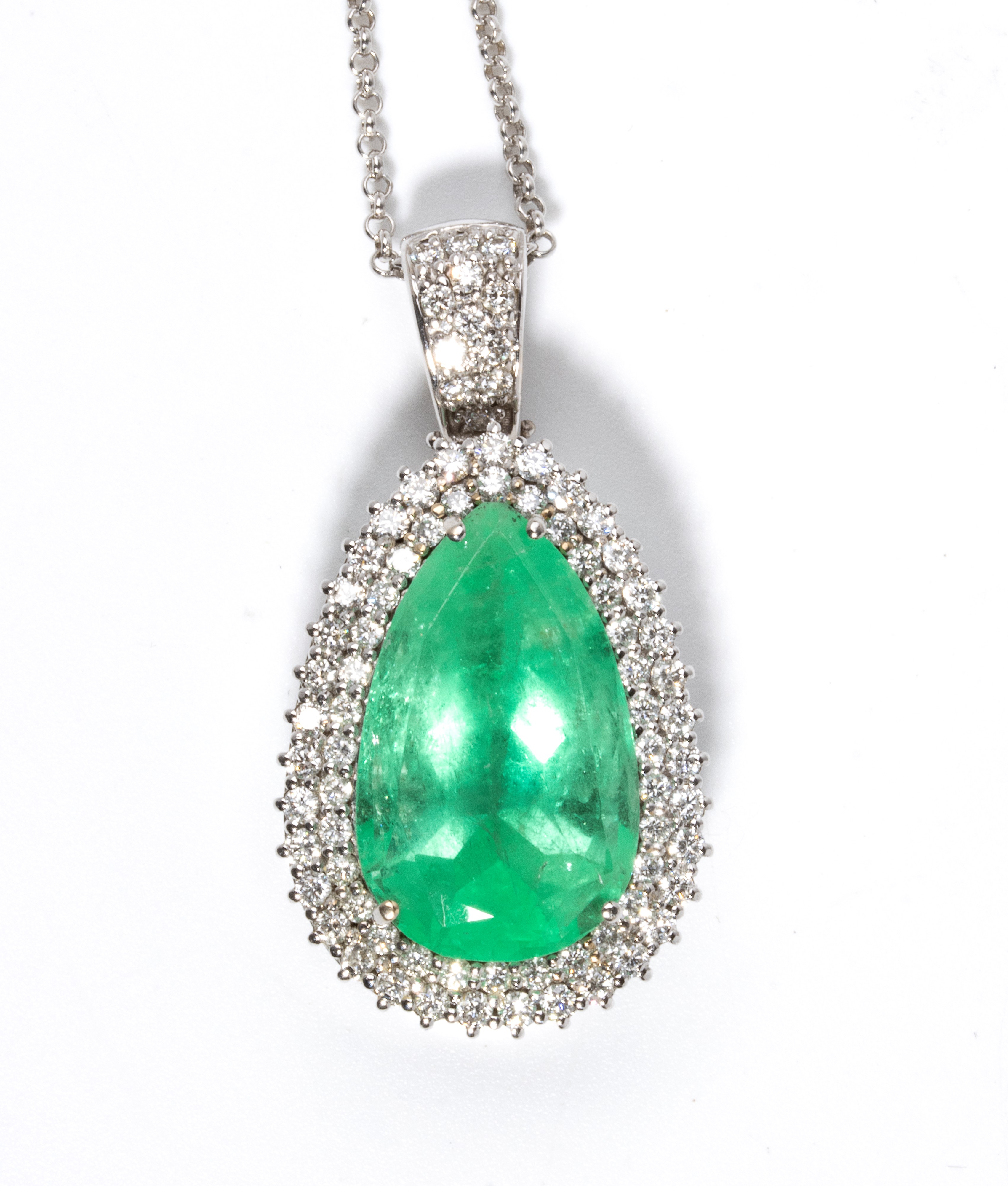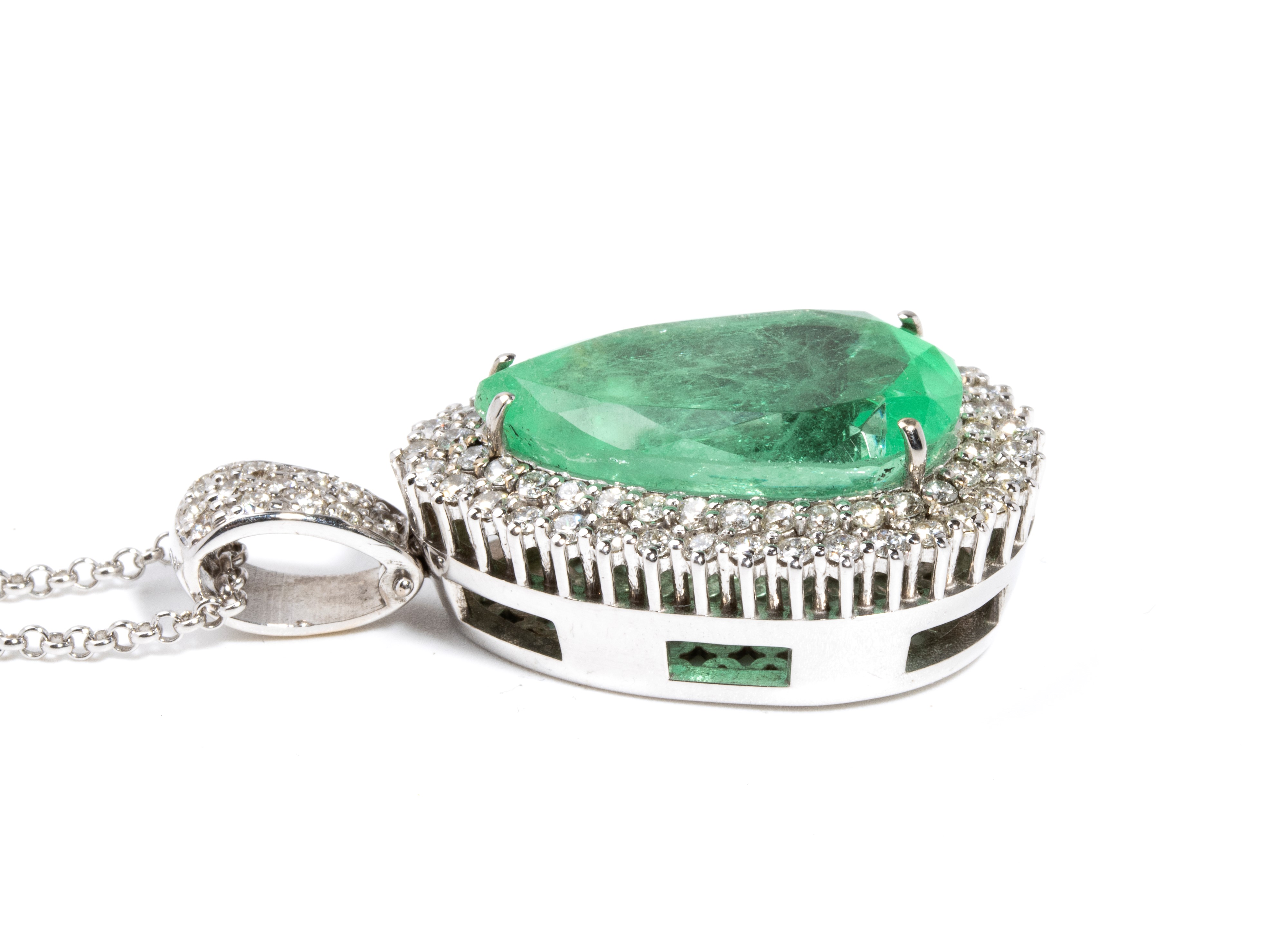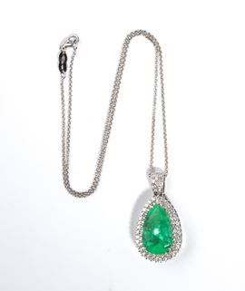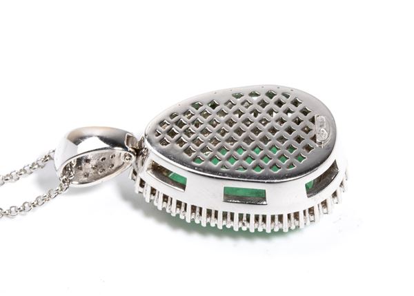 in oro bianco 18k, con sottile catena a maglia rolò a cui è sospeso un pendente incastonato con goccia di smeraldo incorniciata da diamanti.