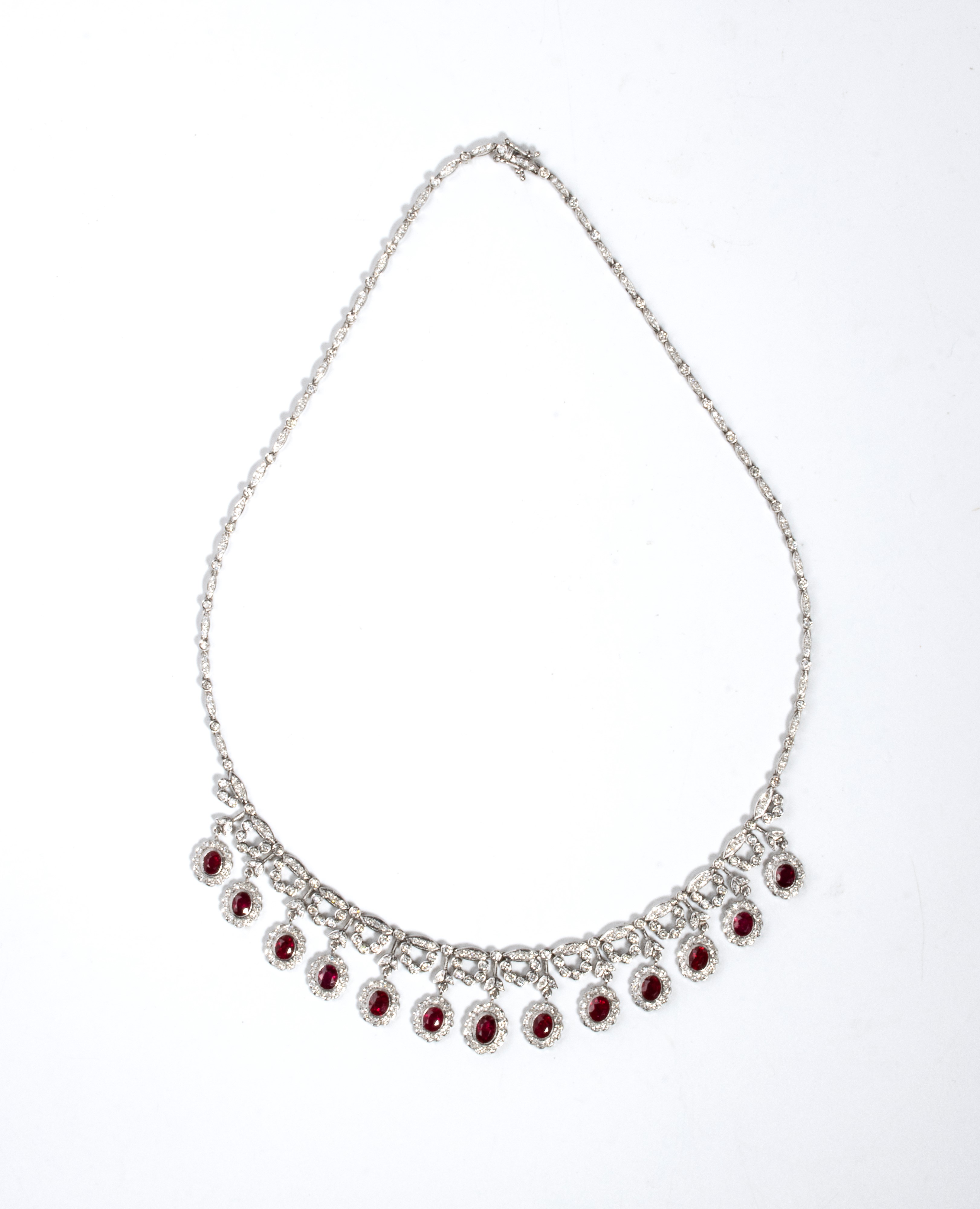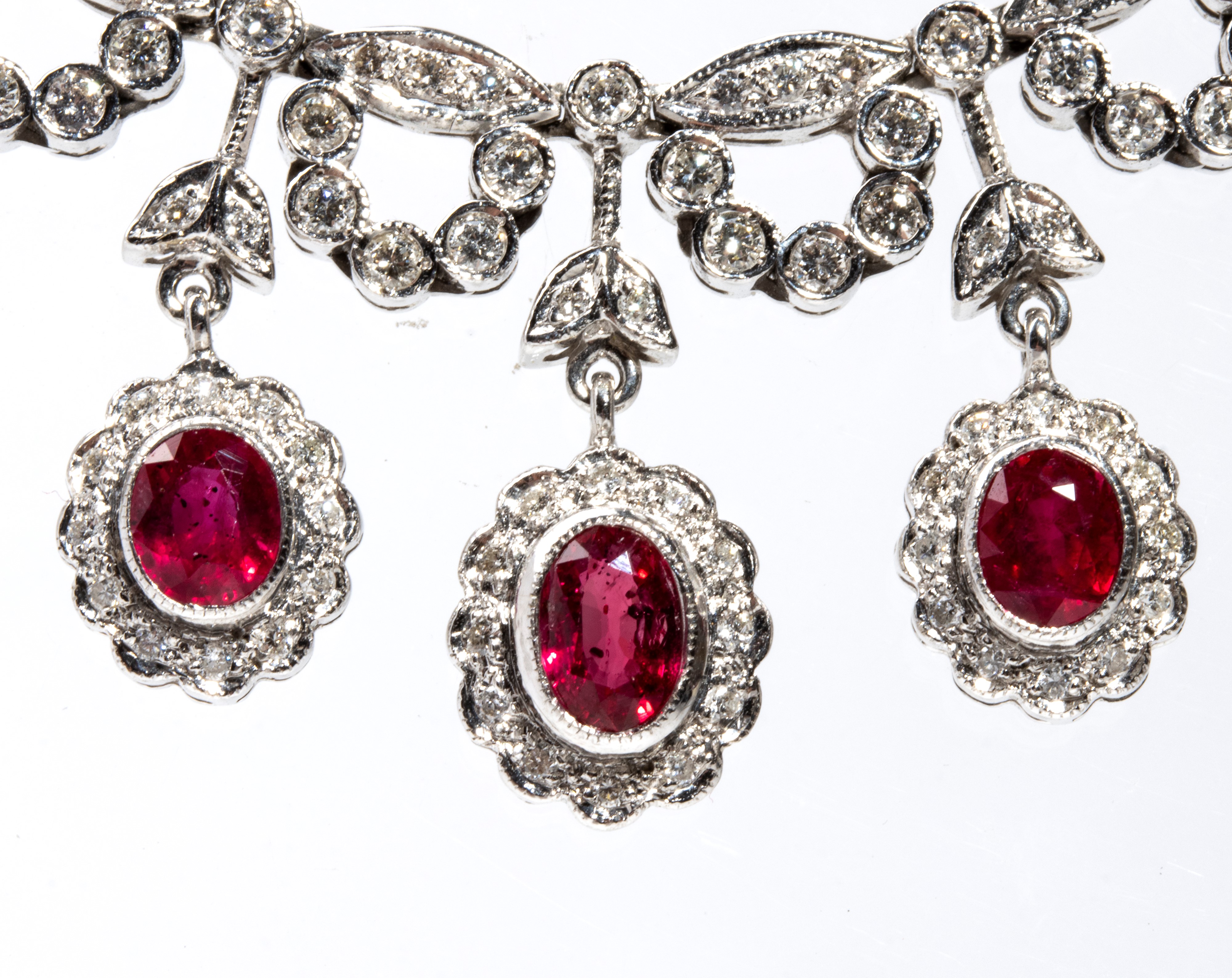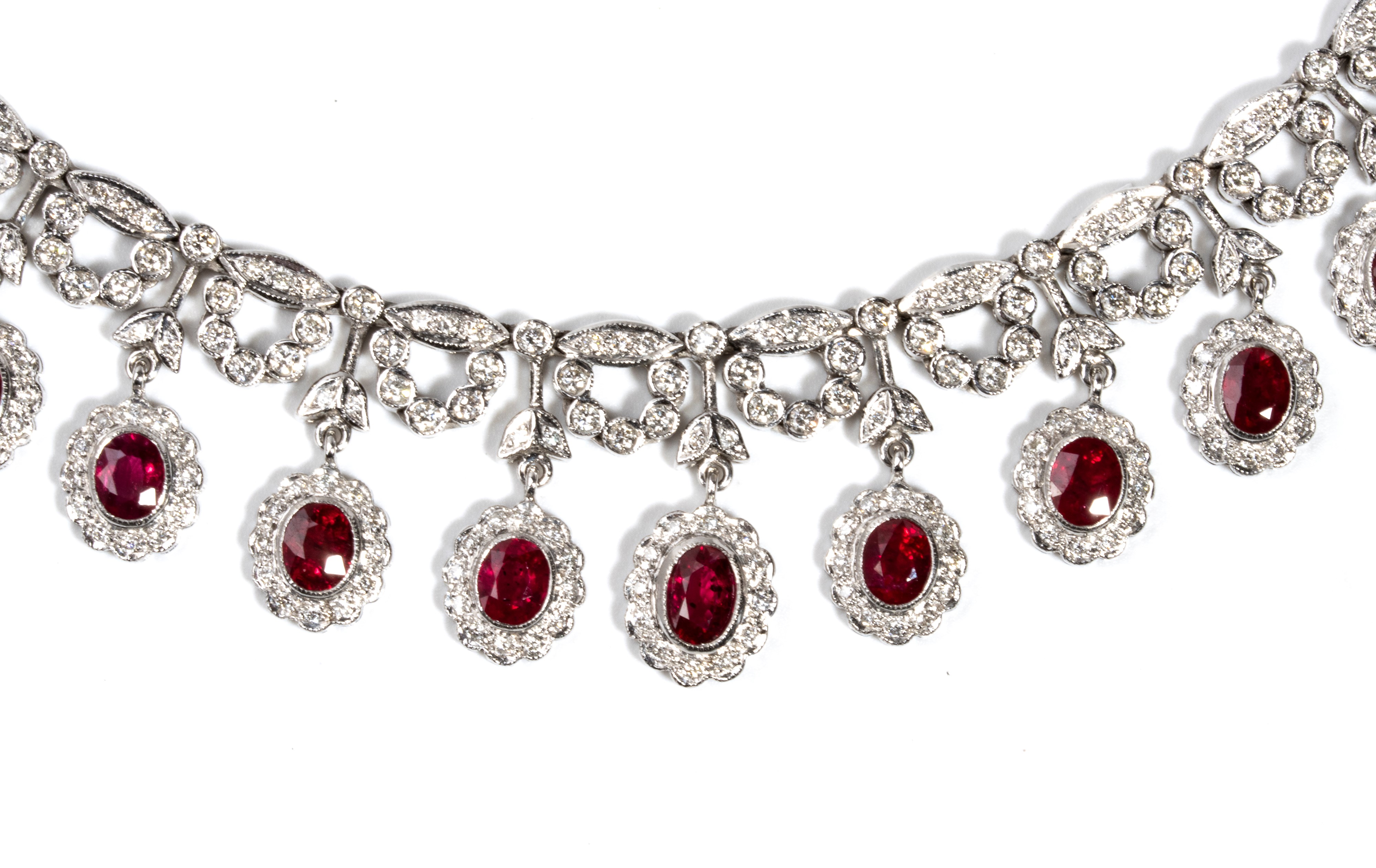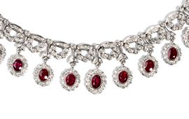 in oro bianco 18k, caratterizzato da un importante disegno a frangia con alternanza di motivi floreali in rubini e diamanti.
