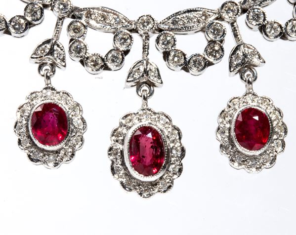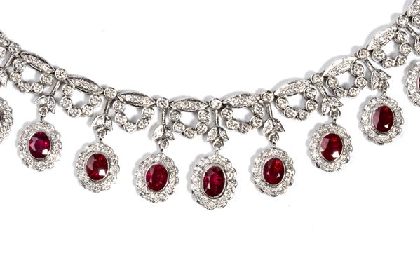 Diamanti di forma rotonda, taglio brillante, stimati per un peso totale di circa 3.90 ct, colore G-H, purezza VS-SI e n. 13 rubini di forma ovale, taglio composito, per un peso totale stimato di circa 7.20 ct, come misurati e classificati nella montatura.