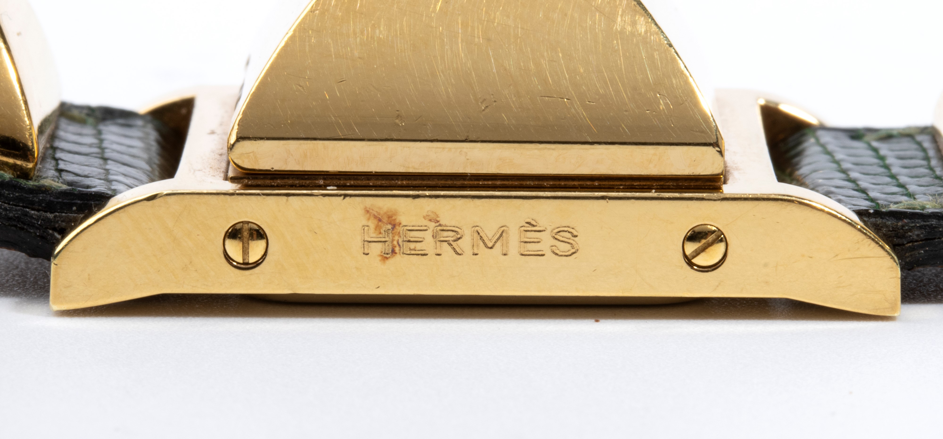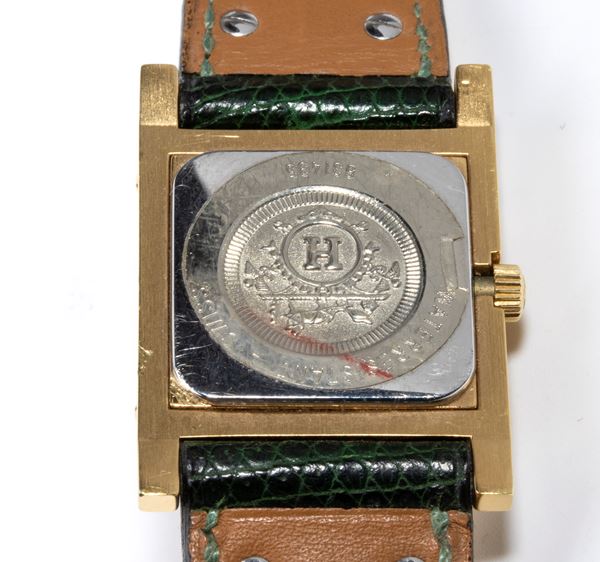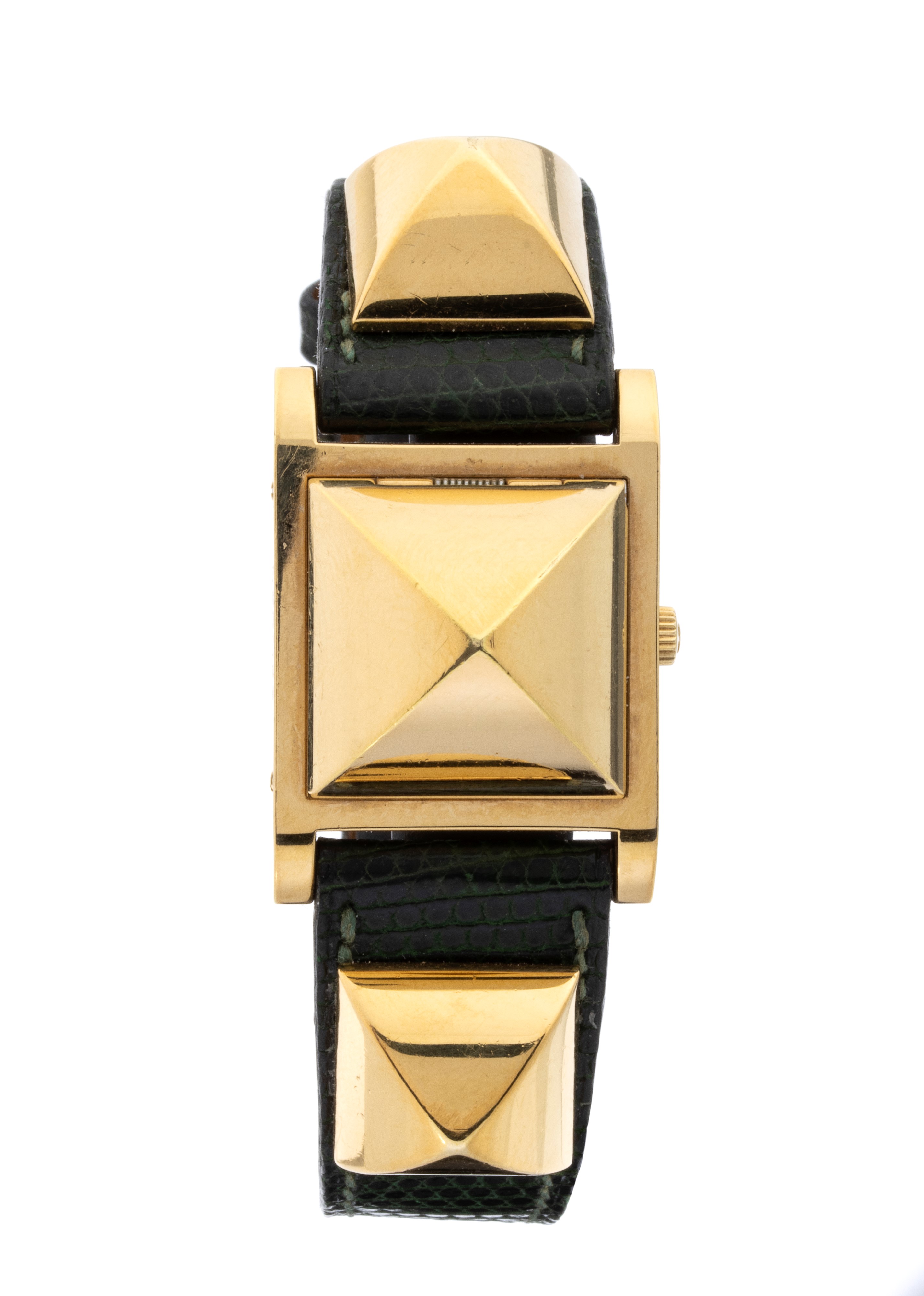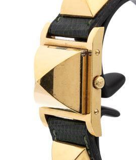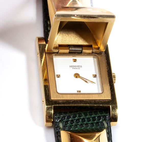 con cassa e parti del cinturino in metallo dorato, apertura del coperchio a molla, cinturino in pelle con inserti e fibbia in metallo. Movimento al quarzo.