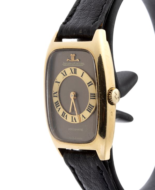 con cassa in oro 18k, quadrante beige con indici e logo a rilievo dorato, movimento meccanico automatico e cinturino in pelle con fibbia in metallo.