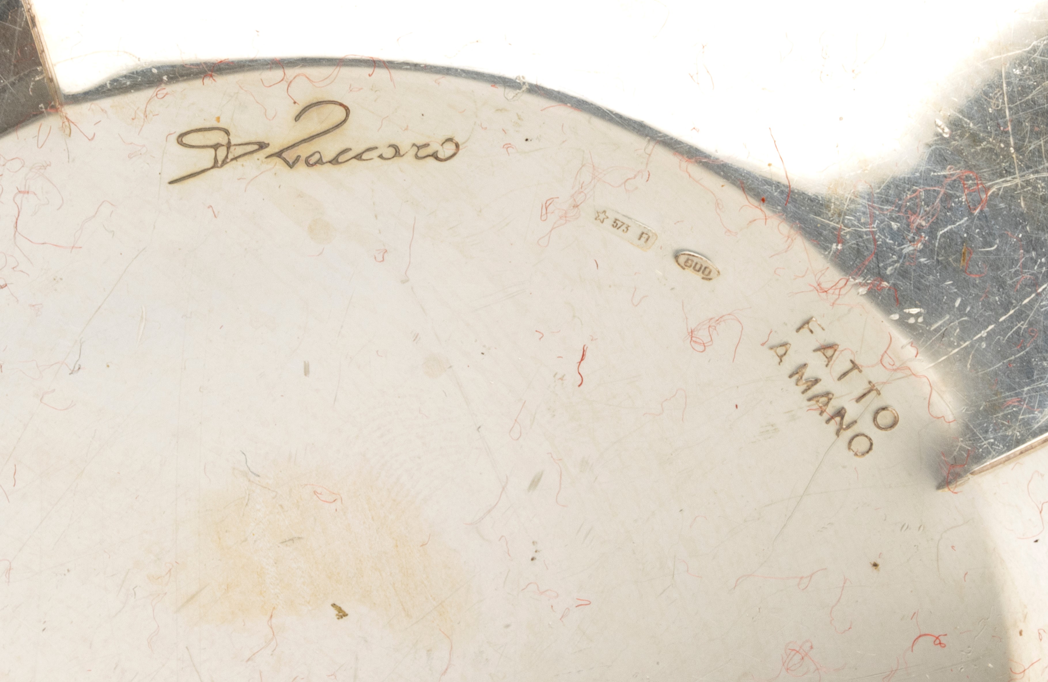 b)di forma quadrata con lati bomati. Argento 800/1000, punzonato "800 - * 573 FI - Fatto a mano". Lato 16,5 cm, peso 231 gr.