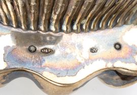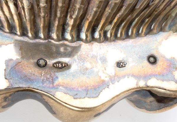 d) a forma di conchiglia. Argento 800/1000, punzonato "800 - 176 FI". 12 x 14 cm, peso 153 gr.
