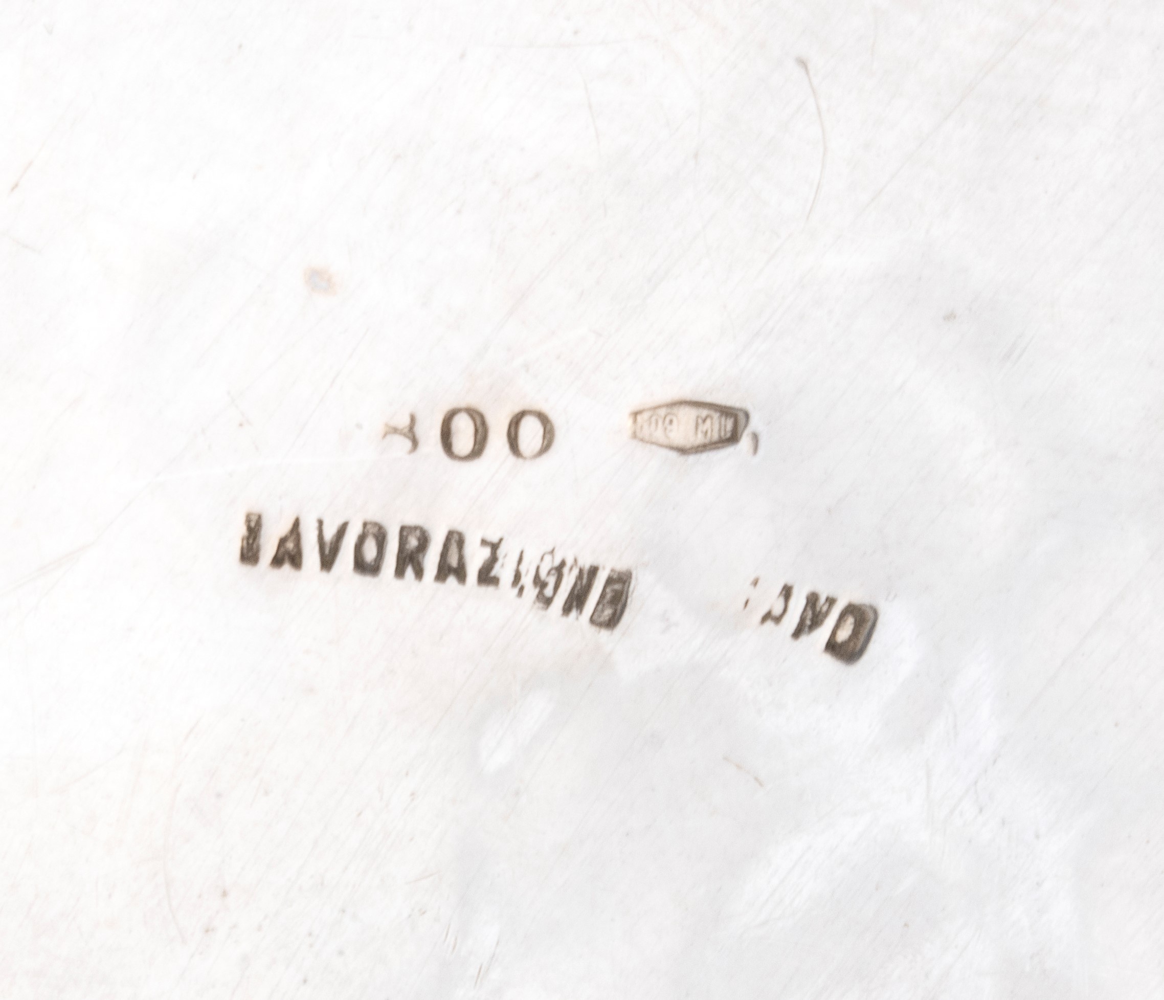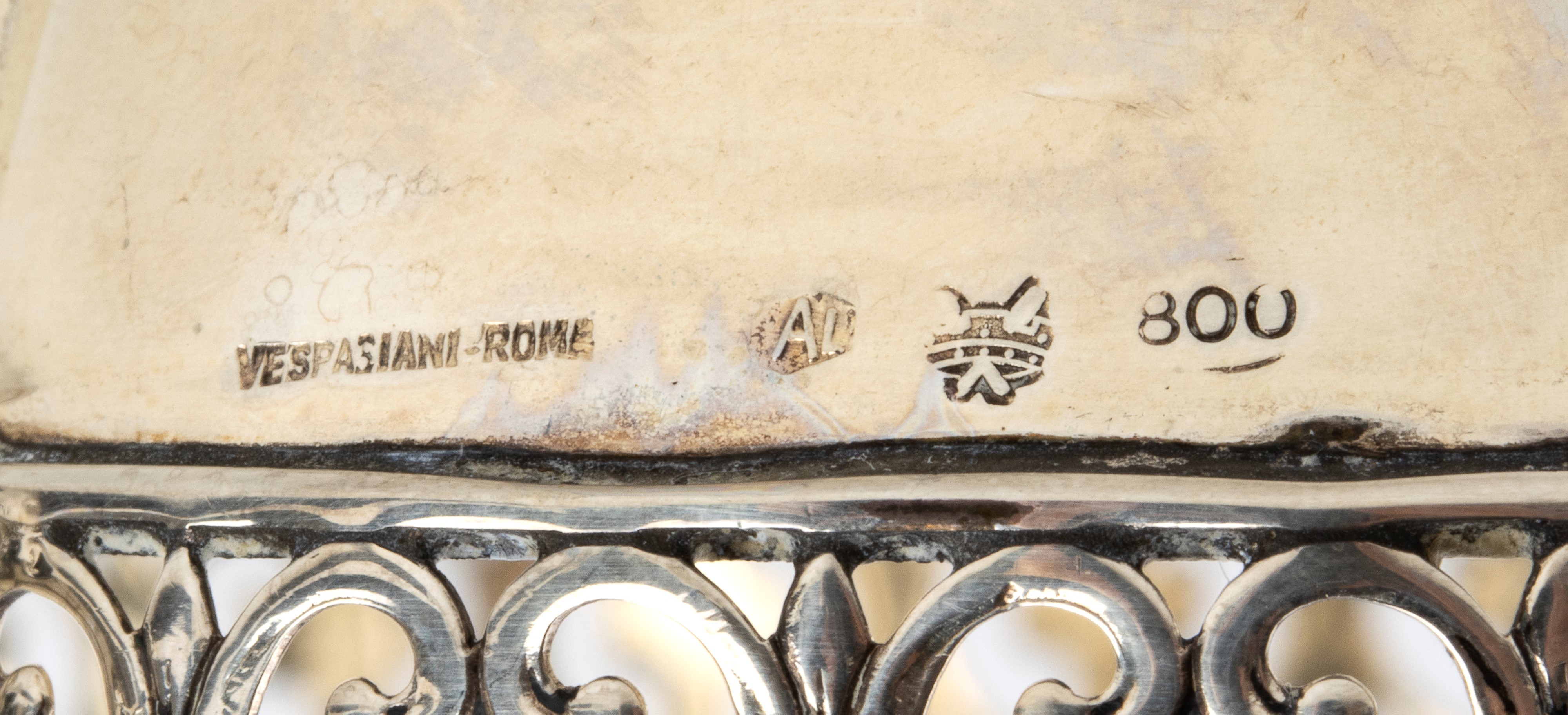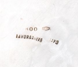 a) di forma circolare con bordo traforato. Argento 800/1000, punzonato "800 - Vespasiani Roma". Diametro 16 cm, peso 201 gr.
