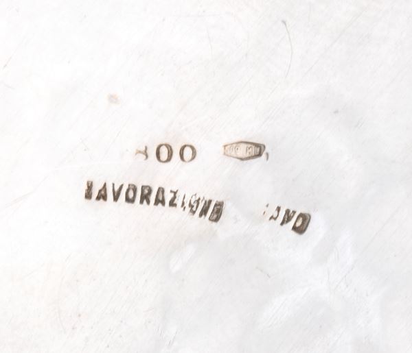 c) a forma di fiore. Argento 800/1000, punzonato "800 - 509 MI - Lavorazione a mano". Diametro 18,5 cm, peso 162 gr.