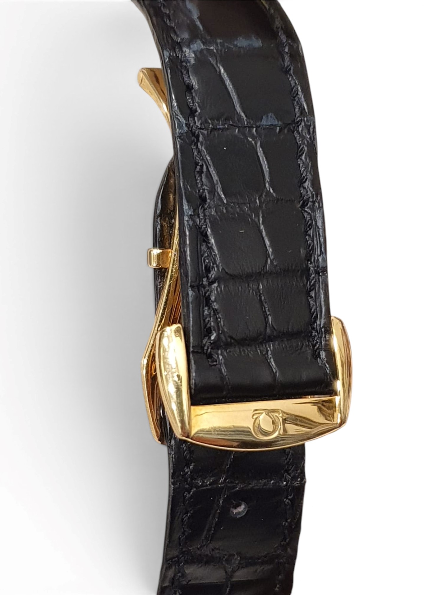 con cassa in oro, quadrante in oro a tre contatori, minuteria bianca, indici e sfere dorate, ghiera con scatola tachimetrica nera con scritte bianche, cronografia a pompa, fondello a vite e fibbia deployante in oro. Movimento cronografico a carica manuale.