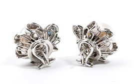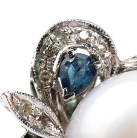in oro bianco 18k, a motivo floreale, con perla coltivate contornata da diamanti taglio huit-huit, taglio a rosa e  zaffiri.