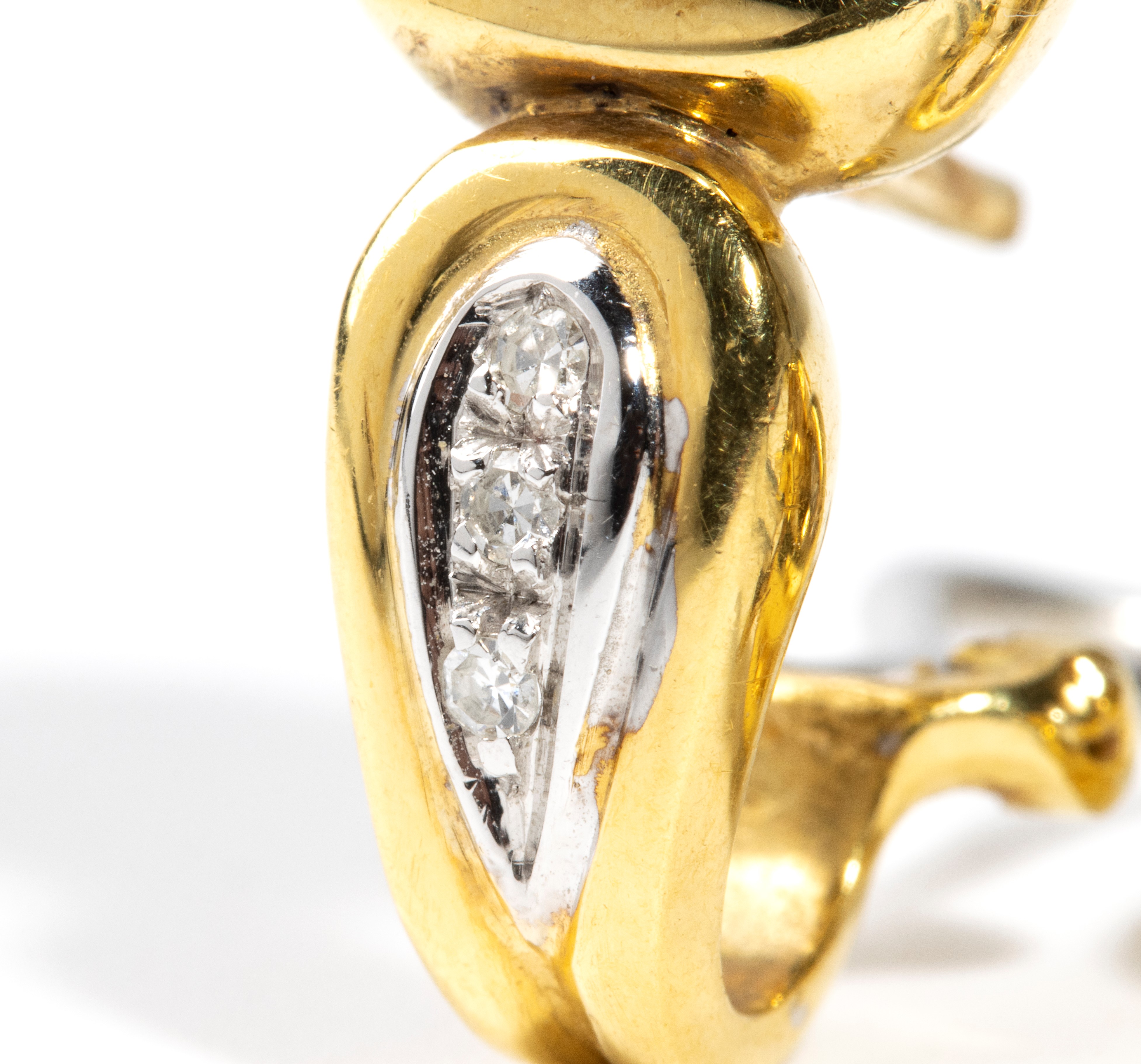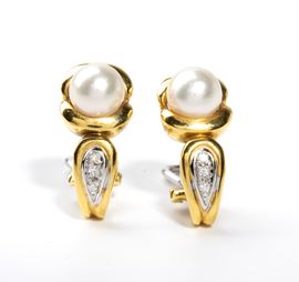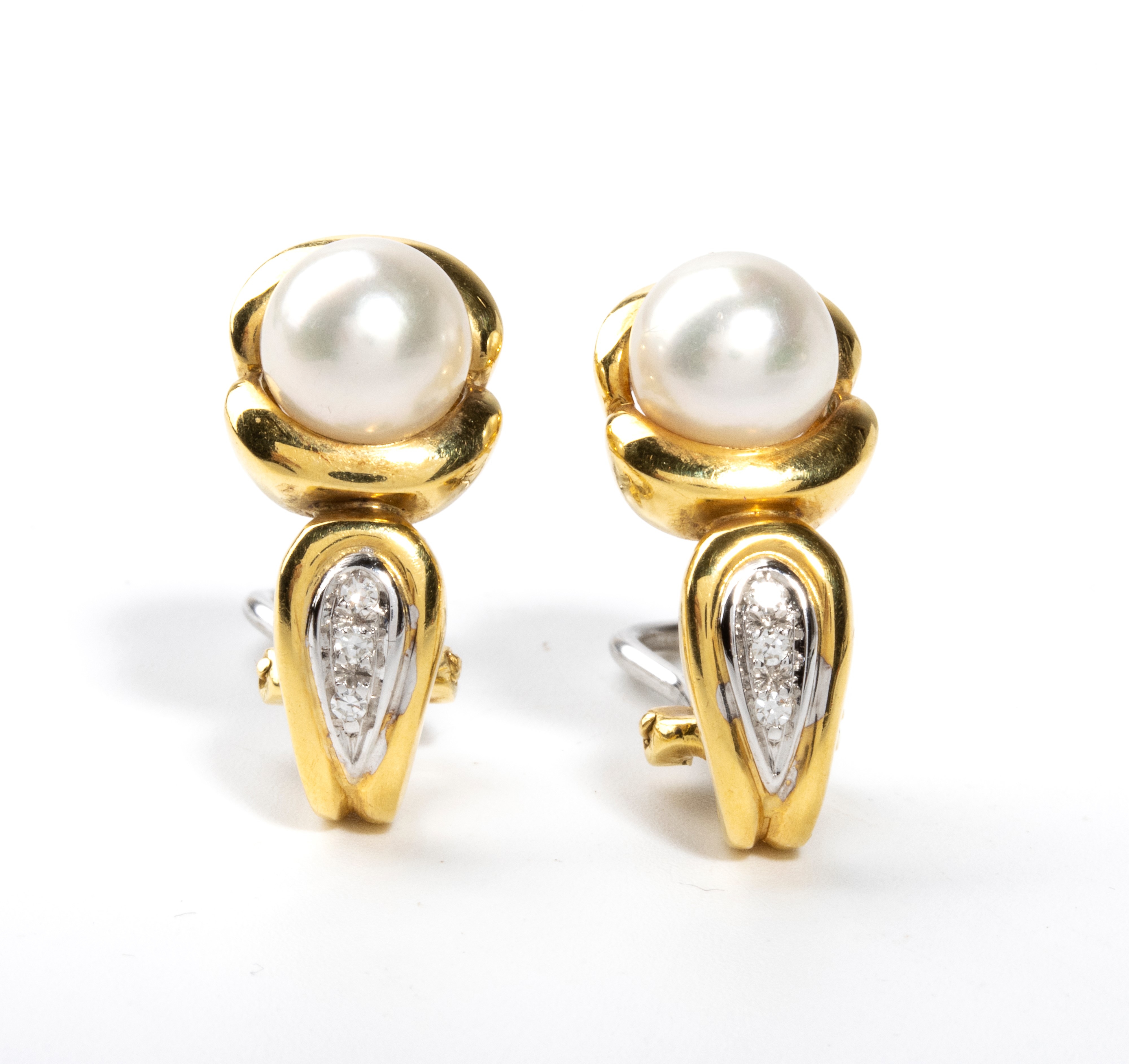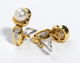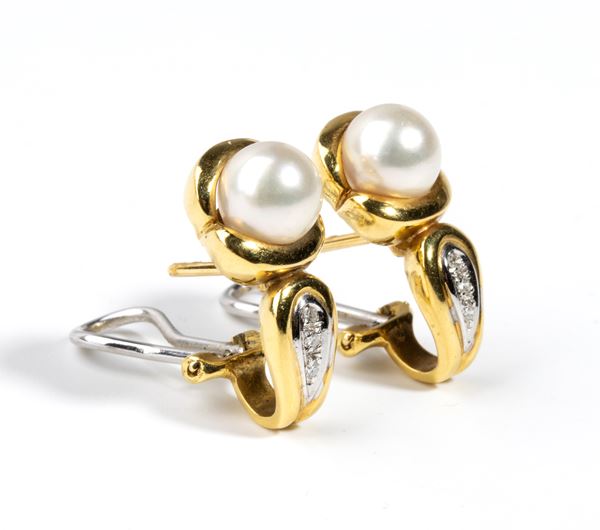 in oro giallo 18k, con perla coltivata d'acqua salata sormontata da diamanti di forma rotonda, taglio huit-huit, stimati per un peso totale di circa 0.12 ct, colore G-H, purezza VVS.