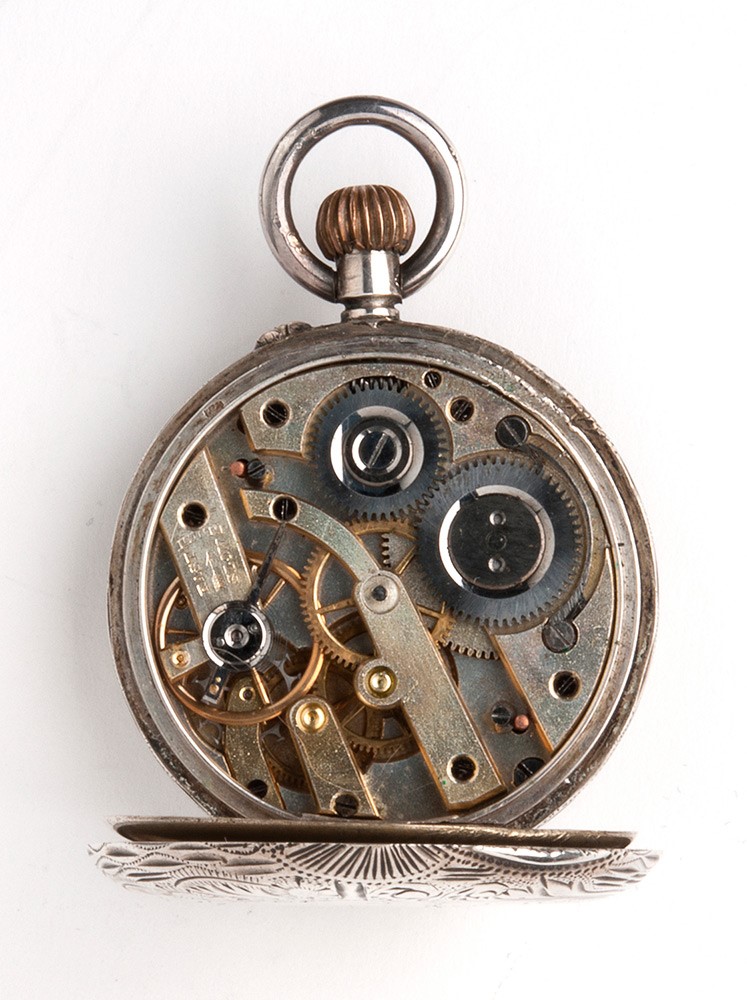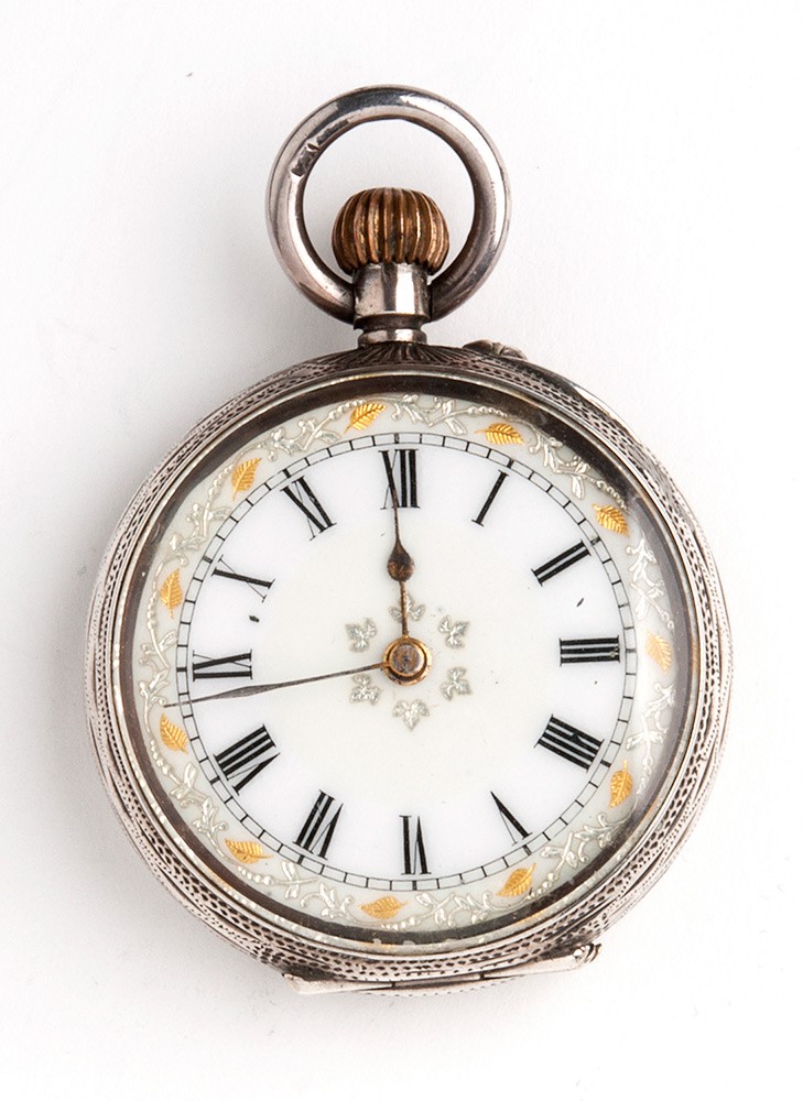 cassa in argento 800/1000, decorata con incisioni floreali e cartiglio centrale, quadrante in smalto bianco con numeri romani, movimento a cilindro con carica a remontair.