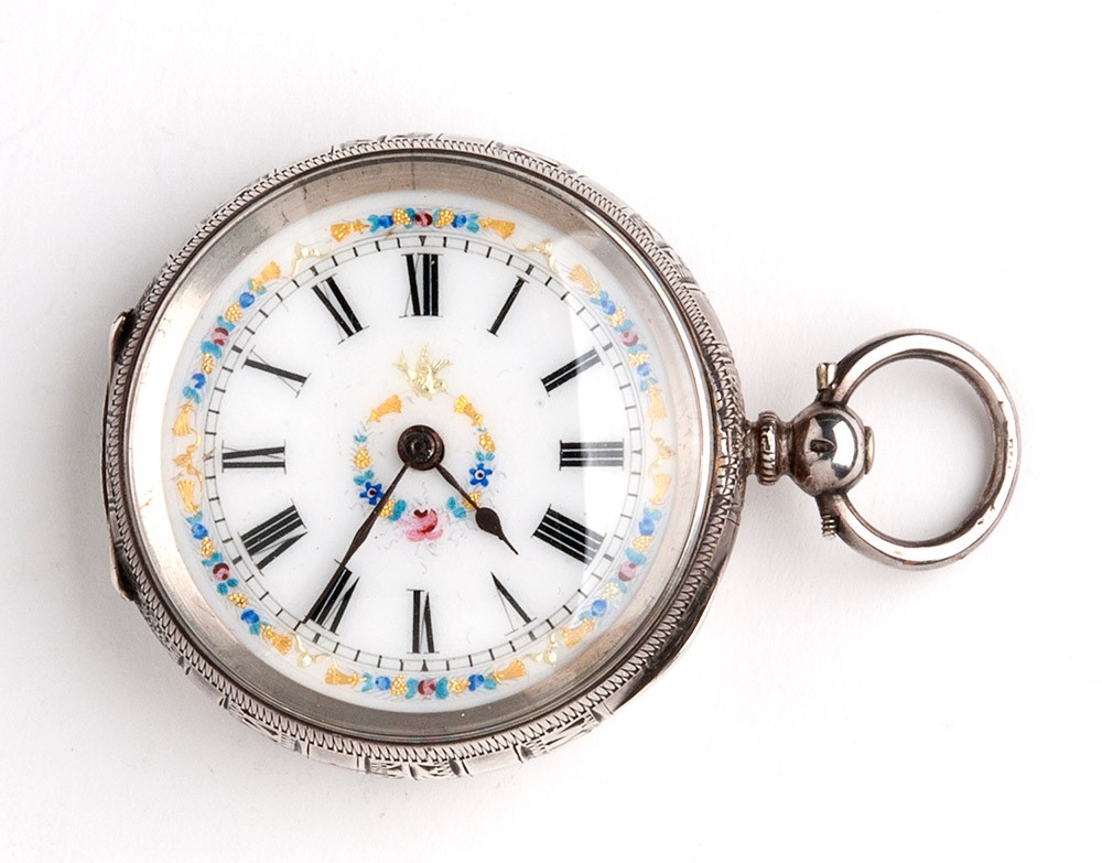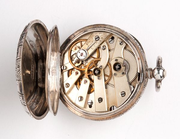 cassa in argento 935/1000, decorata con incisioni floreali, quadrante in smalto bianco con numeri romani, movimento a cilindro con rimessa dell'ora e carica a chiave.