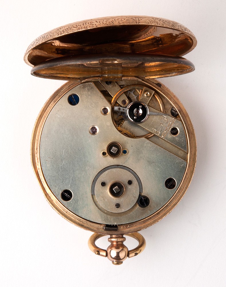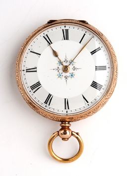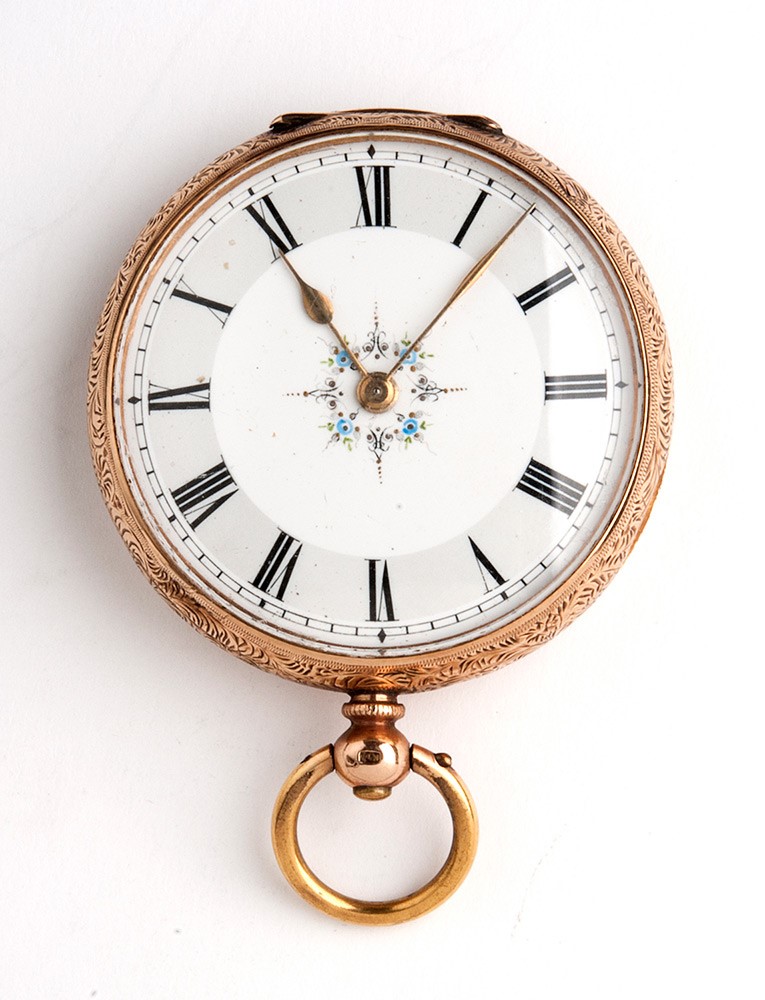 cassa in oro 14k decorata con incisioni floreali, quadrante in smalto bianco con numeri romani, movimento a cilindro con rimessa dell'ora e carica a chiave.