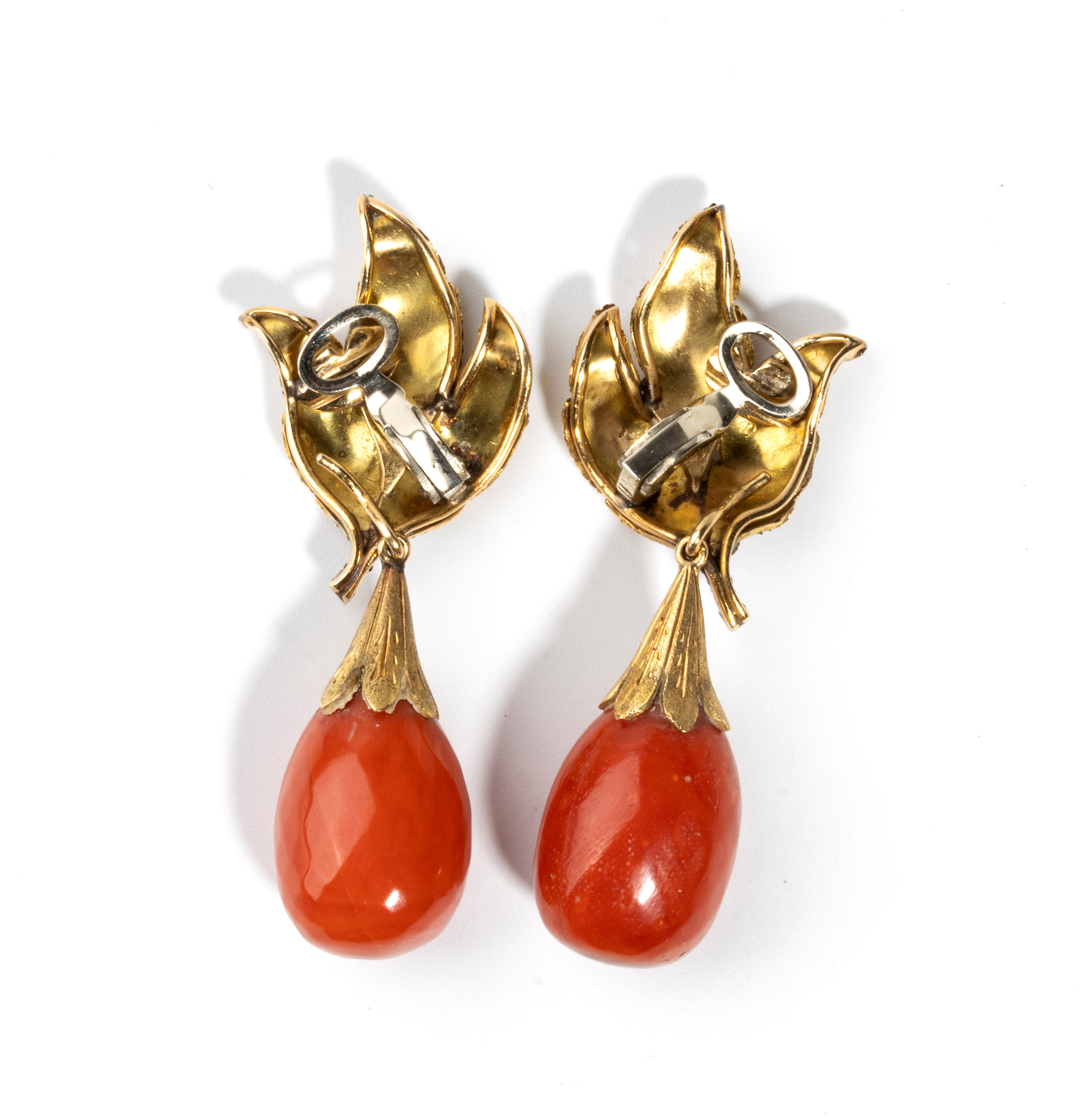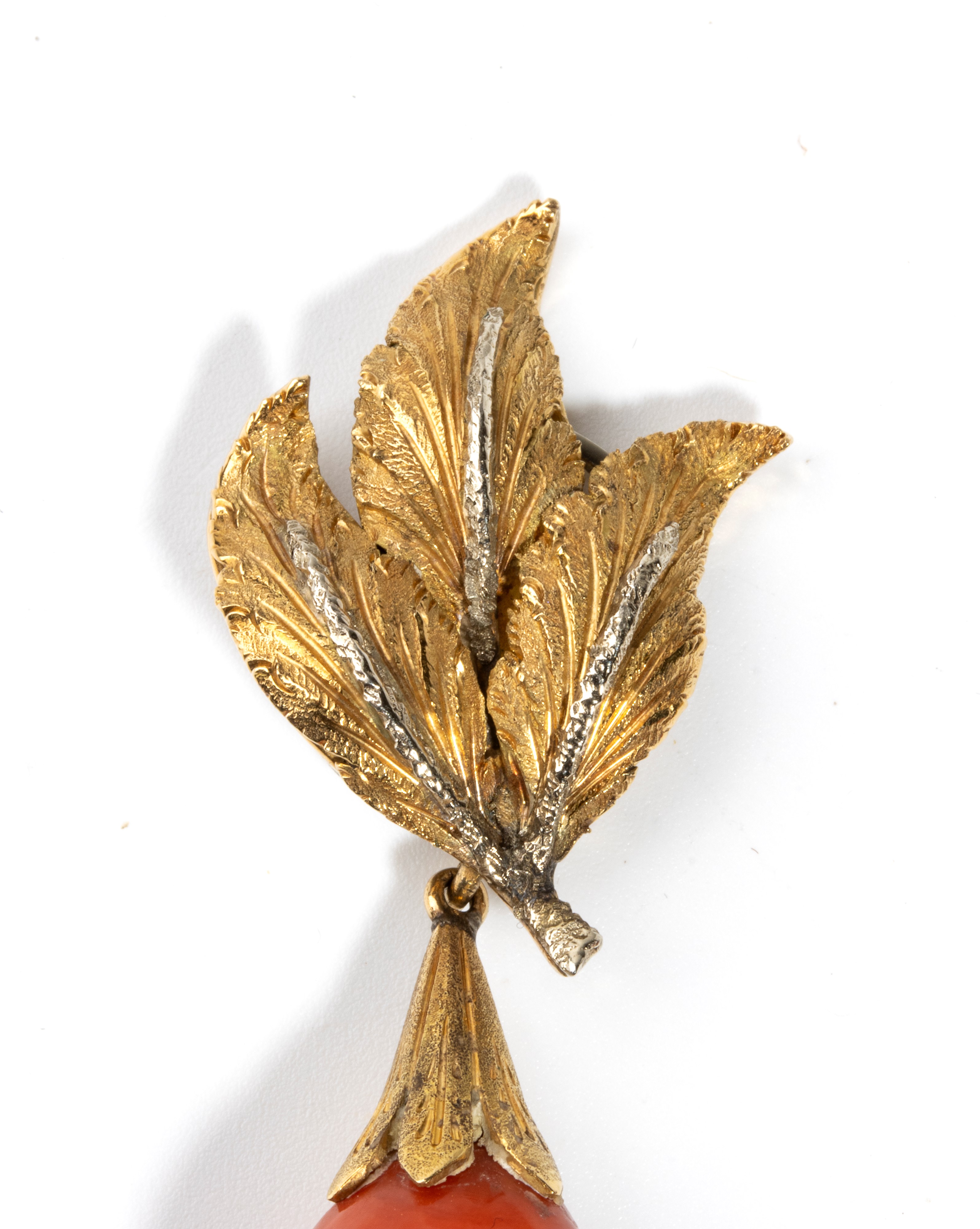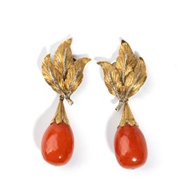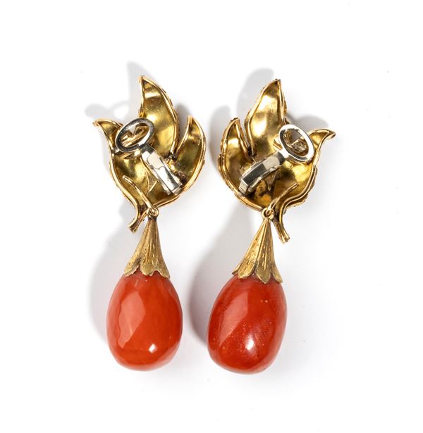 in oro giallo 18k, con motivo di foglie incise, a cui è sospeso un pendente a goccia in corallo cerasuolo (Corallium Elatius).