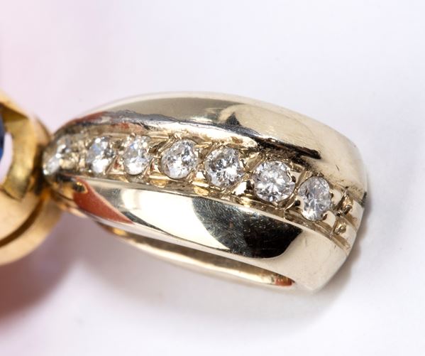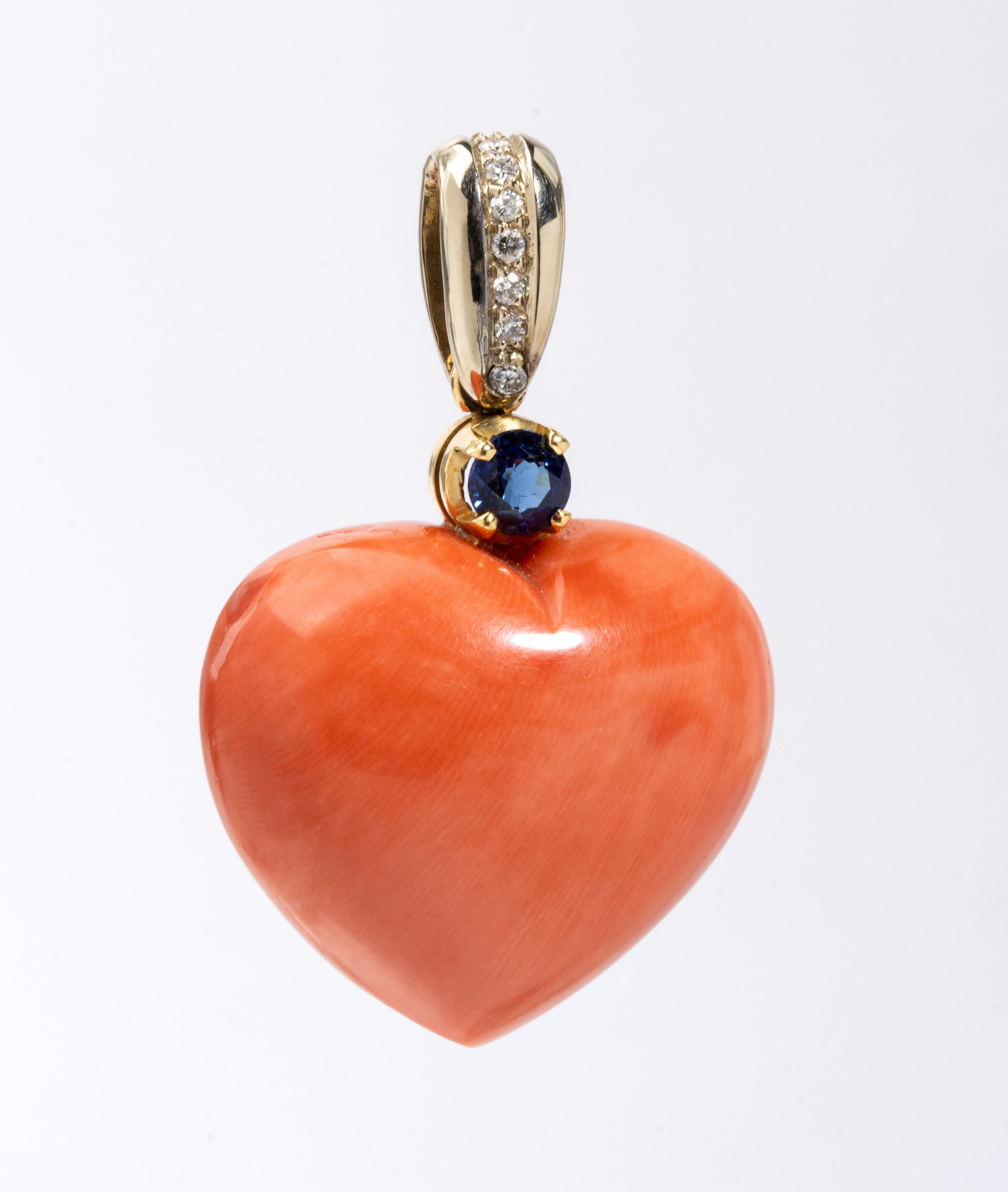 in oro giallo ed oro bianco, con cuore in corallo Cerasuolo (Corallium Elatius) sormontato da zaffiro i piccoli diamanti.