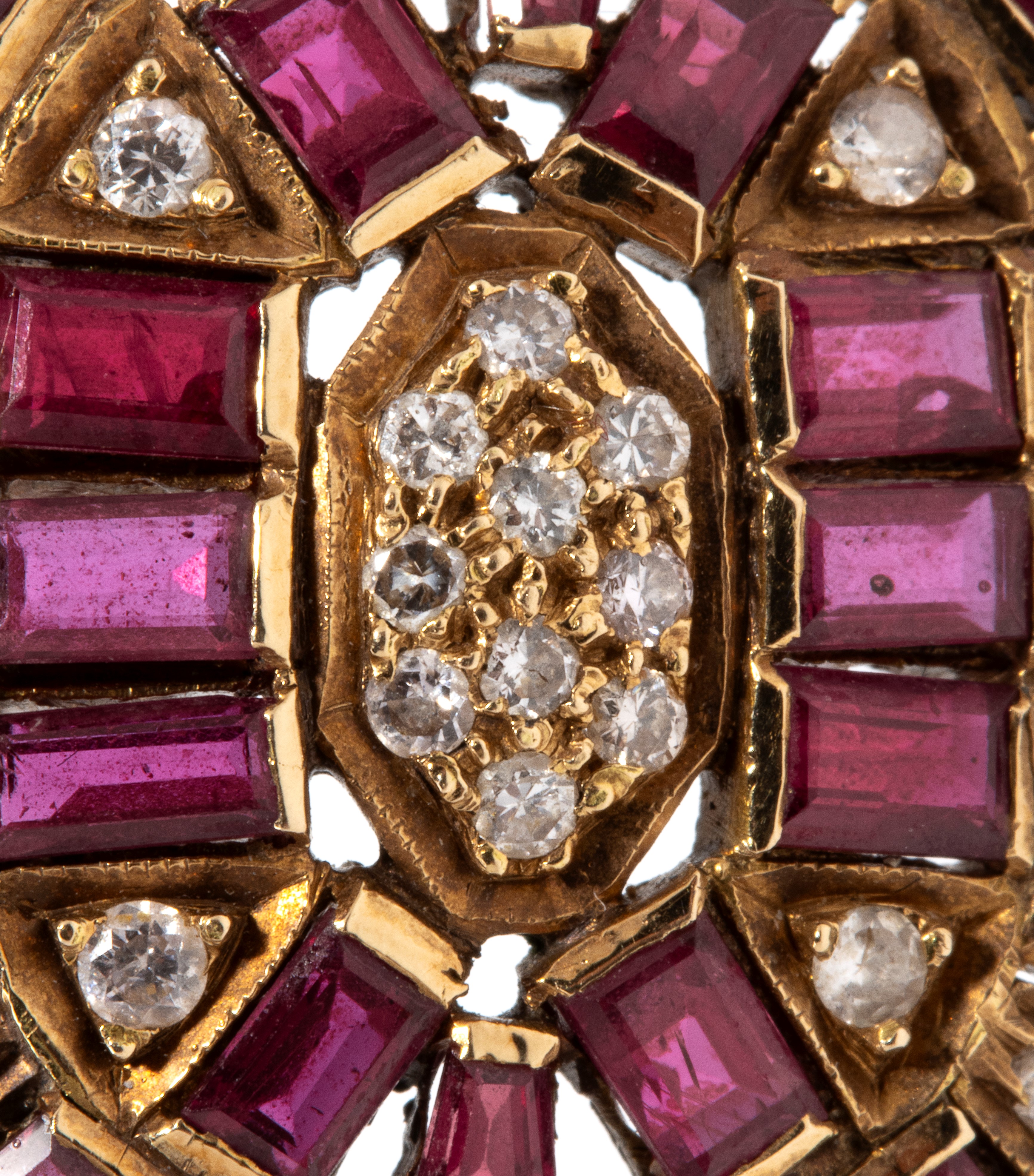 in oro giallo, di forma ovale, impreziosito da rubini di forma rettangolare e trapezoidale e diamanti di forma rotonda, taglio brillante, stimati per un peso totale di circa 0.30 ct.