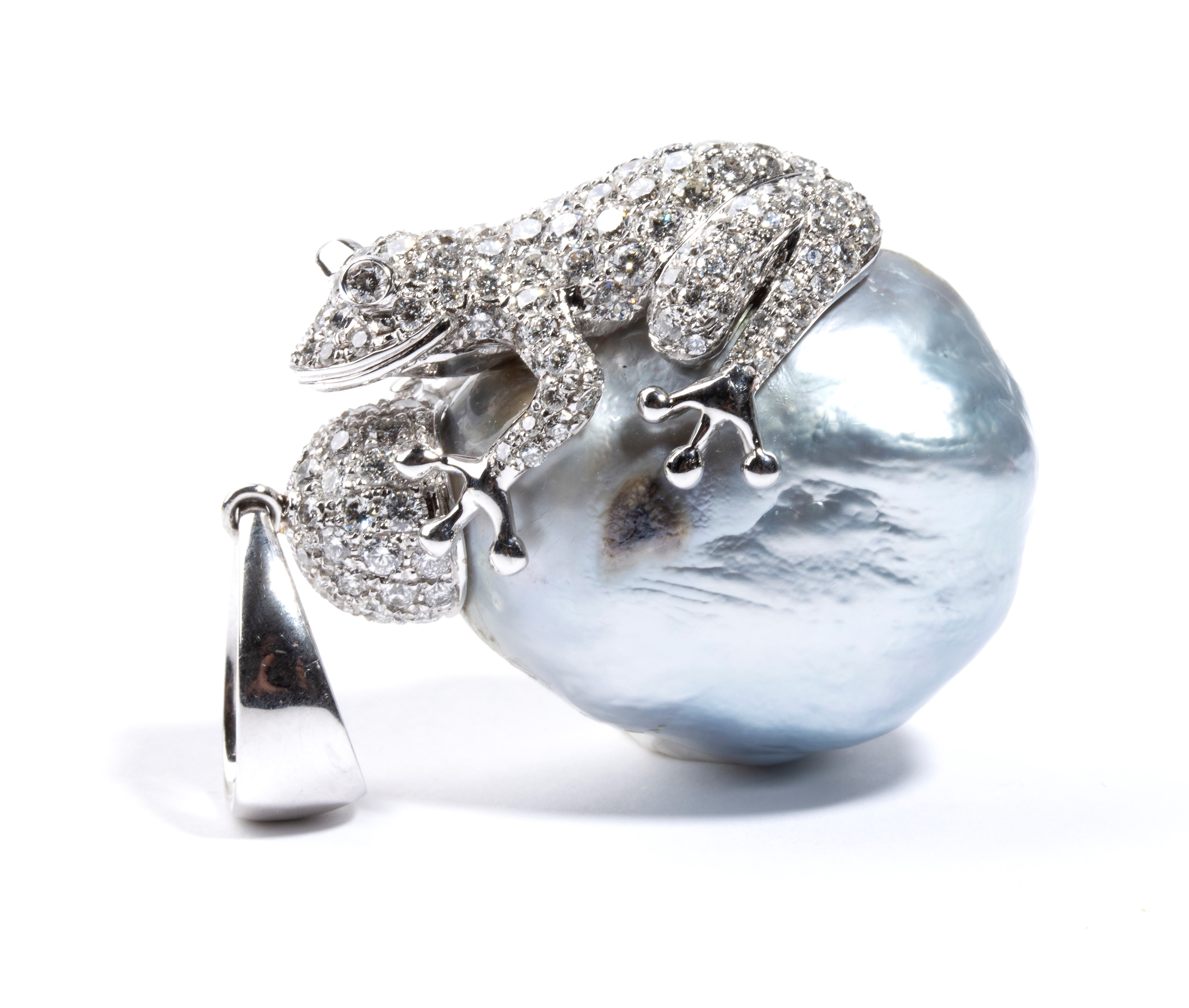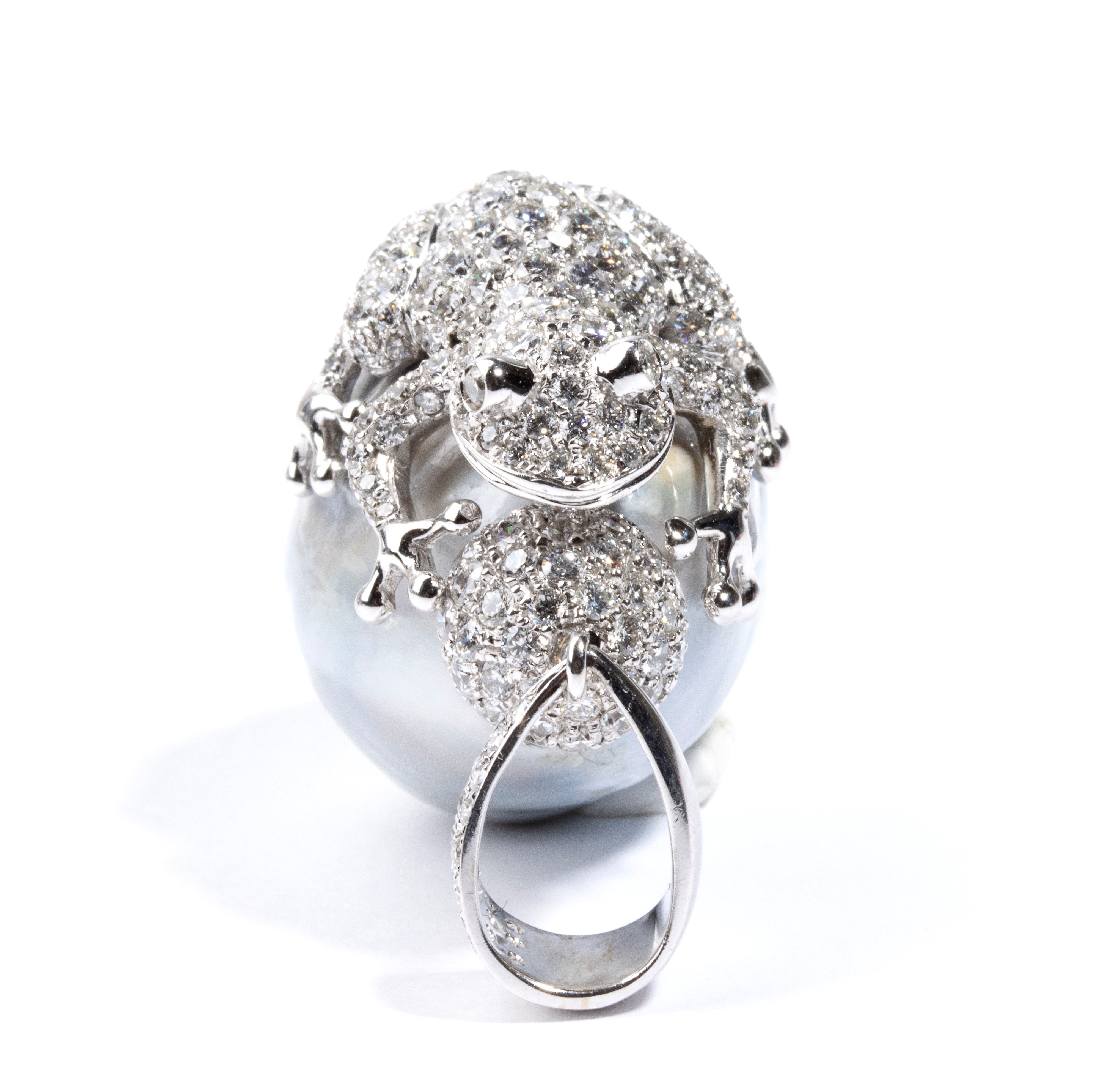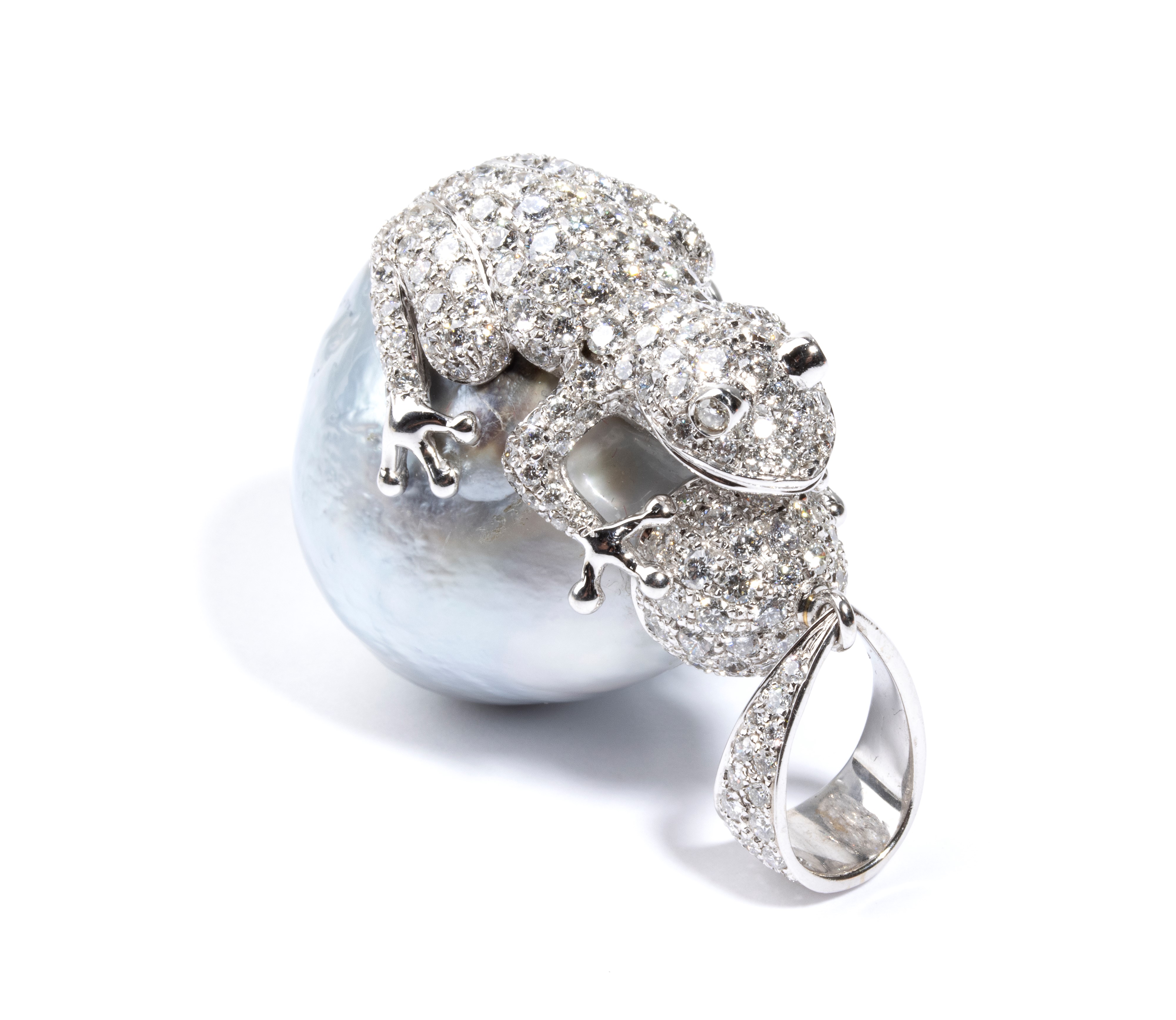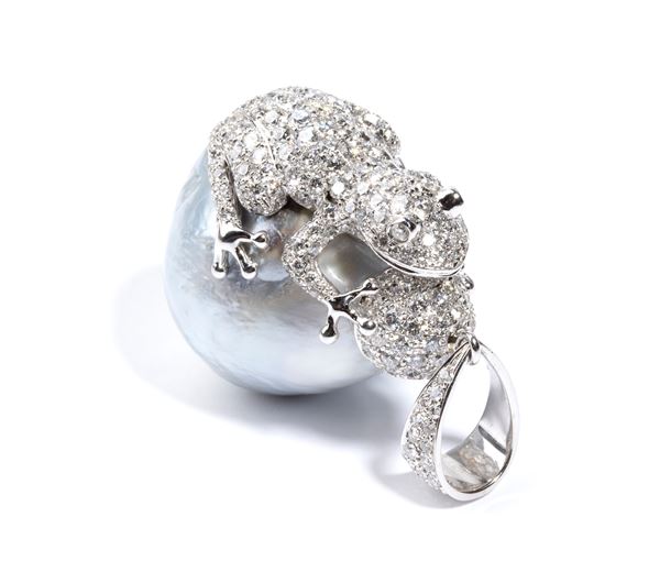 in oro bianco, con grande perla barocca sormontata da piccola rana in pavé di diamanti.