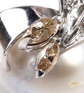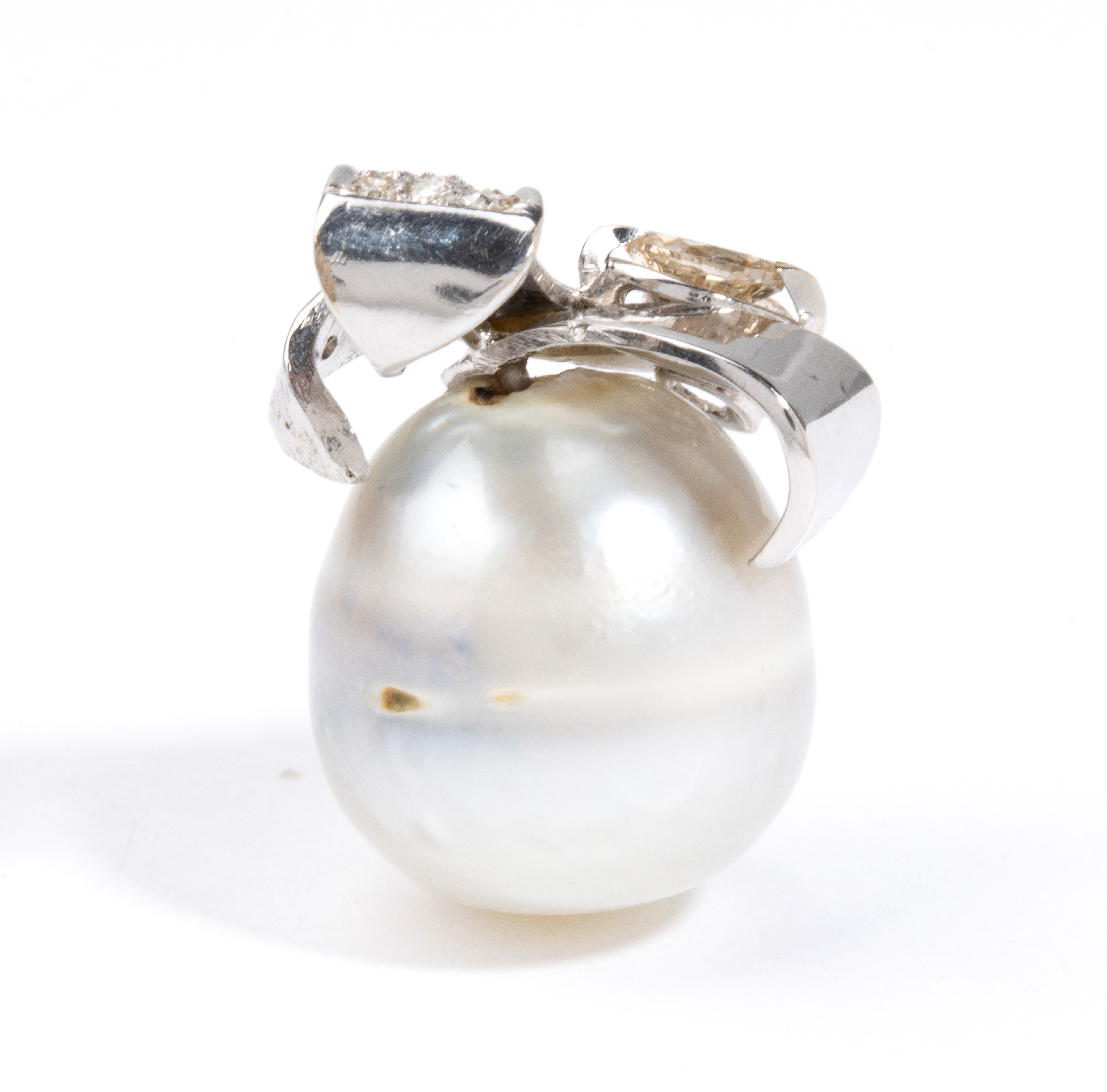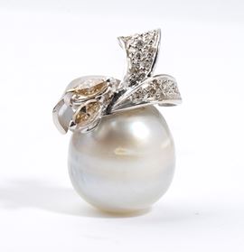 in oro bianco, con perla Australiana sormontata da motivo di nastro in diamanti.