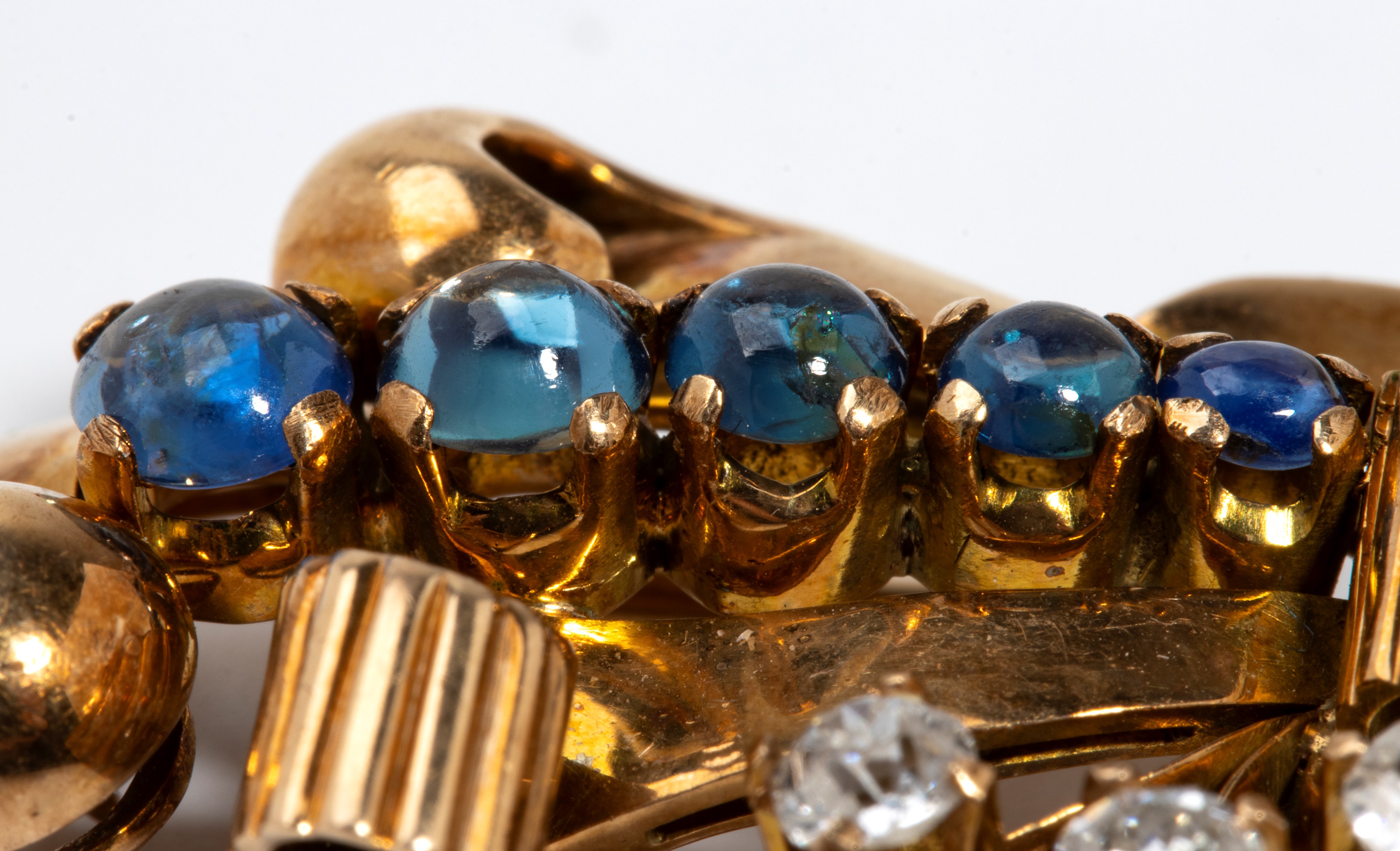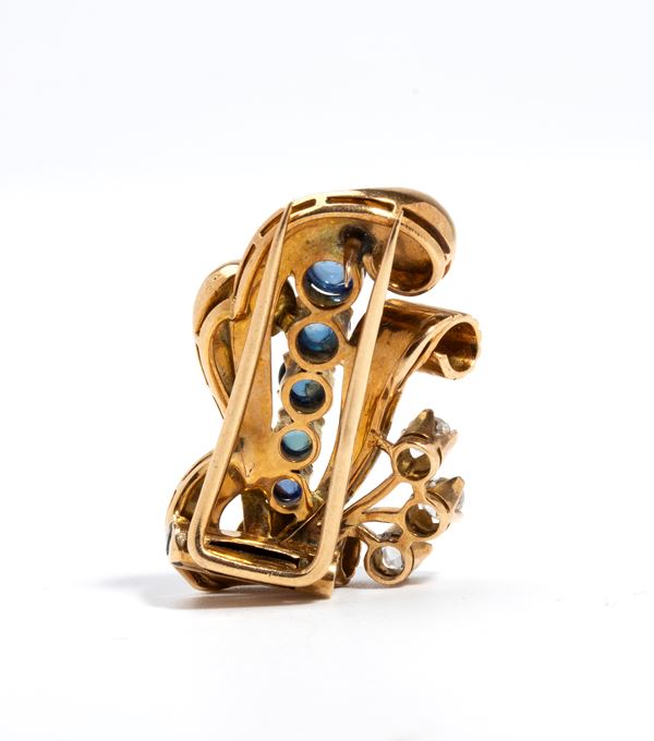 in oro giallo 18k, a motivo di volute di nastri, impreziosito da linea di cabochon di zaffiri e diamanti di taglio vecchia miniera.