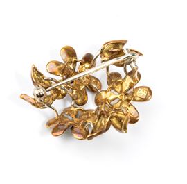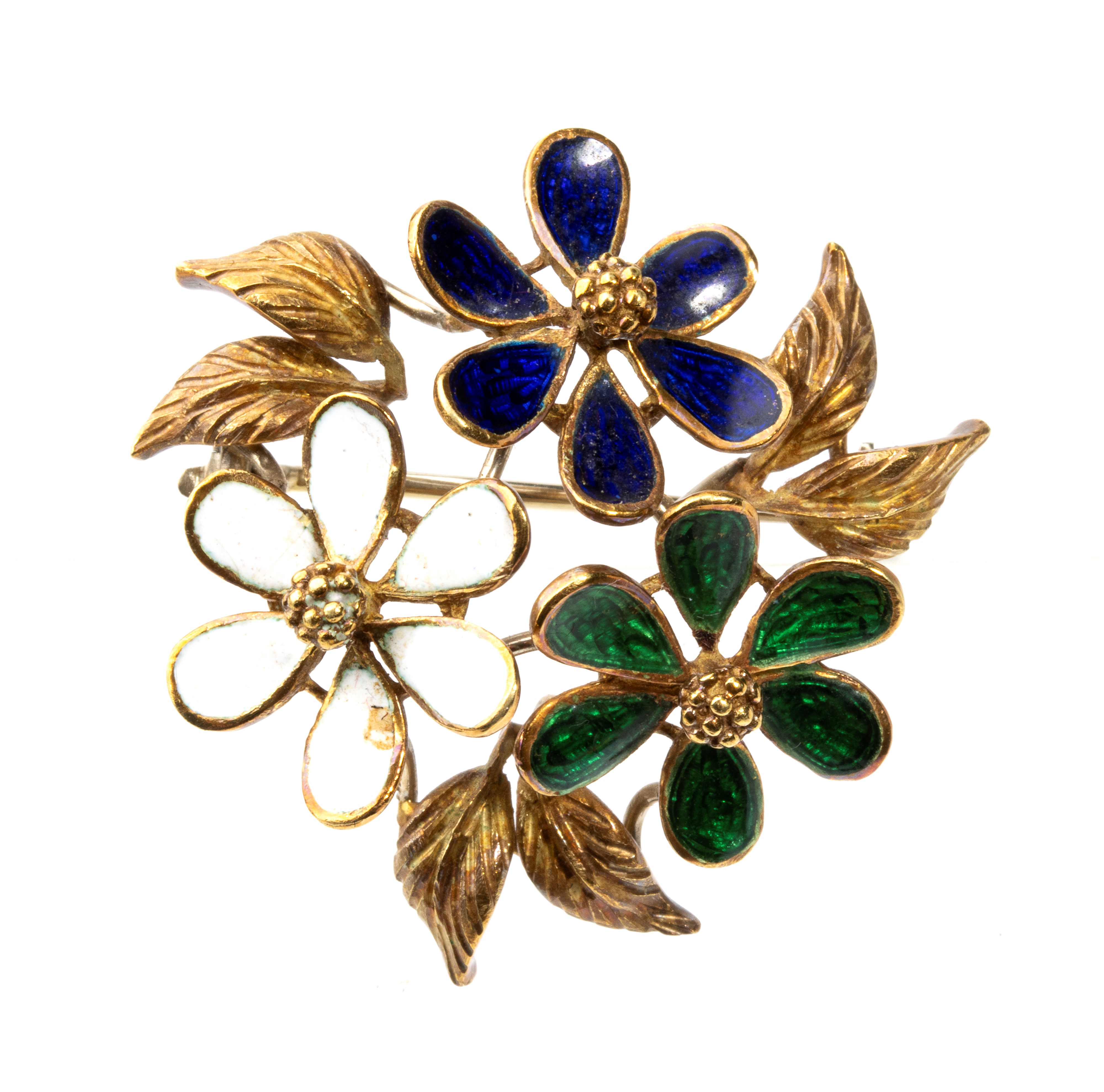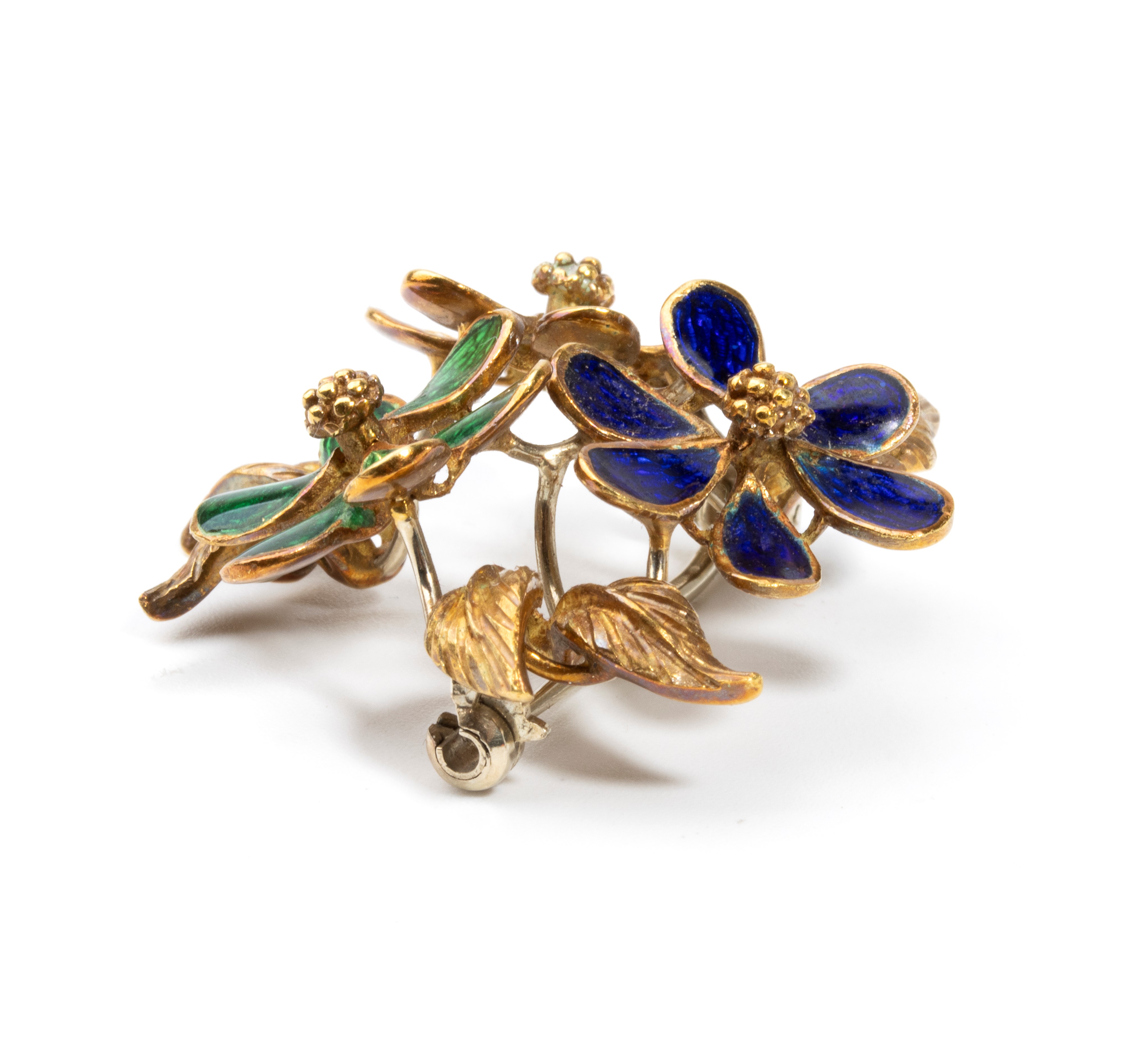 in oro giallo 18k, con foglie incise e petali in smalti.