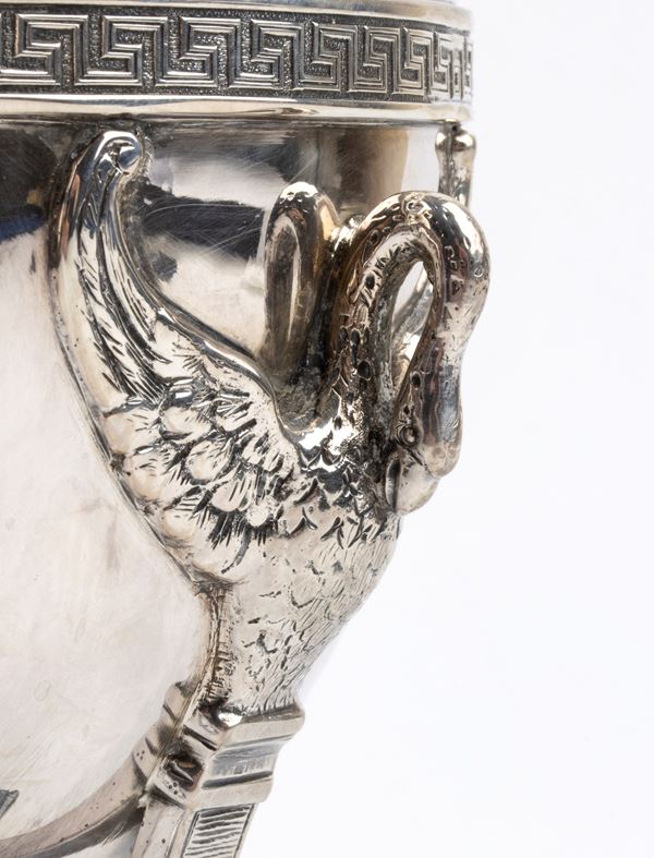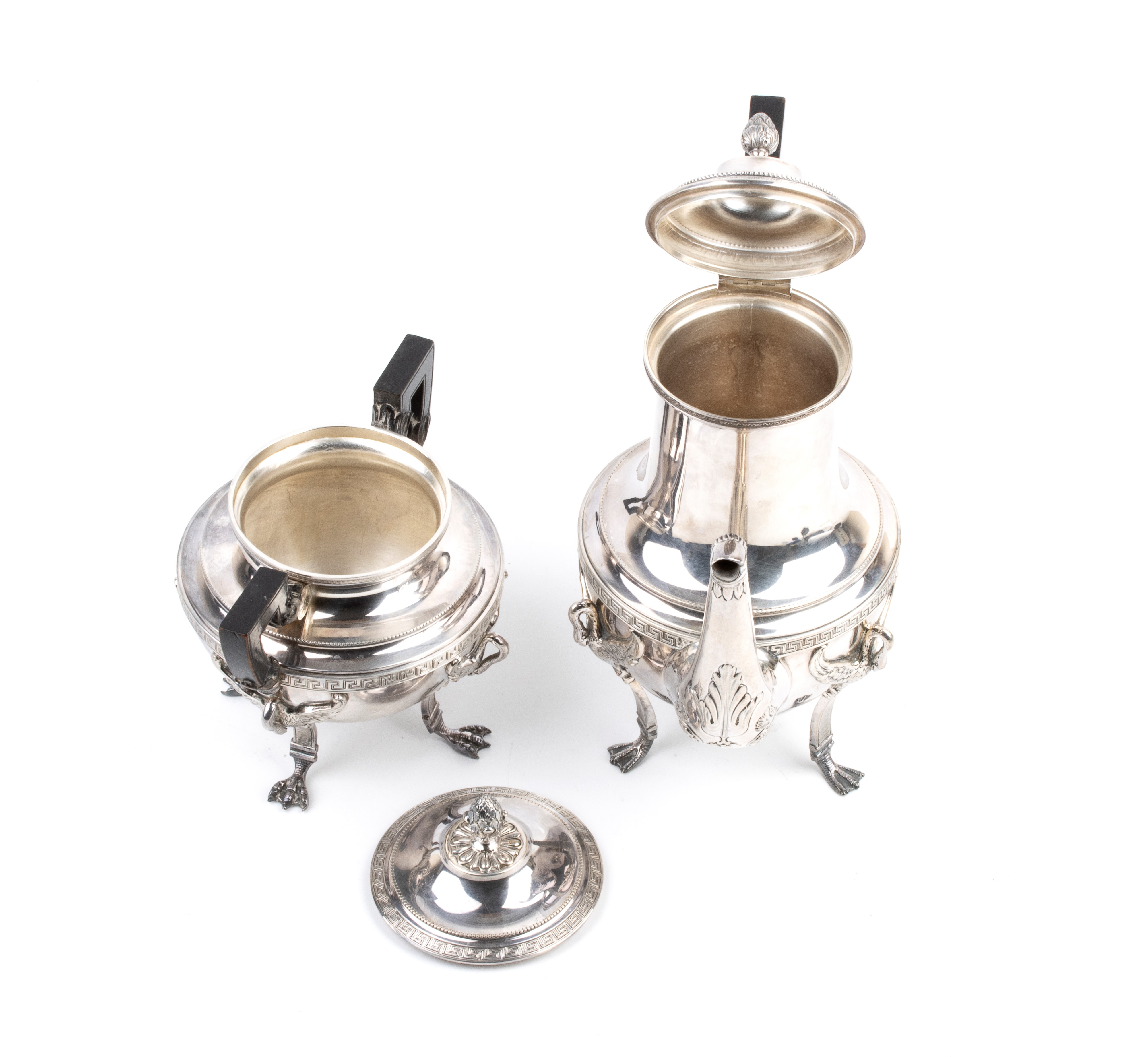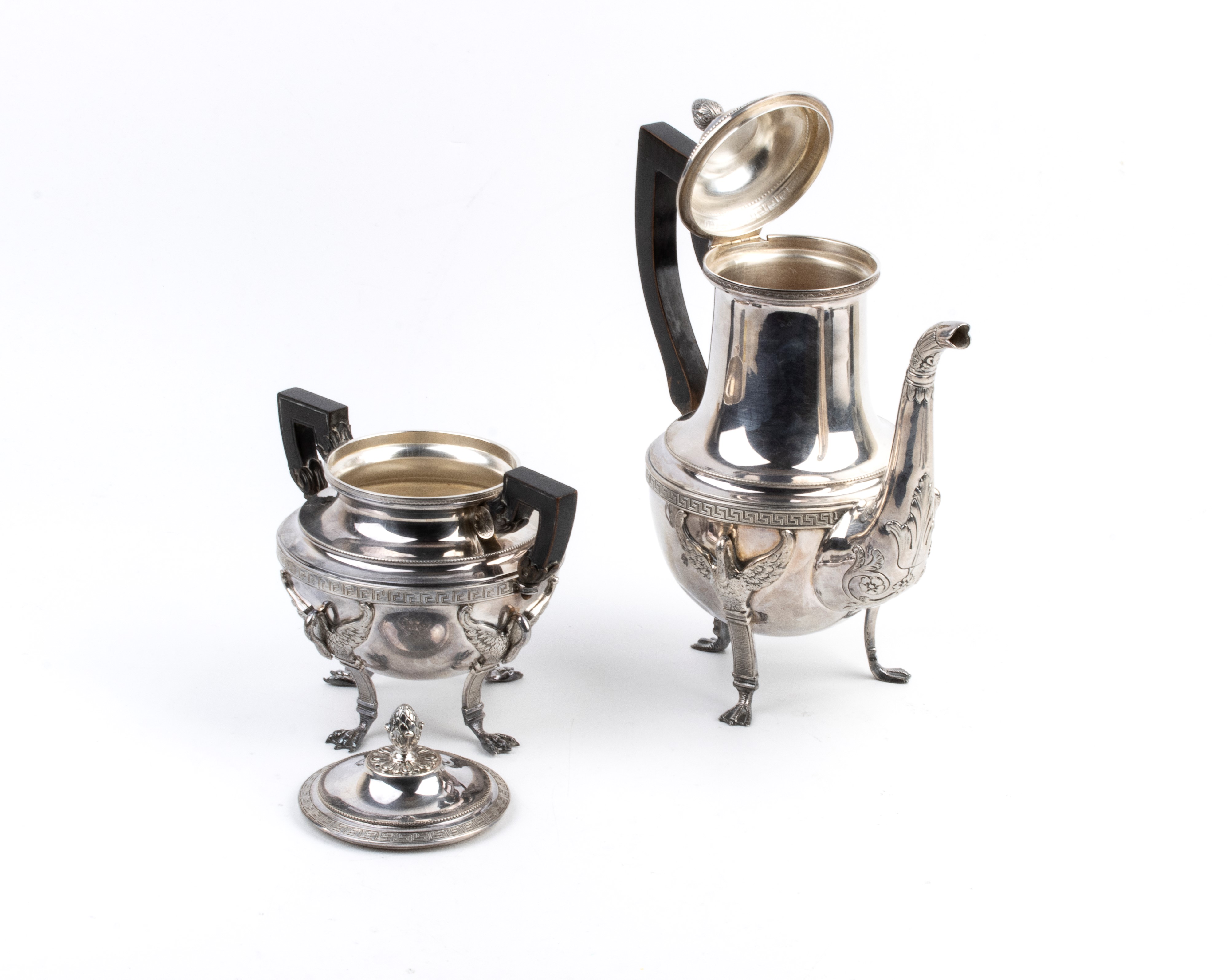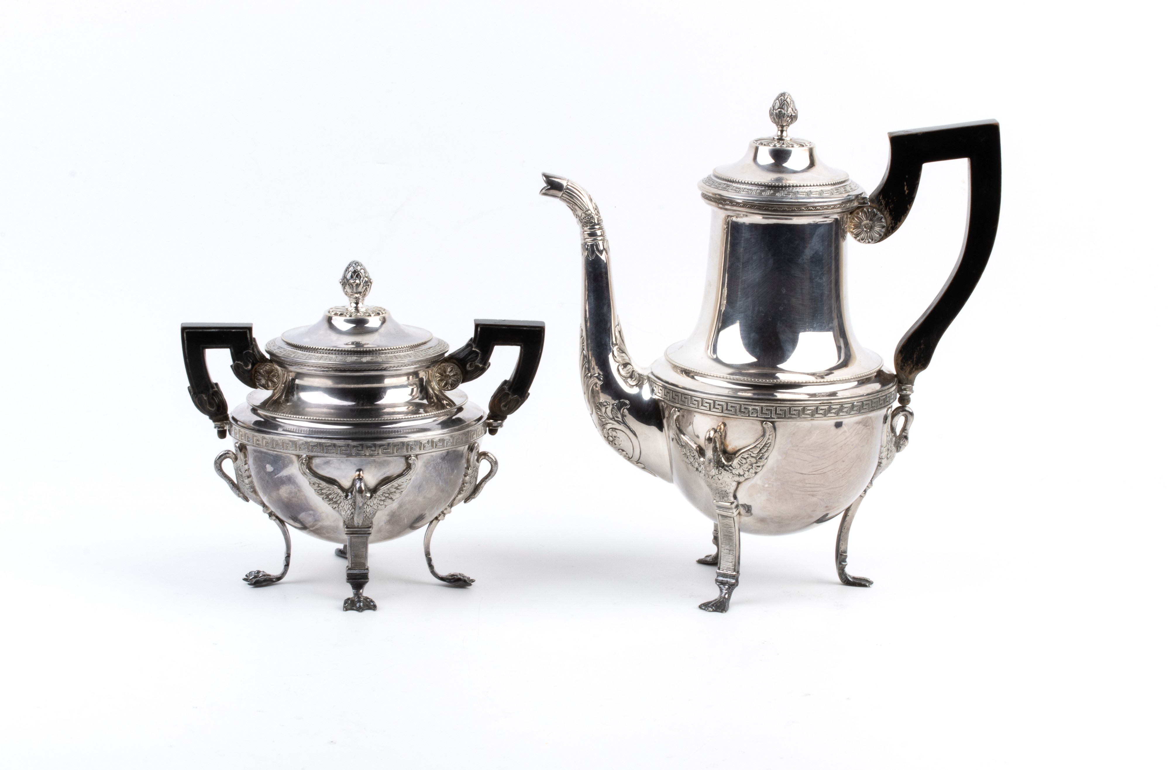 Di linea neoclassica, con corpo globulare su piedi leonini con applicazioni a cigno sul corpo, collo cilindrico ben marcato e coperchi con prese a pigna. Manici in legno ebanizzato.