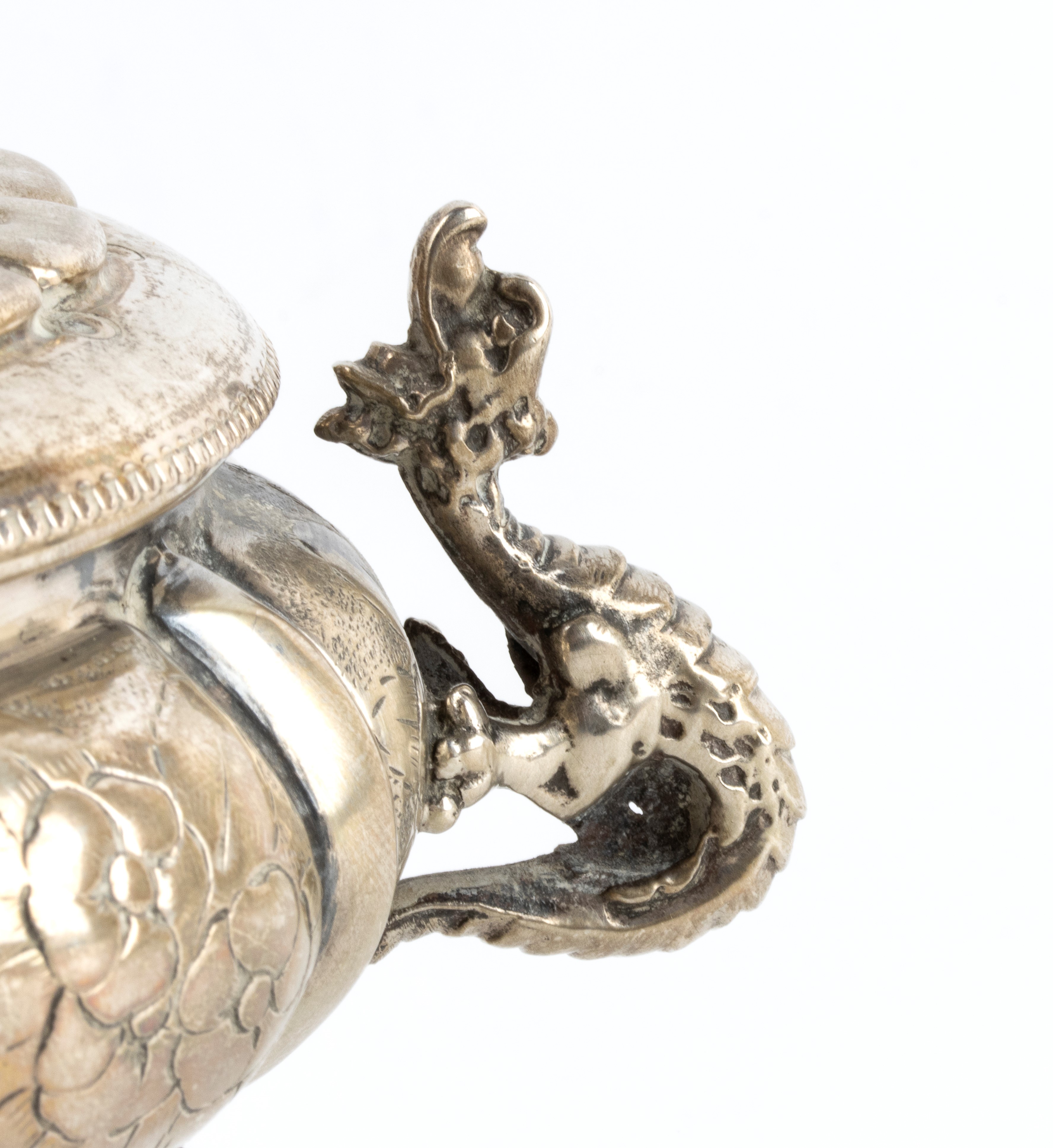 di forma globulare con costolature verticali alternate a decori floreali, poggiante su quattro piedini a zoccolo equino. Prese laterali a forma di drago.