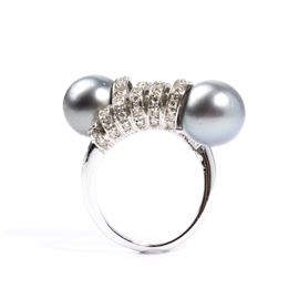 in oro bianco 18k, presenta una struttura a fasce in pavé di diamanti che fanno da cornice a delle perle Tahiti.