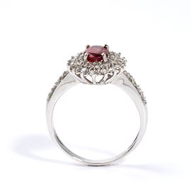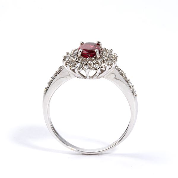 in oro bianco 18k, incastonato con rubino ovale tra doppia cornice di diamanti.