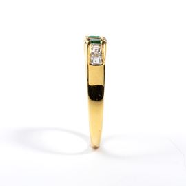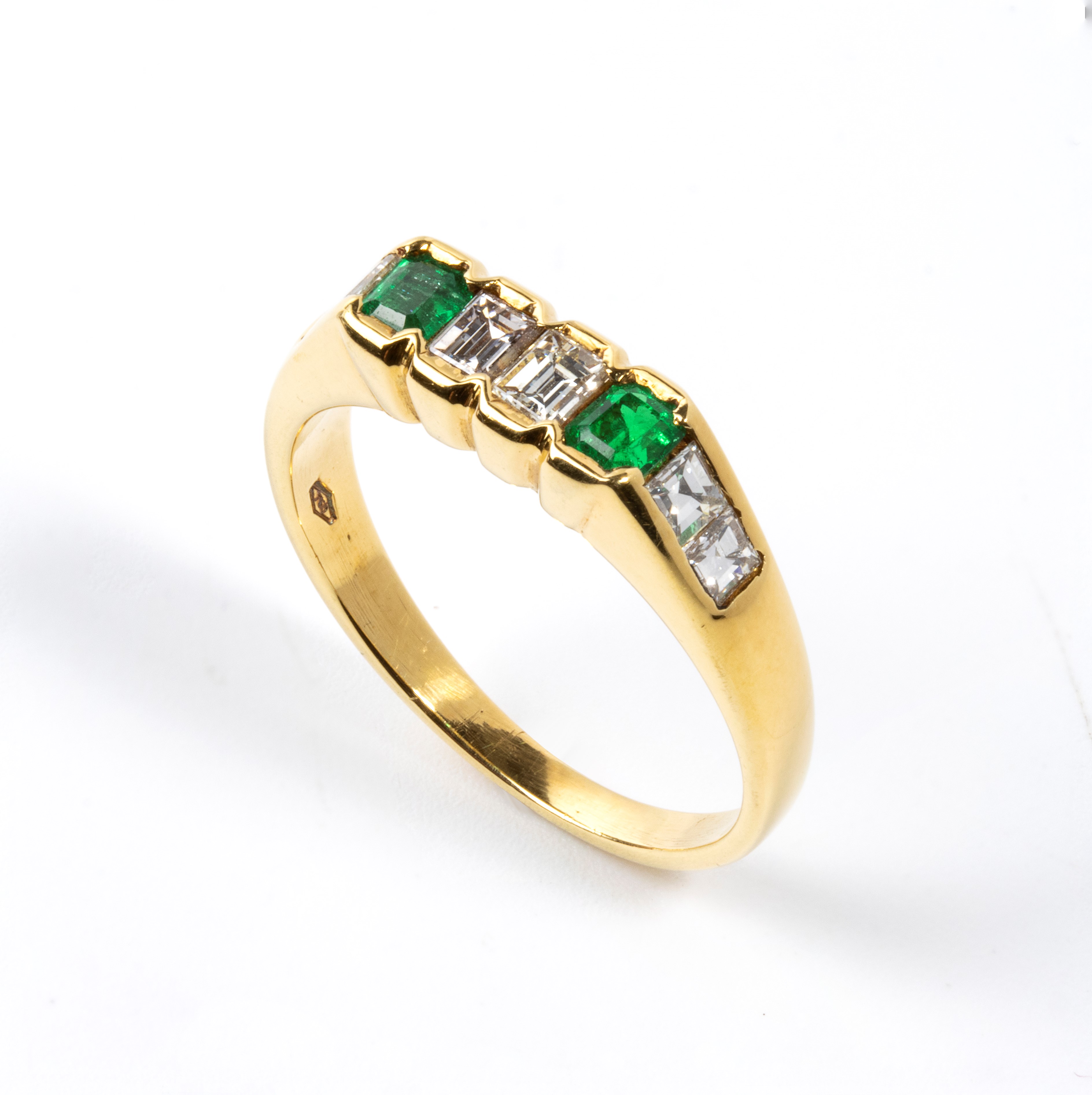 in oro giallo 18k, incastonato con n. 02 diamanti di forma ottagonale e n. 04 diamanti di forma rettangolare, stimati per un peso totale di circa 0.54 ct, colore G-H, purezza VVS-VS e n. 02 smeraldi di forma ottagonale, per un peso di circa 0.29 ct, come misurati con montatura.