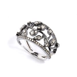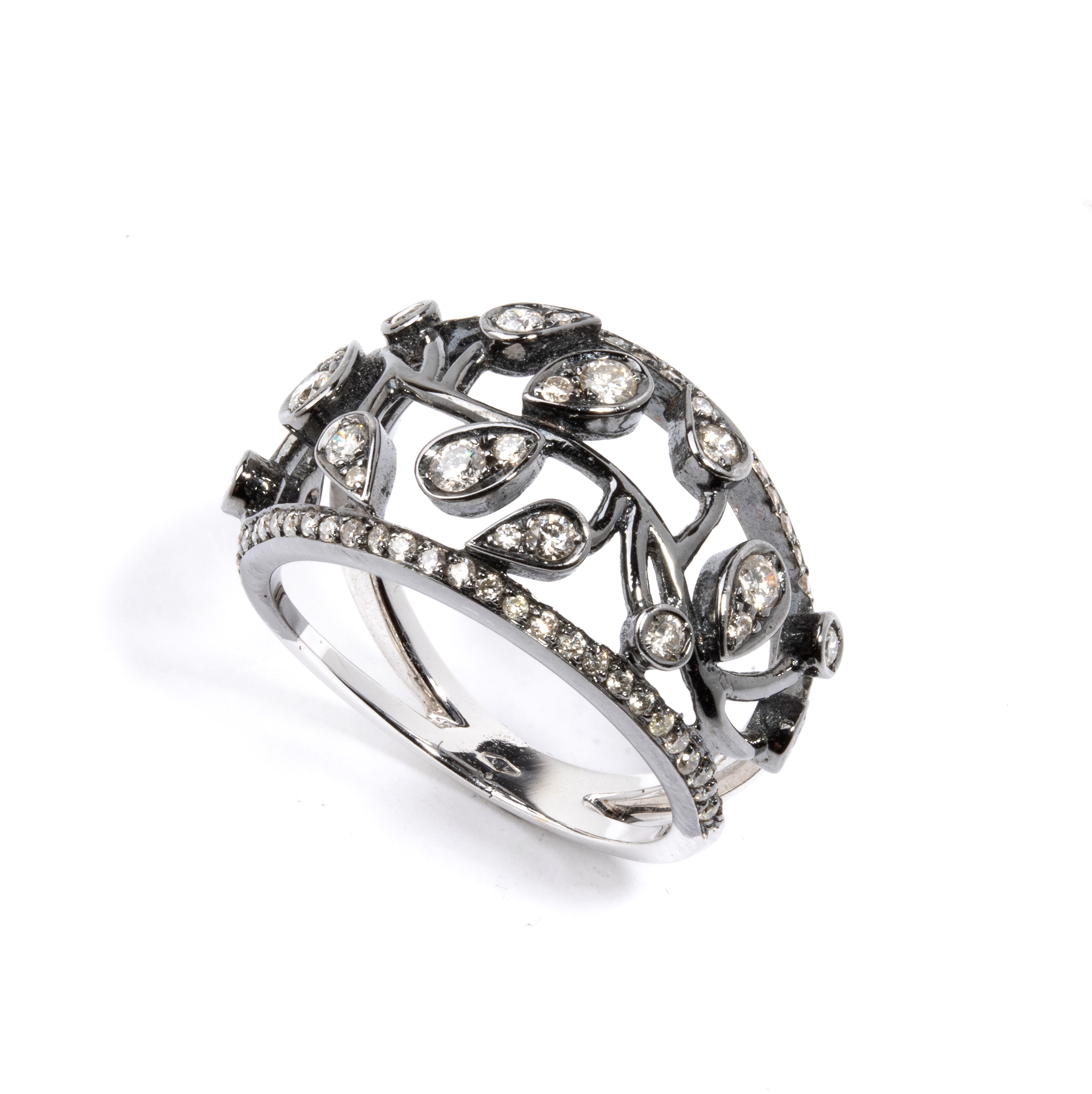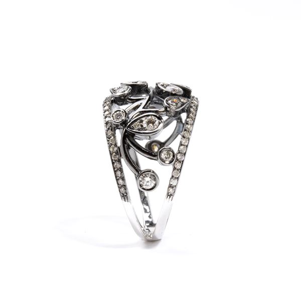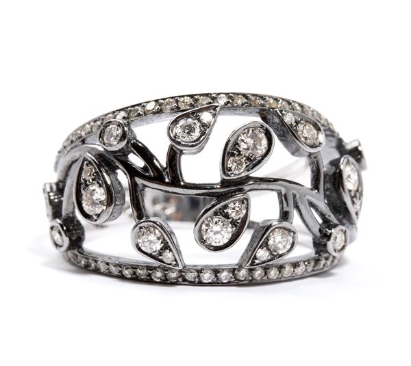 in oro bianco 18k con applicazione di rutenio, traforato a motivi vegetali in diamanti, stimati per un peso totale di circa 0.72 ct, colore G-H, purezza VS-SI, come misurati con montatura.