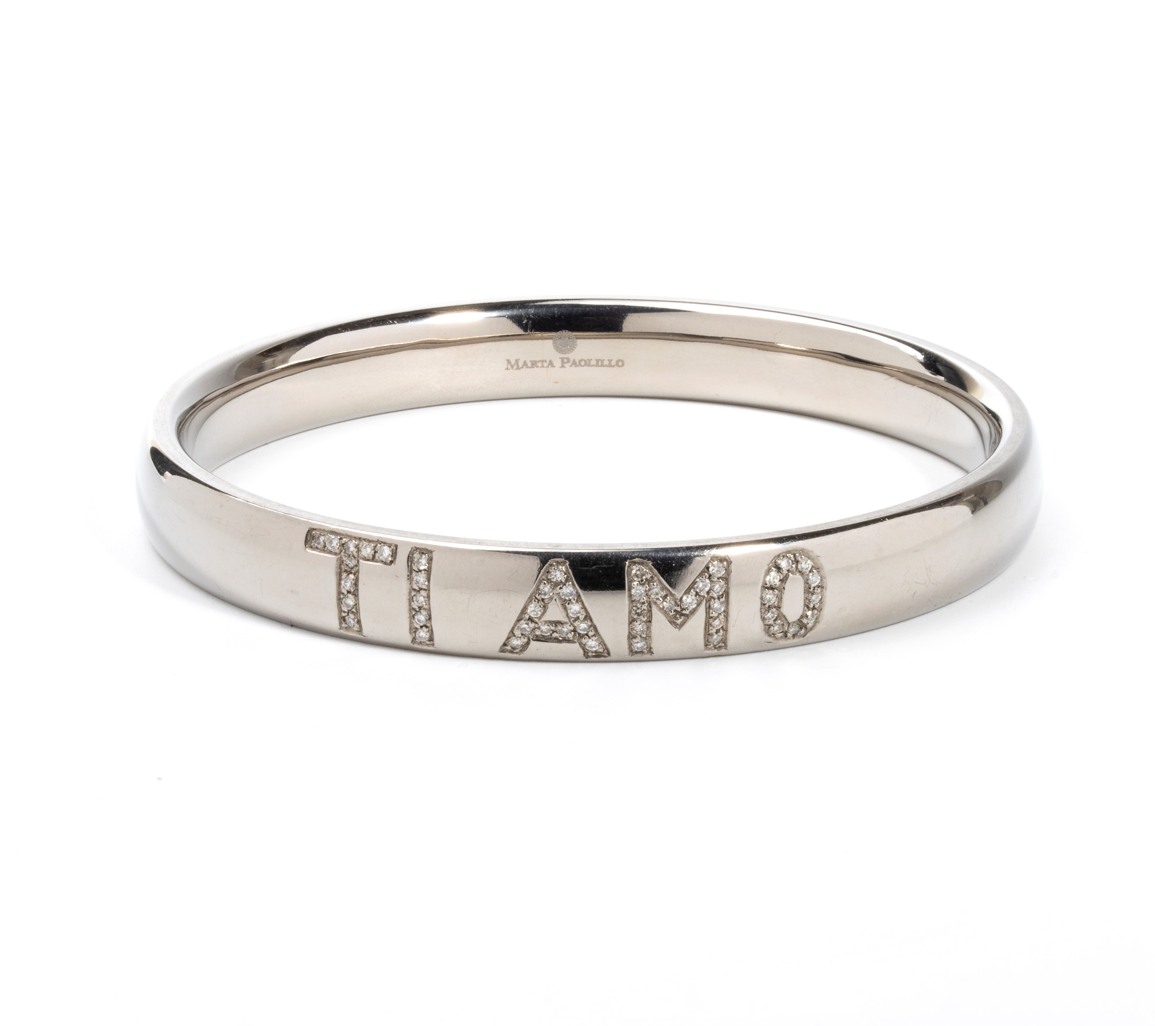 in acciaio, con iscrizione "TI AMO" in diamanti di forma rotonda, taglio brillante, stimati per un peso totale di circa 0.45 ct, colore H-I, purezza VS-SI , come misurati e classificati nella montatura.