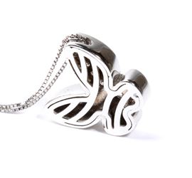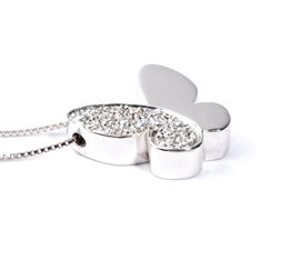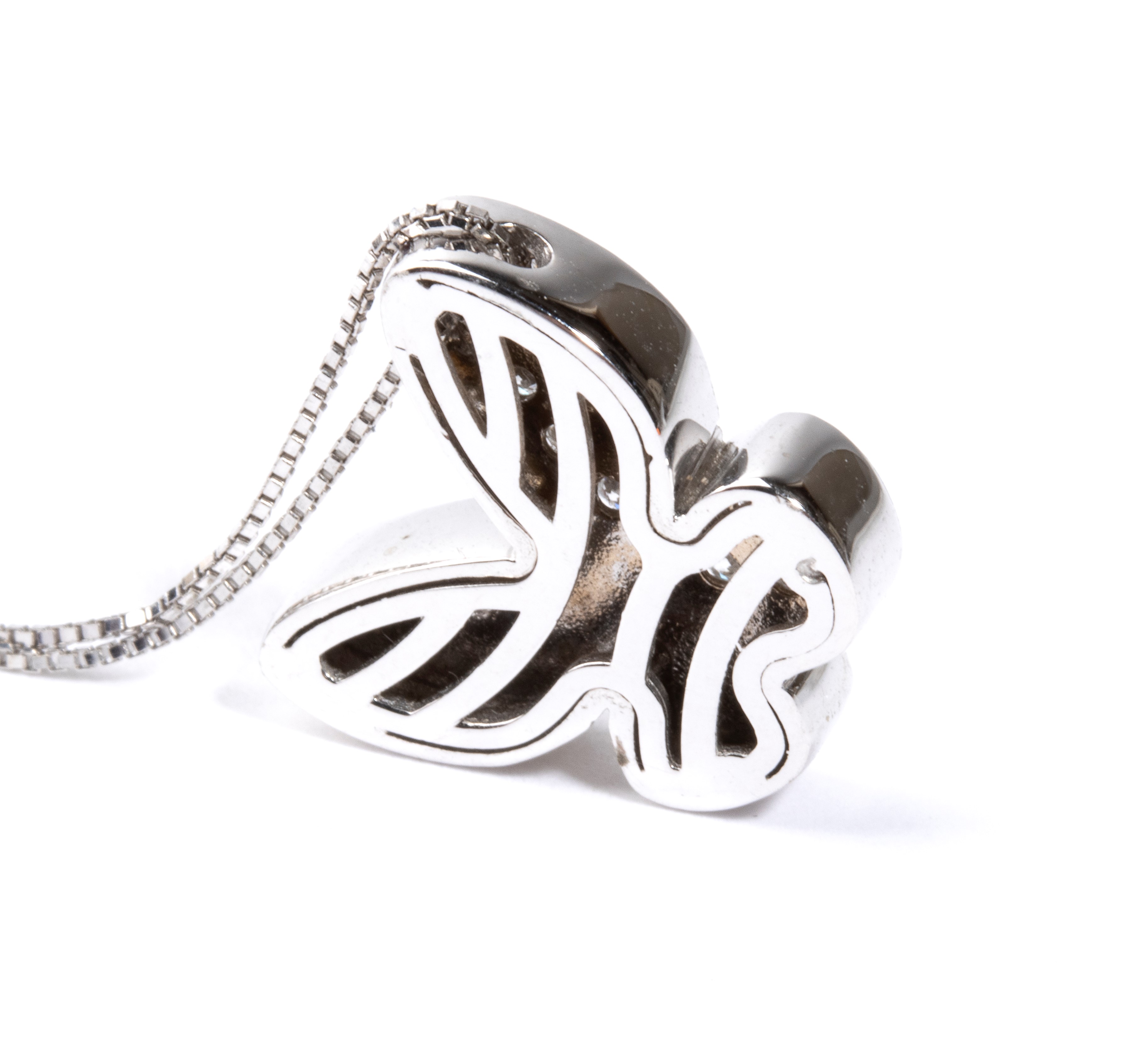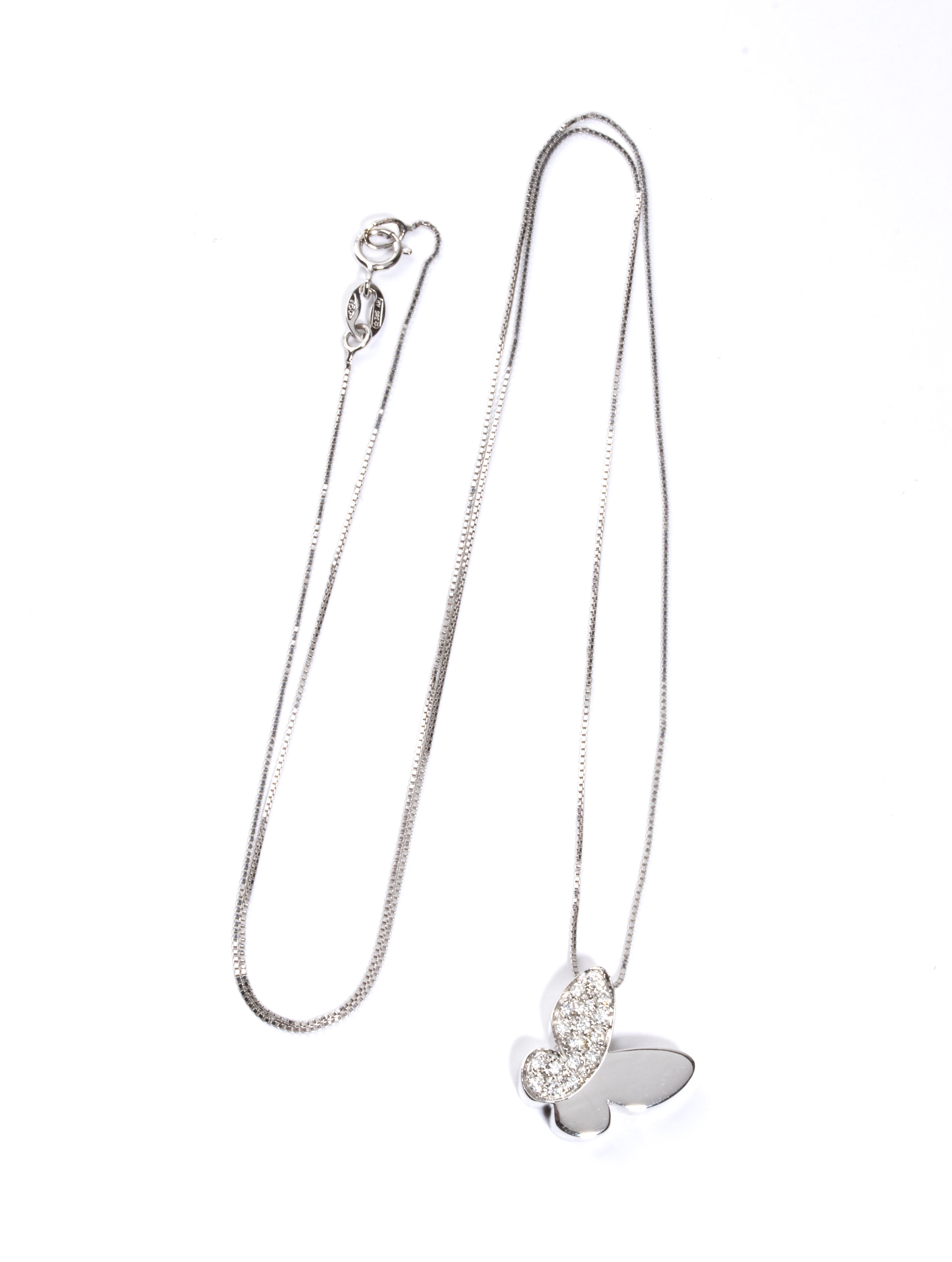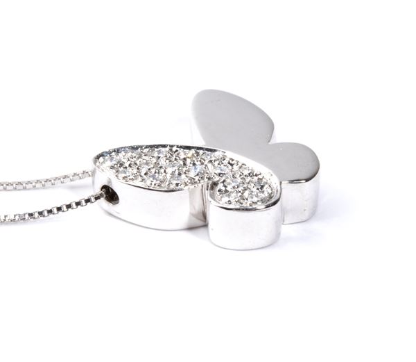 in oro bianco 18k, con sottile catena a cui è sospeso un pendente a forma di farfalla incastonata con pavé di diamanti di forma rotonda, taglio brillante, stimati per un peso totale di circa 0.12 ct, colore H, purezza VS, come misurati e classificati nella montatura.