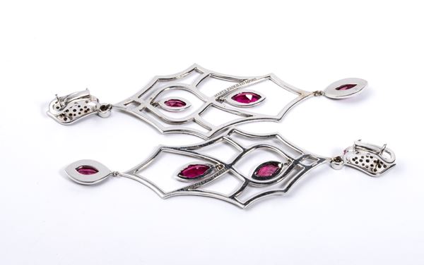 in oro bianco 18k con applicazione di rutenio, impreziositi da diamanti di colore fantasia marrone e rubelliti ovali. Firmati: "MARTA PAOLILLO".