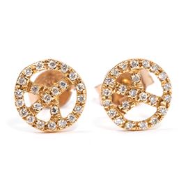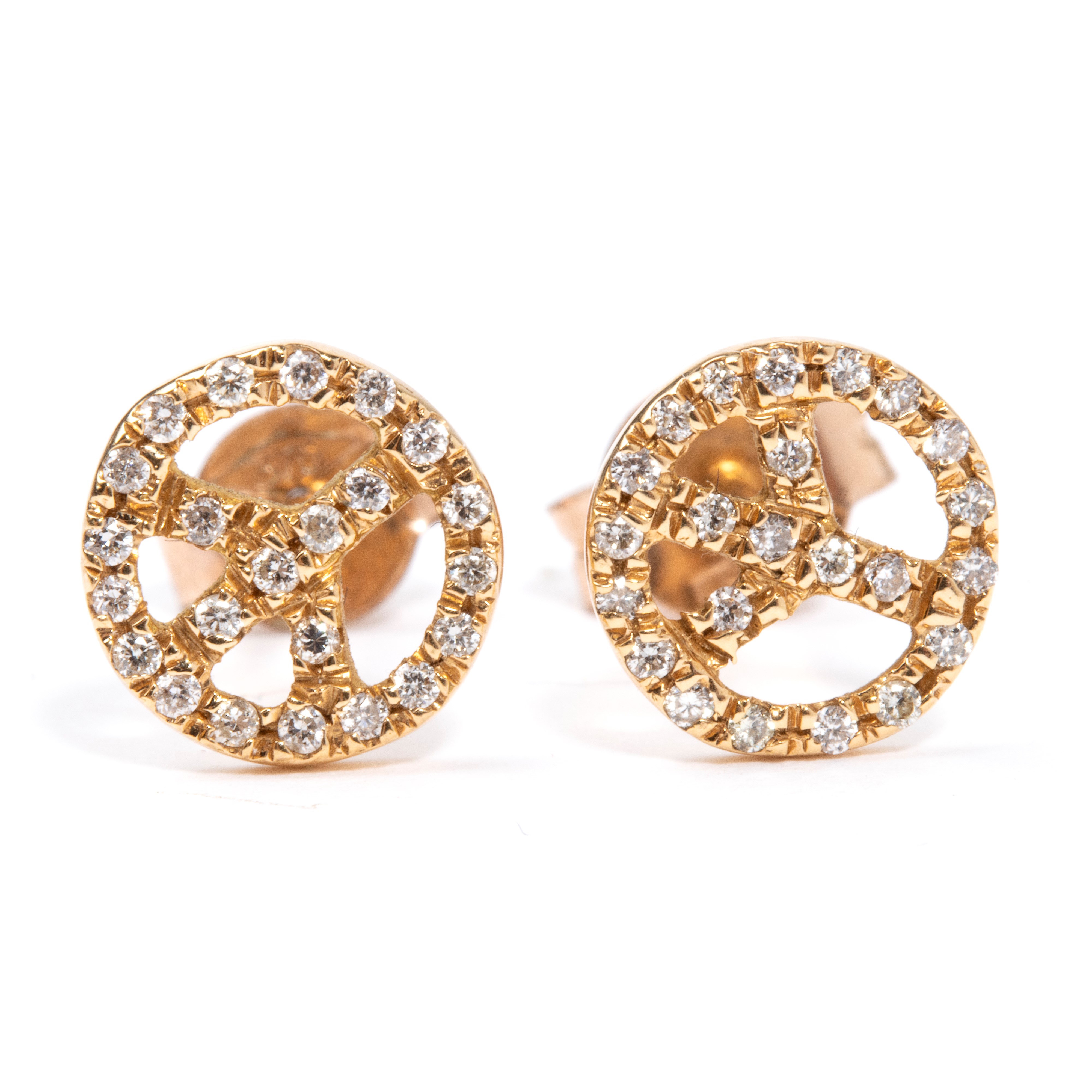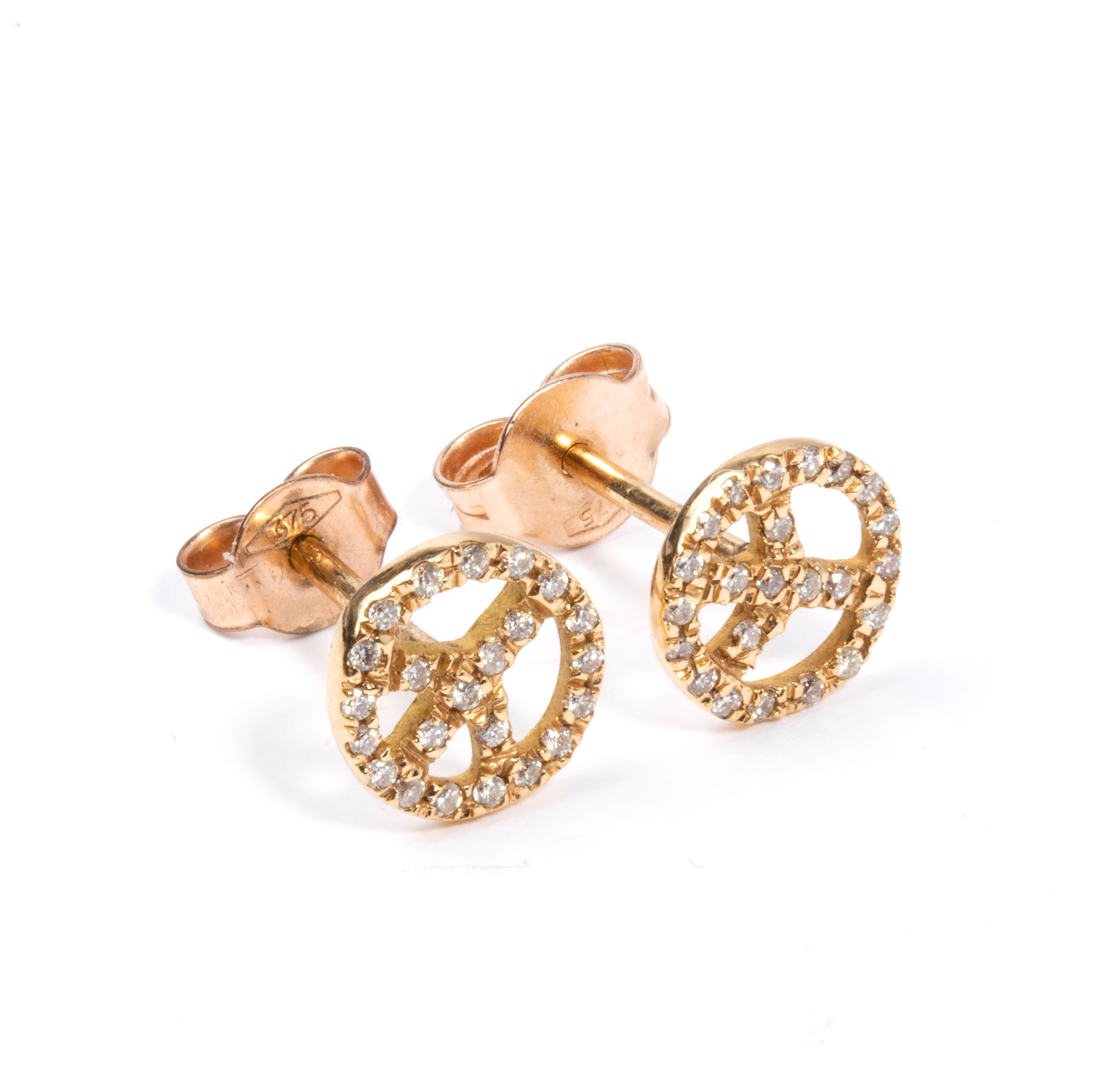 in oro giallo 9k, raffiguranti il simbolo della pace (CND) in pavè di diamanti taglio brillante stimati per un peso totale di circa 0.16 ct, colore H-I, purezza VS-SI, come misurati e classificati nella montatura.