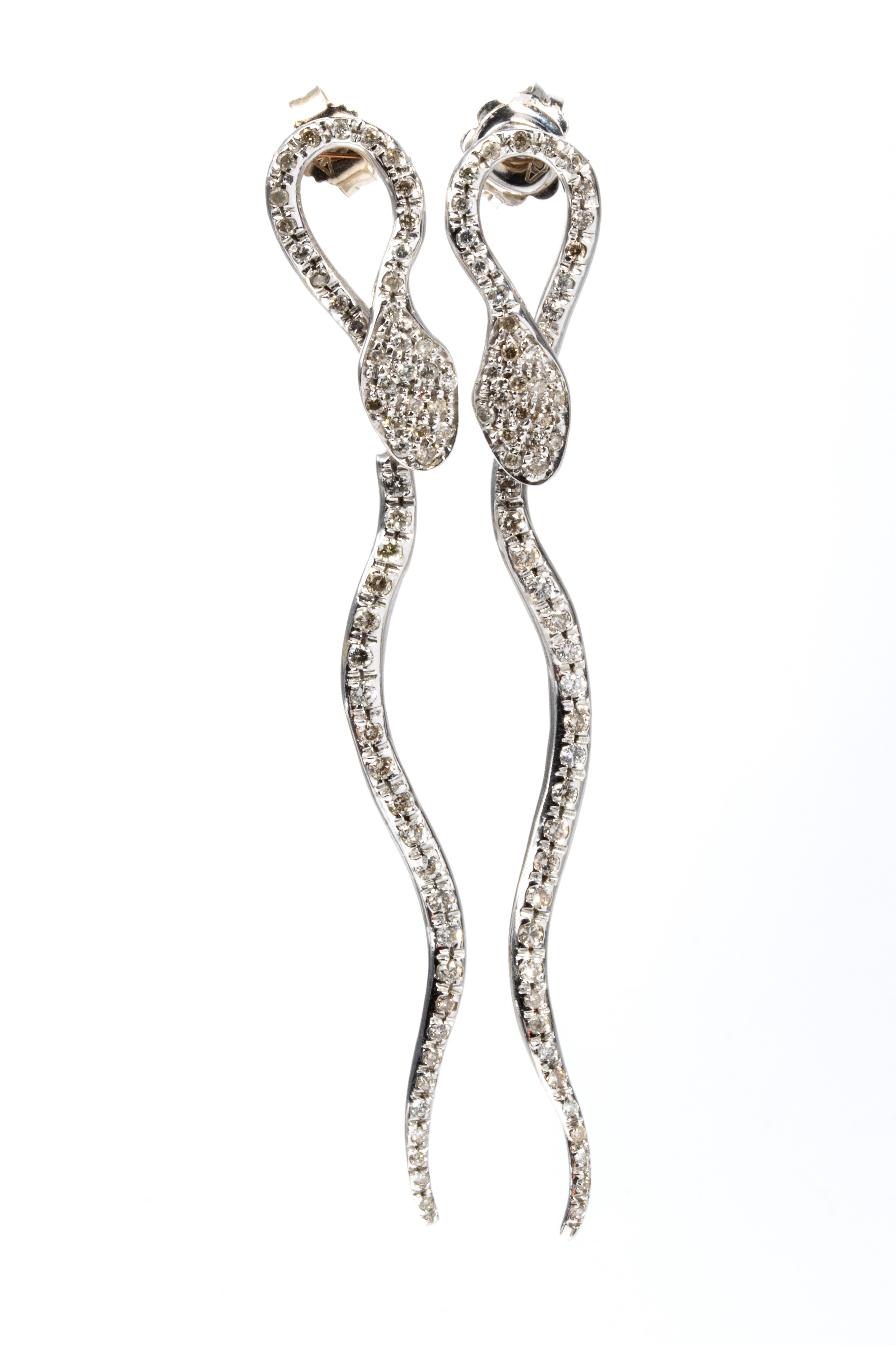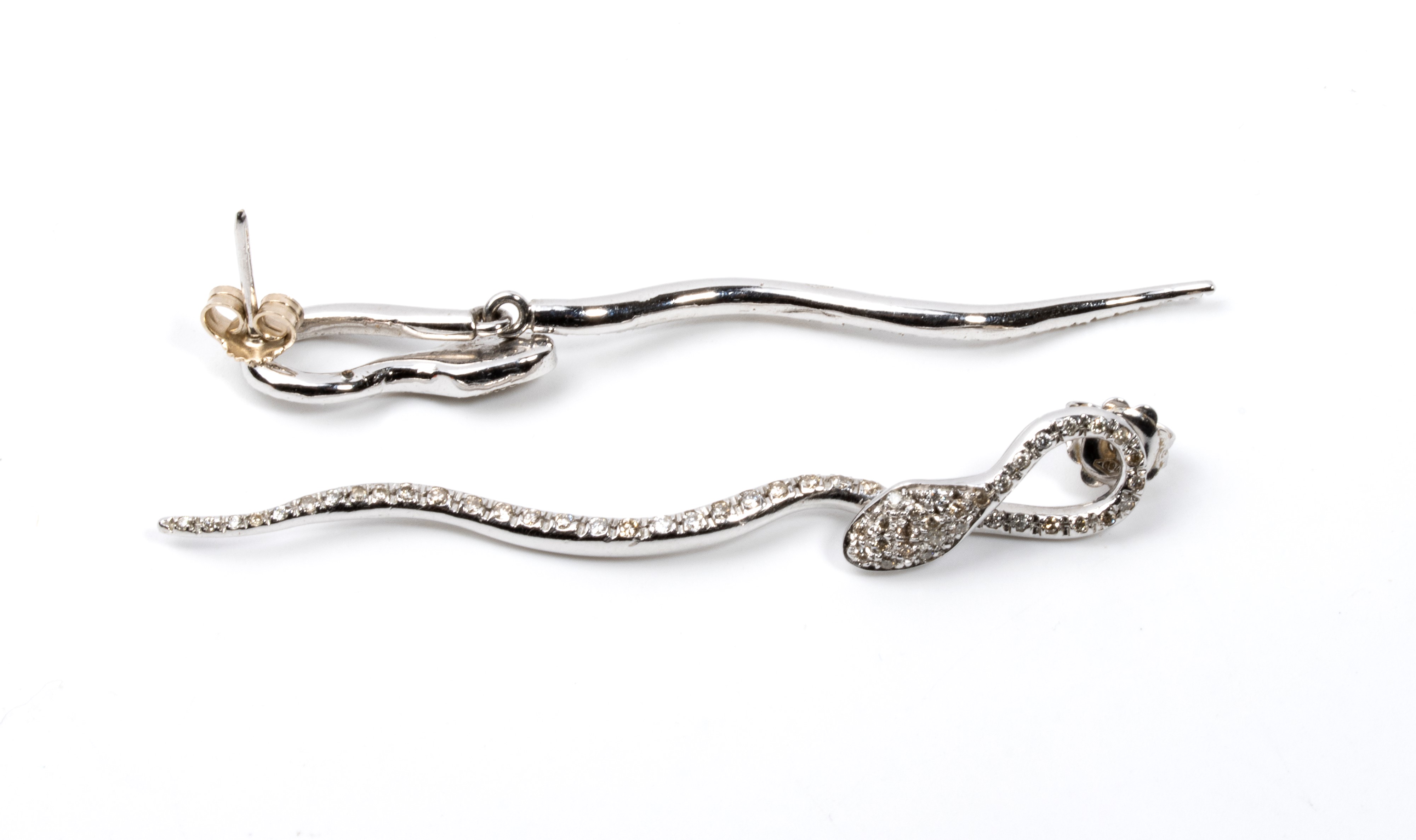 in oro bianco, ciascuno raffigurante un serpente, incatonato con pavé di diamanti di forma rotonda, taglio brillante, stimati per un peso totale di circa 1.15 ct, colore H-I, purezza SI, come misurati e classificati nella montatura.