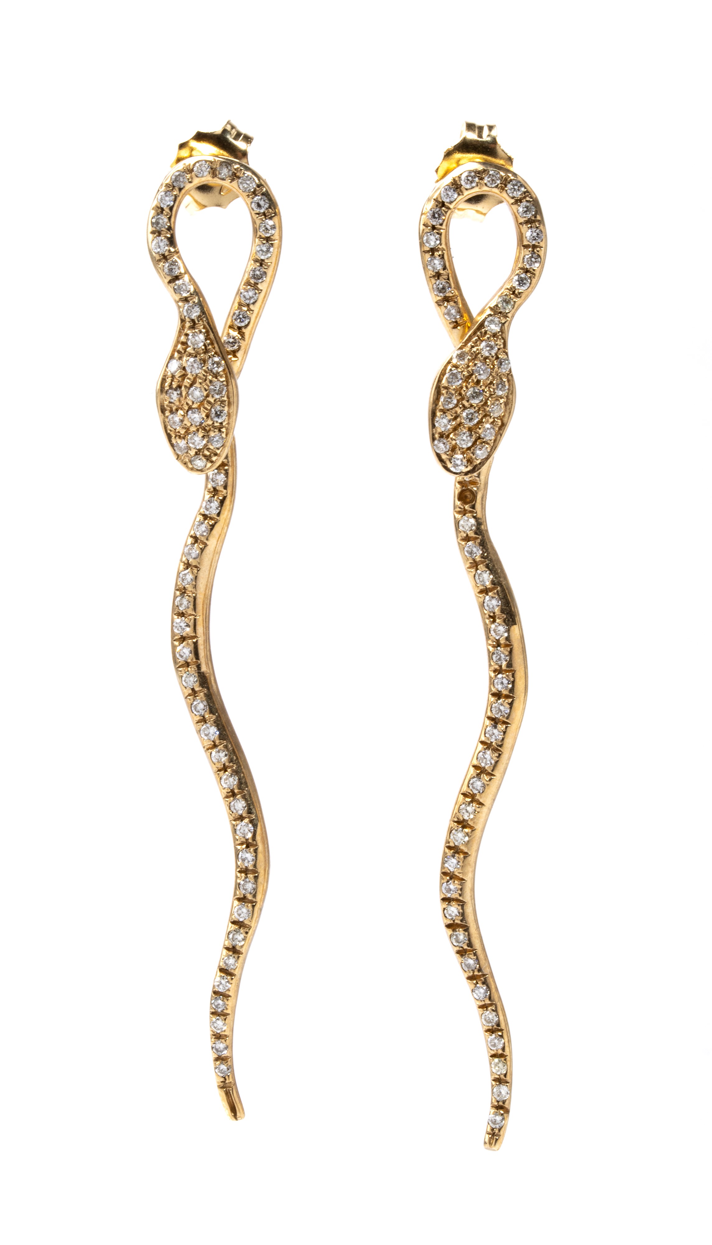 in oro giallo, ciascuno con con motivo sinuoso che simula il movimento del serpente, interamente decorati con pavé di diamanti di forma rotonda, taglio brillante, stimati per un peso totale di circa 1.15 ct, colore H, purezza VS- SI, come misurati e classificati nella montatura.