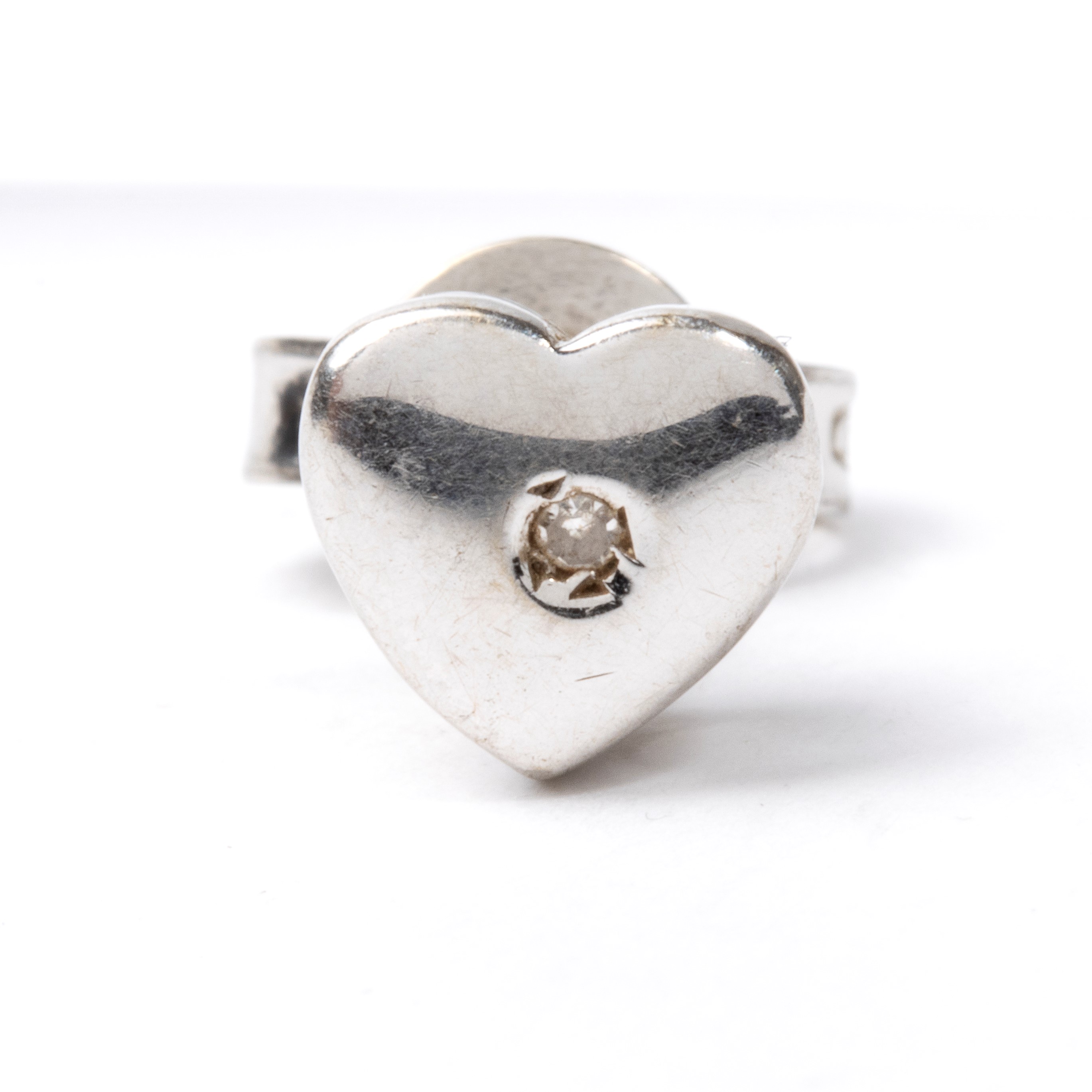in oro bianco, raffigurante la sagoma stilizzata di un cuore, impreziosita da un piccolo diamante per un peso di circa 0.01 ct.