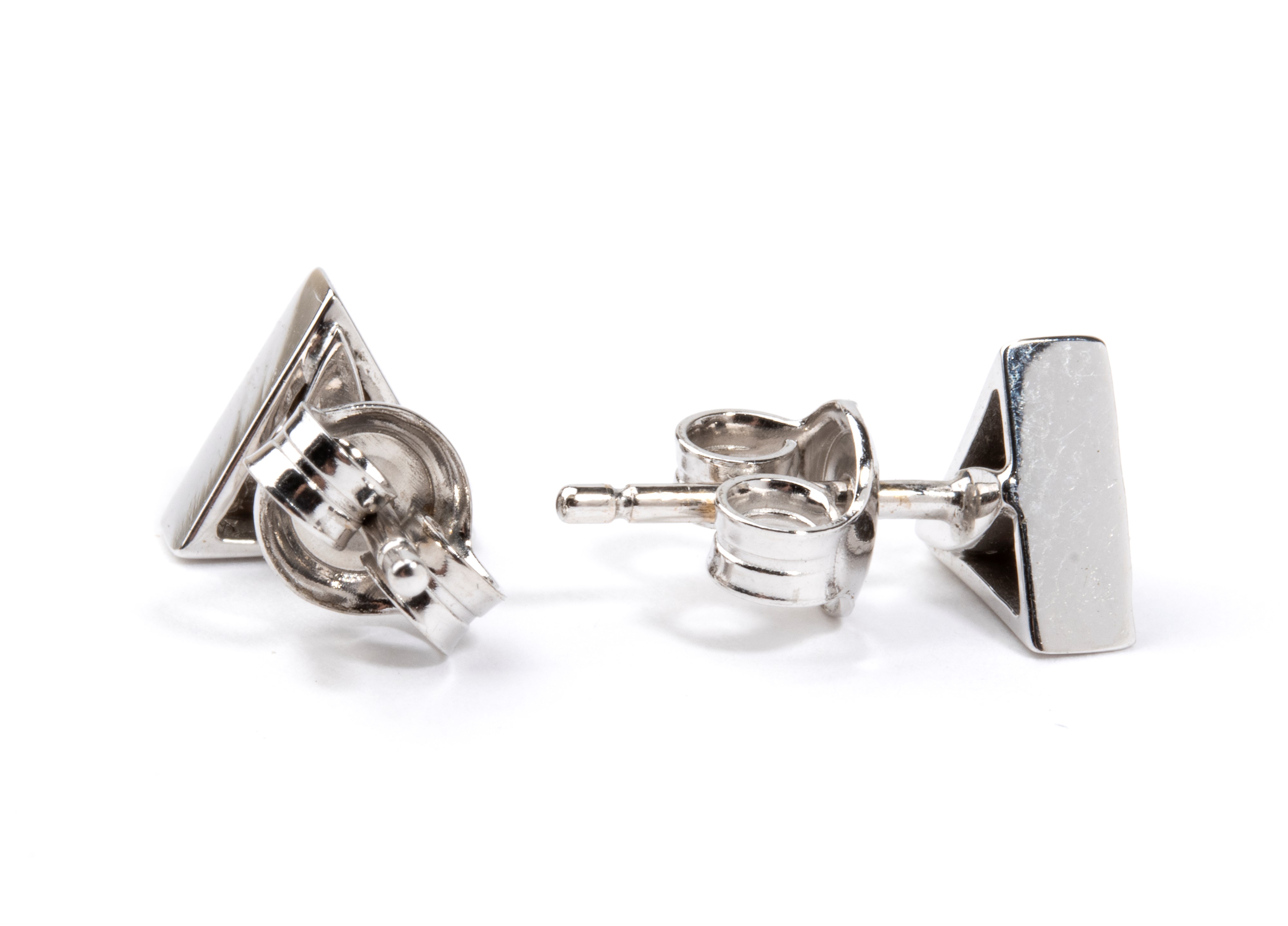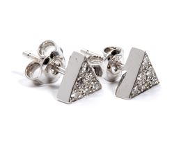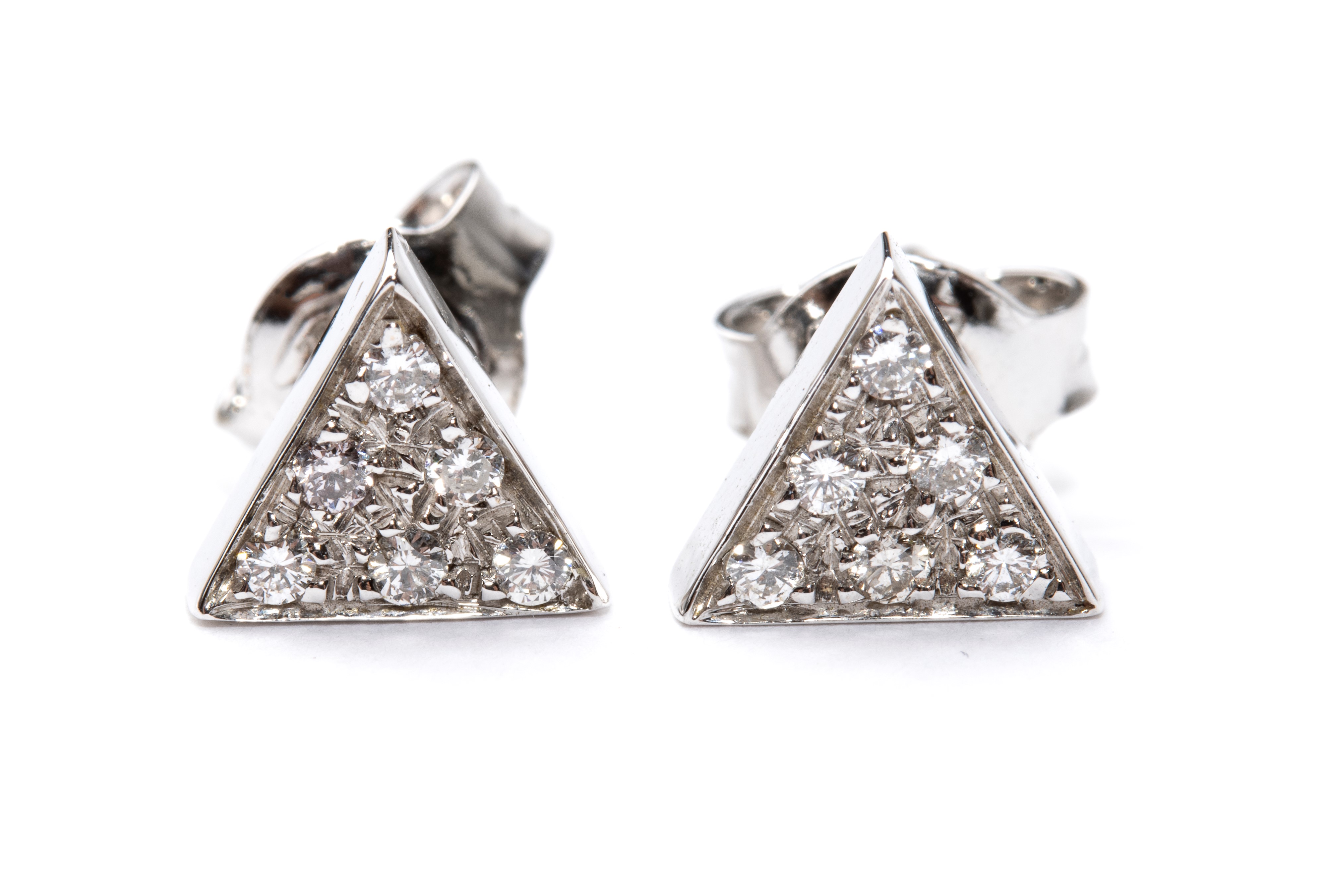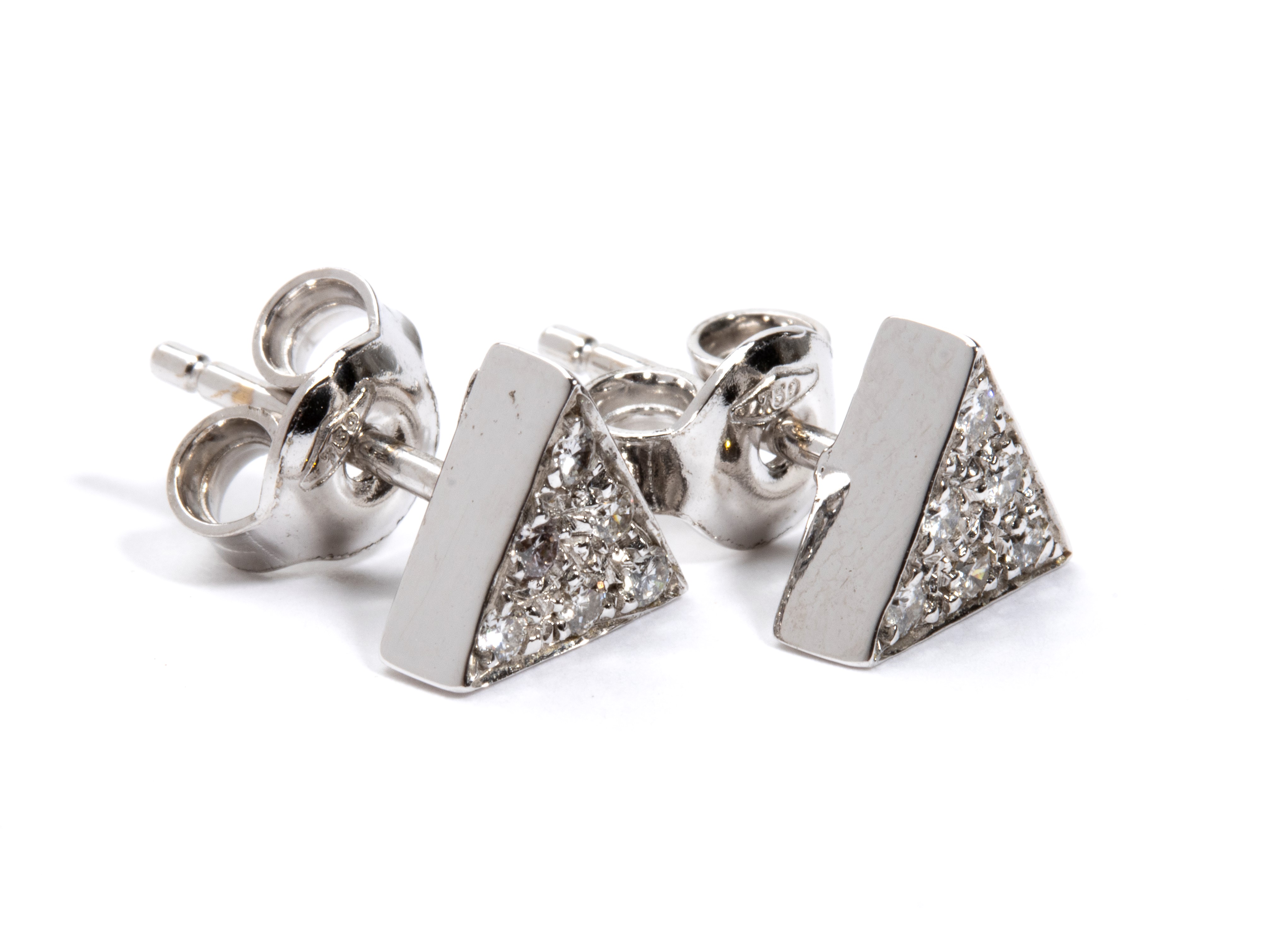 di forma triangolare in oro bianco 18k, incastonati con pavé di diamanti di forma rotonda, taglio brillante, stimati per un peso totale di circa 0.12 ct, colore G-H, purezza VVS-VS, come misurati e classificati nella montatura.