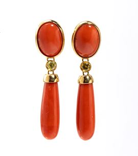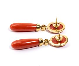 Paio di orecchini pendenti in oro e corallo cerasuolo