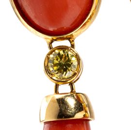in oro giallo, con cabochon e goccia pendente in corallo cerasulo (Corallium Elatius).