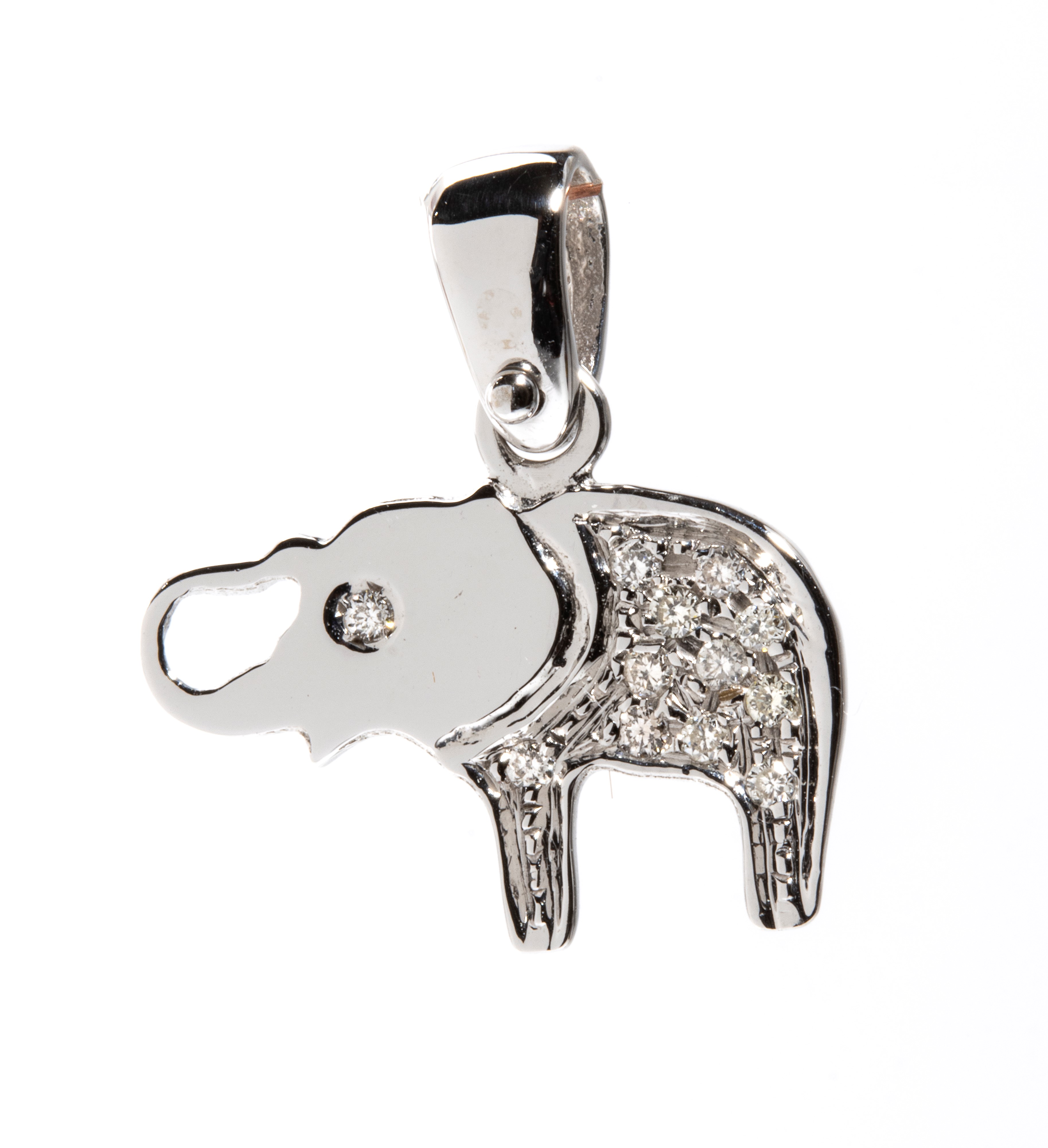 in oro bianco 18k, raffigurante la sagoma stilizzata di un elefante impreziosito da pavé di diamanti rotondi, taglio brillante, stimati per un peso totale di circa 0.05 ct.