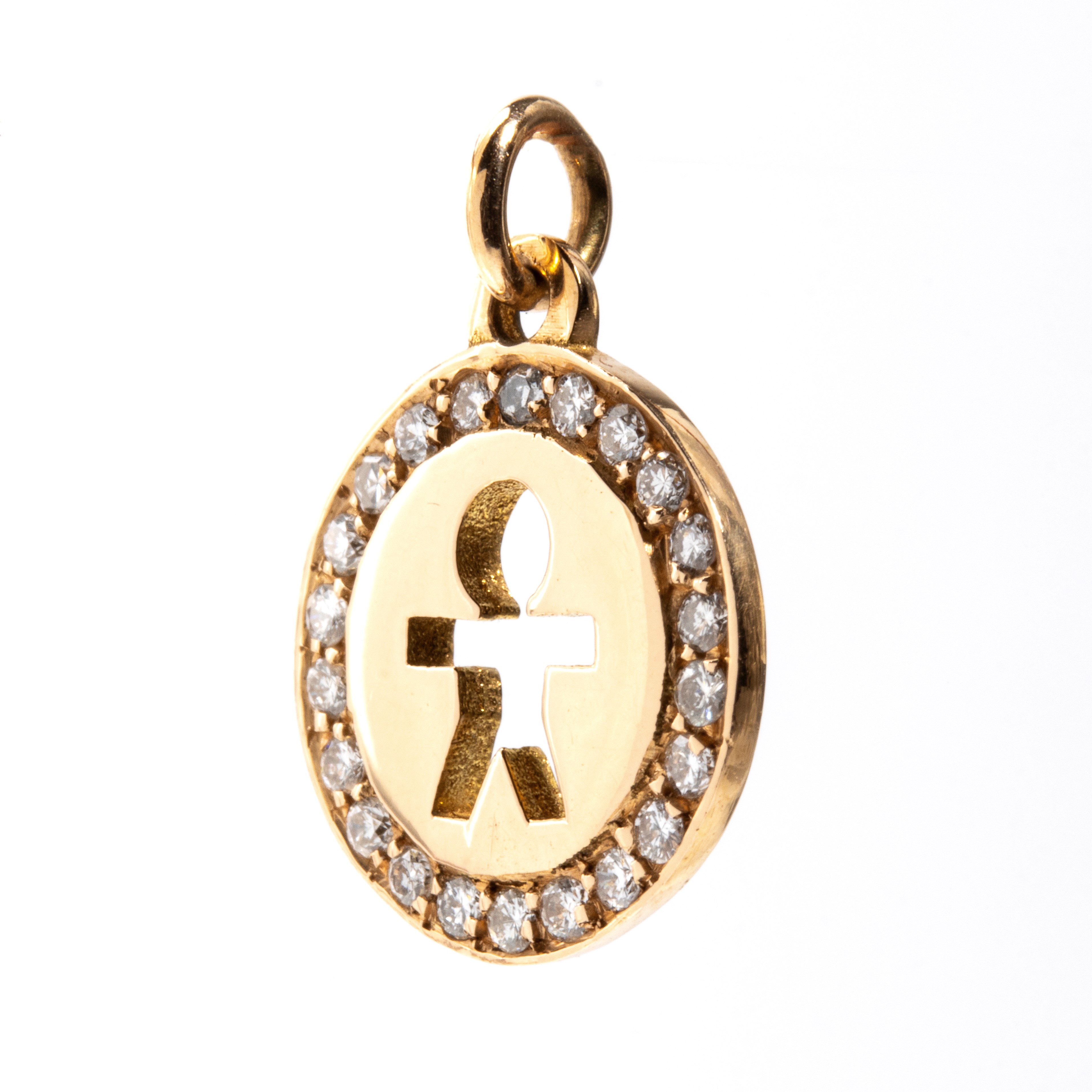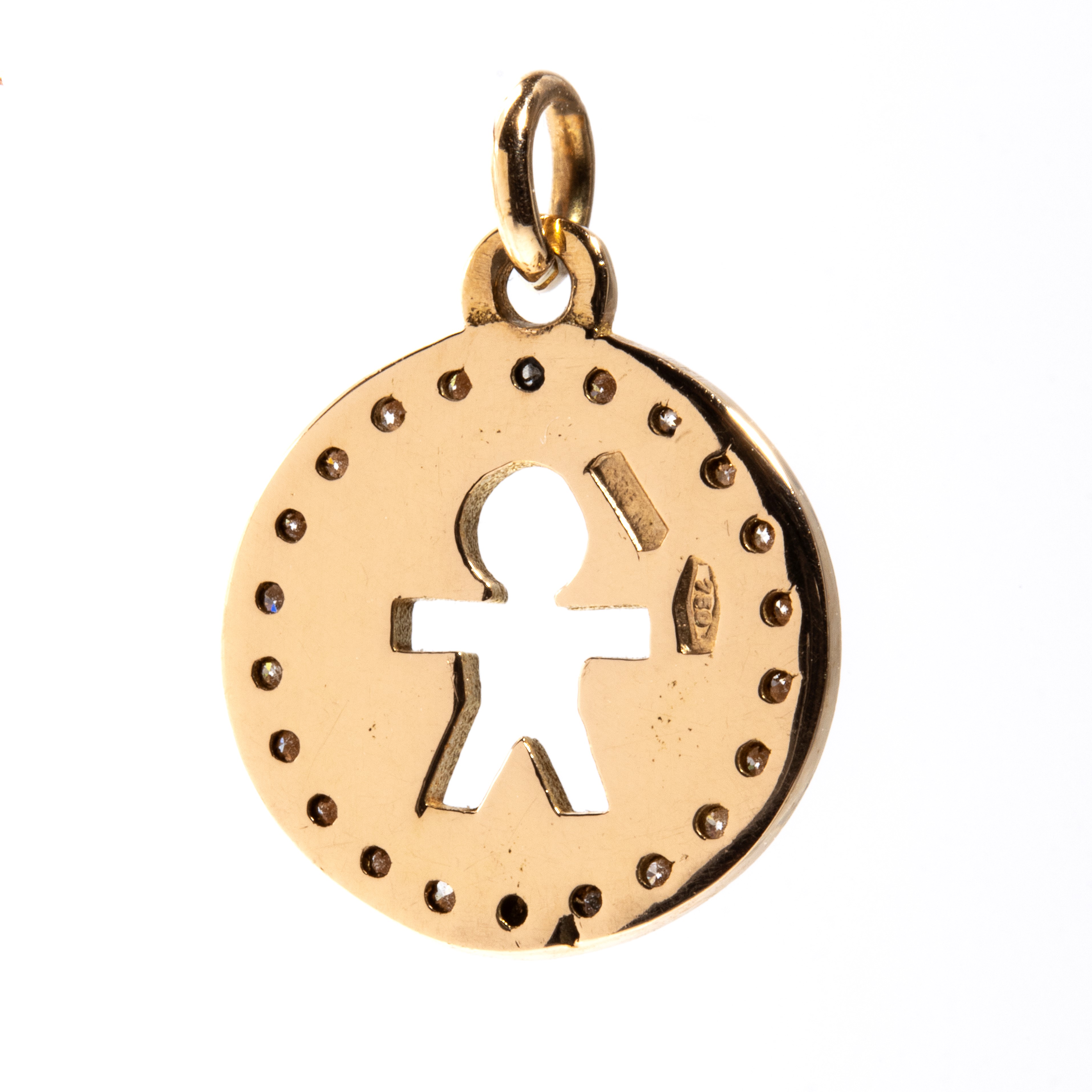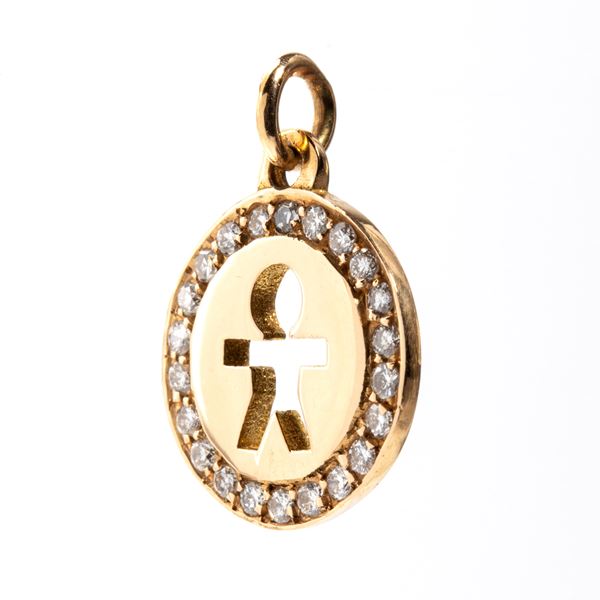 in oro giallo 18k, di forma rotonda, traforata raffigurante la sagoma stilizzata di un bambino incorniciato da diamanti di forma rotonda, taglio brillante, stimati per un peso totale di circa 0.16 ct, colore H, purezza VS-SI, come misurati e classificati nella montatura.