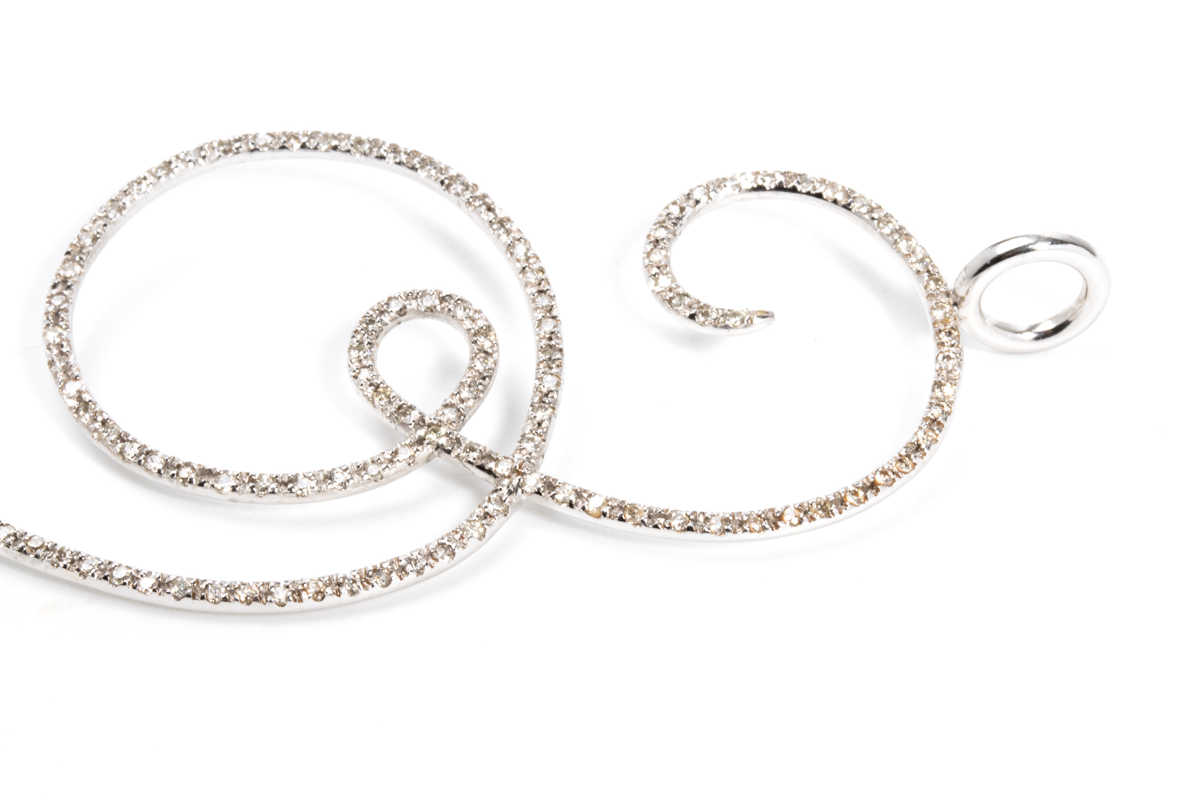 in oro bianco 18k, disegno ad intreccio con linee fluide e curve, impreziosito da pavé di diamanti di forma rotonda, taglio brillante, stimati per un peso totale di circa 1.65 ct, colore H-I, purezza SI, come misurati e classificati nella montatura.