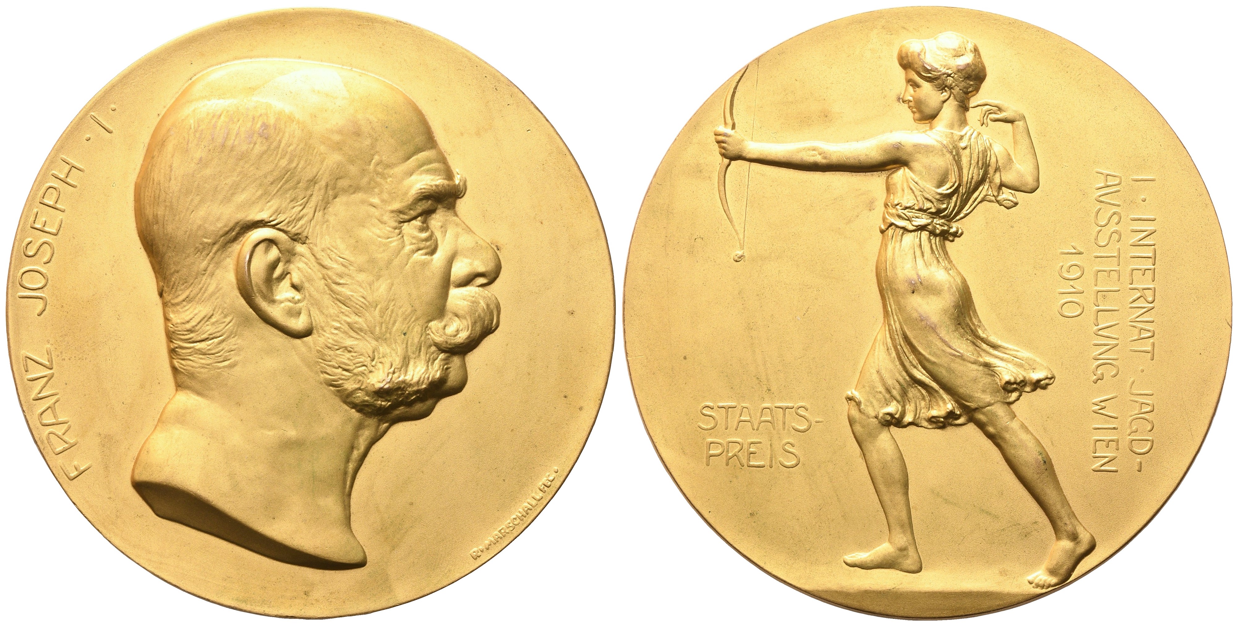 Opus: R.Marschall. FRANZ JOSEPH I Ritratto di Francesco Giuseppe rivolto a destra. In basso, R MARSCHALL FEC. Rv. Diana con arco rivolta a sinistra. Contorno: trifoglio con lettere B S (Brüder Schneider) inscritte in due lobi. Hauser 3131. RR. Eccezionale medaglia di grande rarità e finezza artistica; in ottimo stato di conservazione.