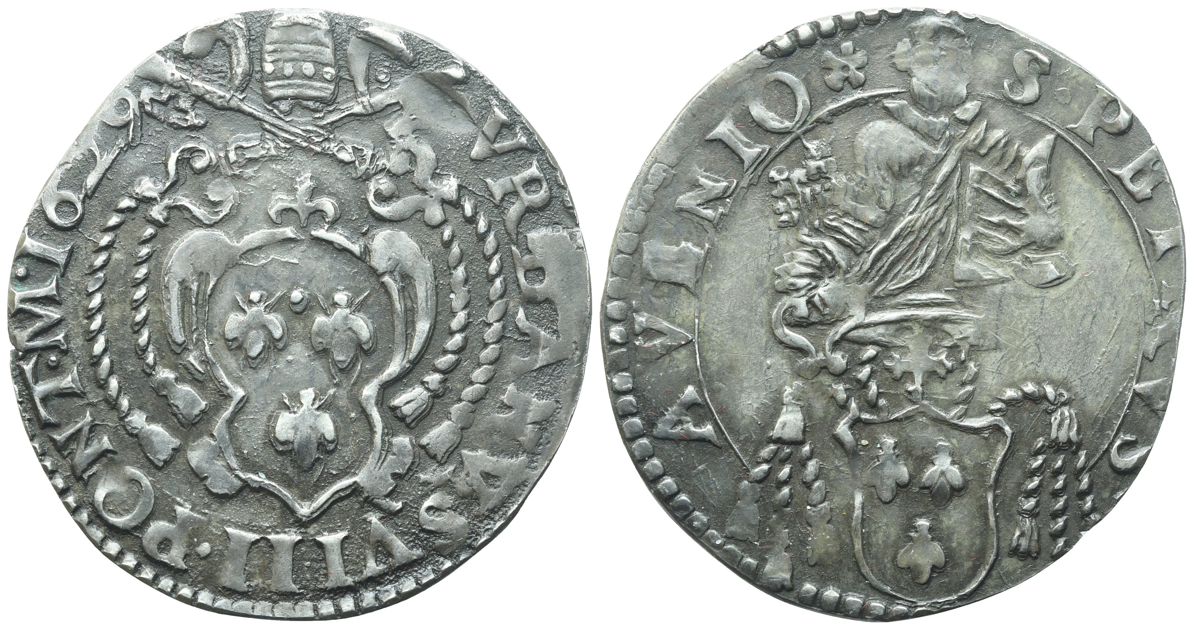 VRBANVS VIII PONT M 1629 Stemma sormontata da tiara e chiavi decussate. Rv. S PETRVS AVENIO Stemma Barberini sormontato da mezzo busto di San Pietro. Munt. 220; Berm. 1796. Raro. BB+