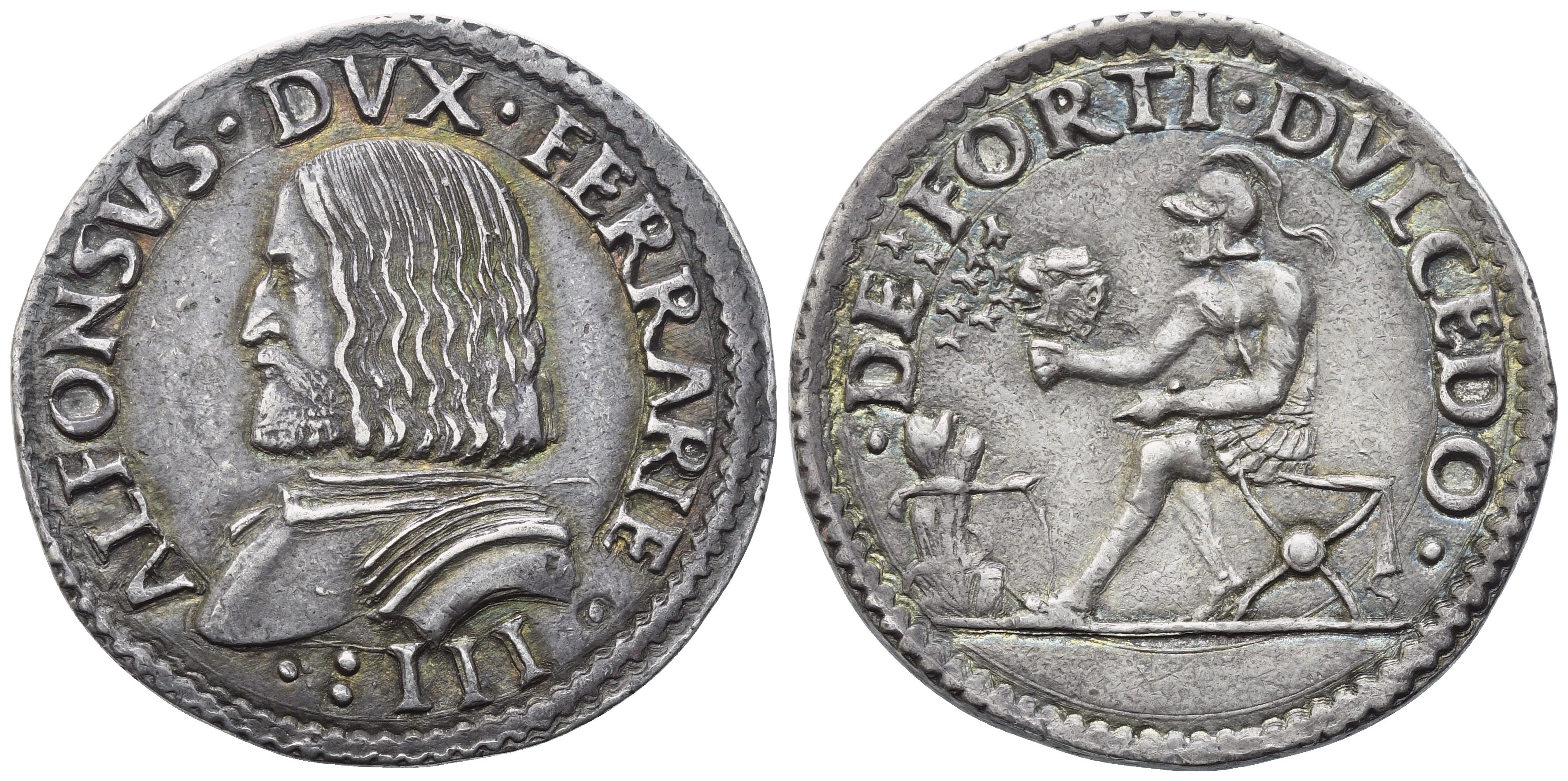 ALFONSVS DVX FERRARIE III Busto barbato corazzato del duca a sinistra. Rv. DE FORTI DVLCEDO Sansone, elmato, siede su sgabello verso s. e regge testa di leone dalla cui bocca fuoriescono api. In basso a sinistra, serpe attorno a tronco. RMM 4 var. CNI 26 var. MIR 271 var. Molto raro. Splendida patina di antica collezione. SPL+