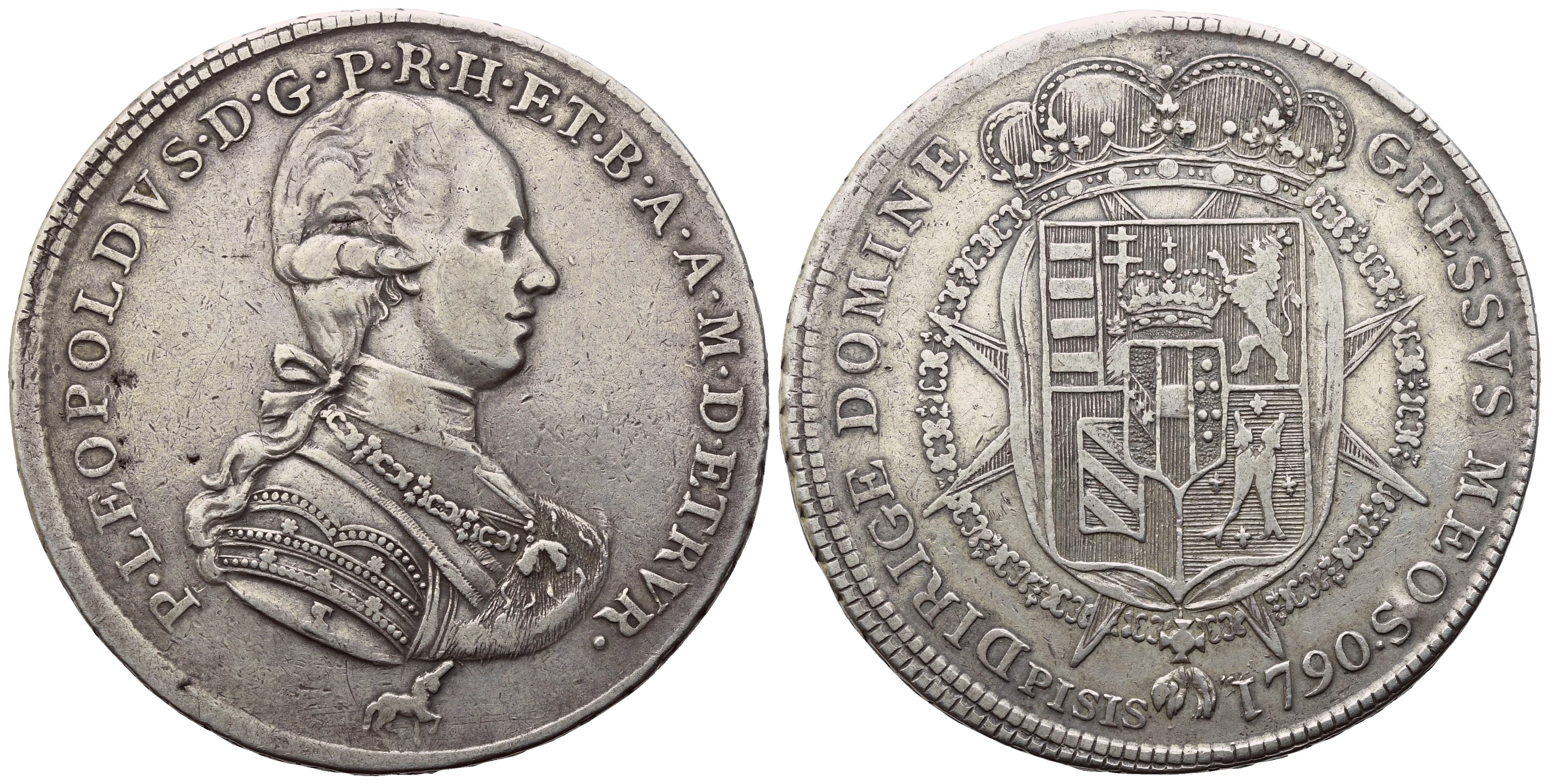 P LEOPOLDVS D G P R H ET B A A M D [ETRV]R Busto corazzato, a destra, con Collare del Toson d'Oro e Croce di Santo Stefano sul petto; nel taglio del braccio, L·S·F· (Luigi Siries, incisore); sotto, nel giro, unicorno (Francesco Grobert, zecchiere). Rv. DIRIGE DOMINE - GRESSVS MEOS. Stemma coronato circondato dal Collare del Toson d'Oro e caricato su Croce di Santo Stefano; sotto, PISIS - 1790. MIR 385/8. R3. BB+